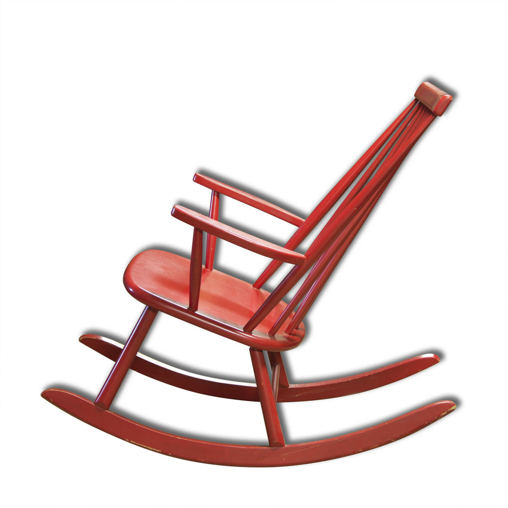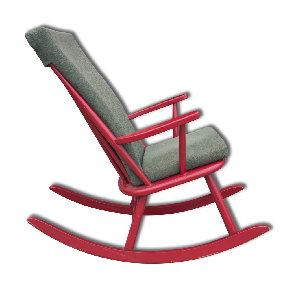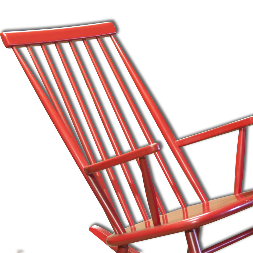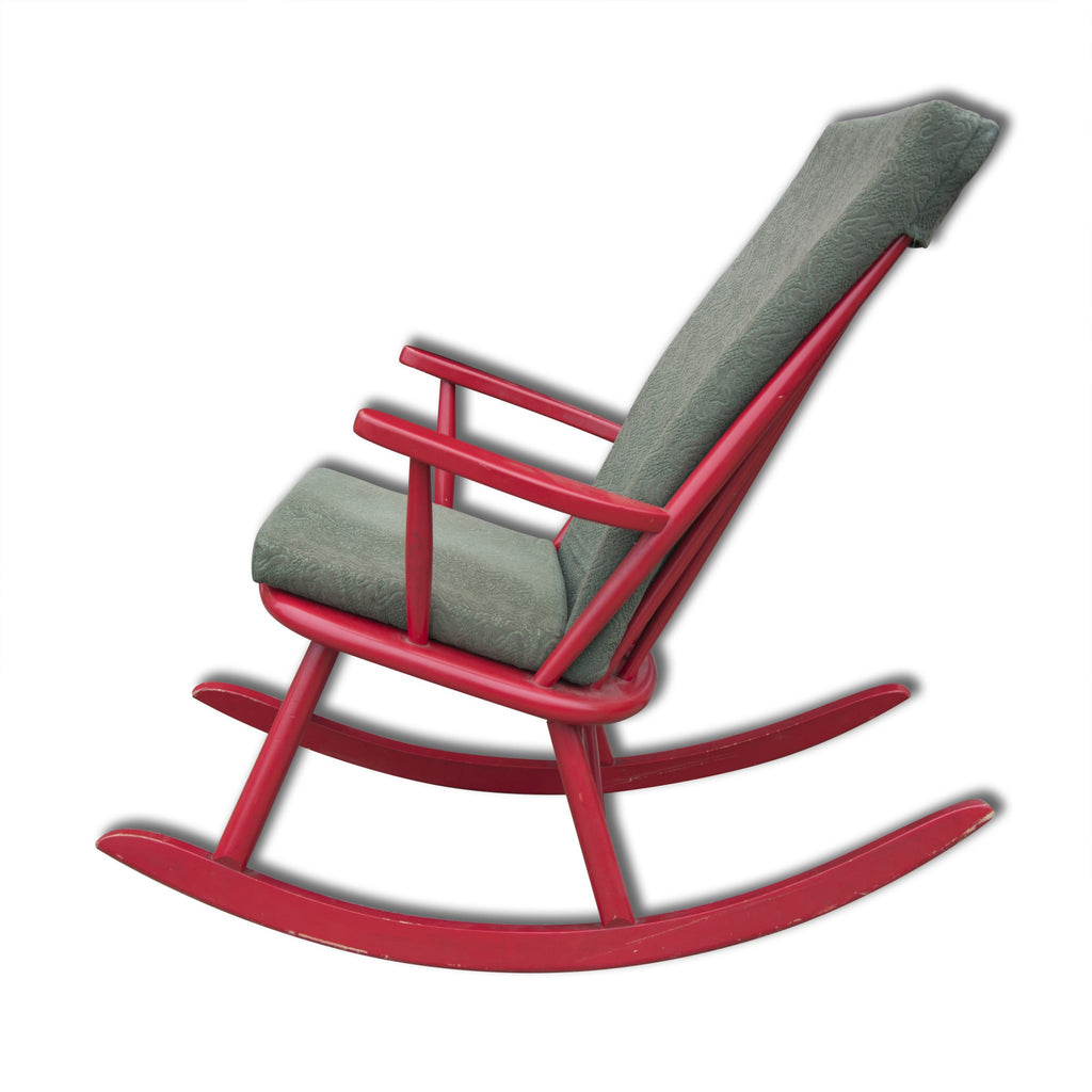 Mid-century Scandinavian rocking chair, 1950's. Beech wood, removable cushions. Red paint. In very good Vintage condition, bears some signs of use and age. The chair reminds works by Ilmari Tapiovaara or Varjosen Puunjalostus.
