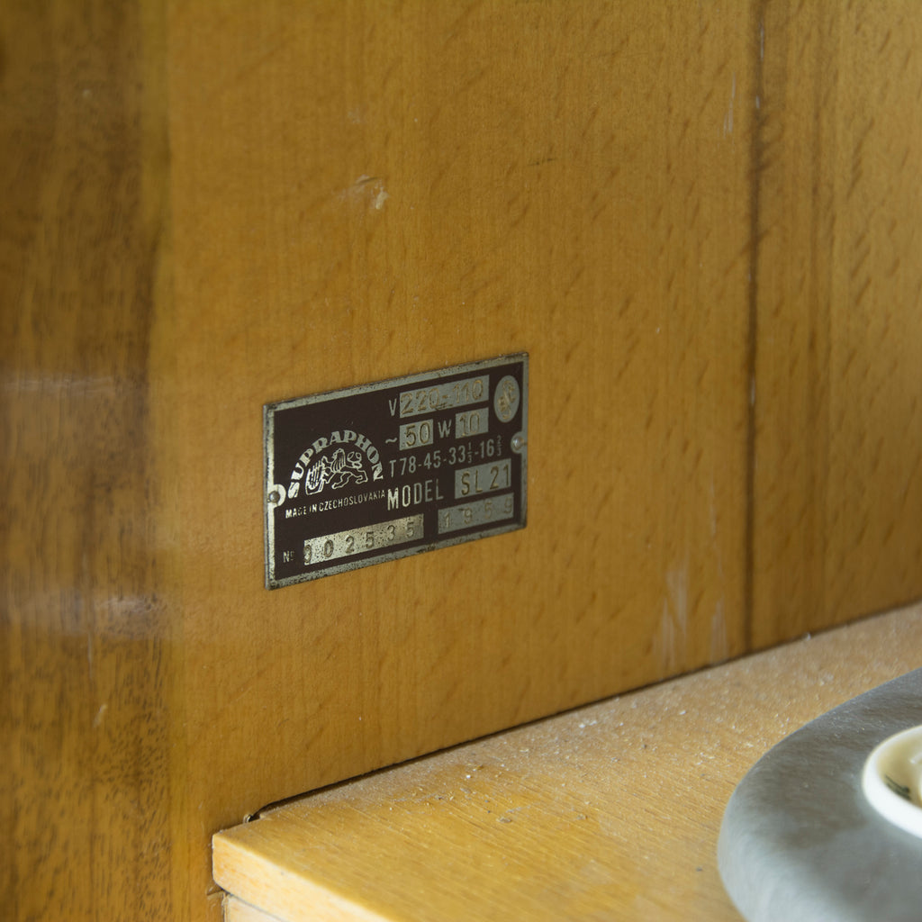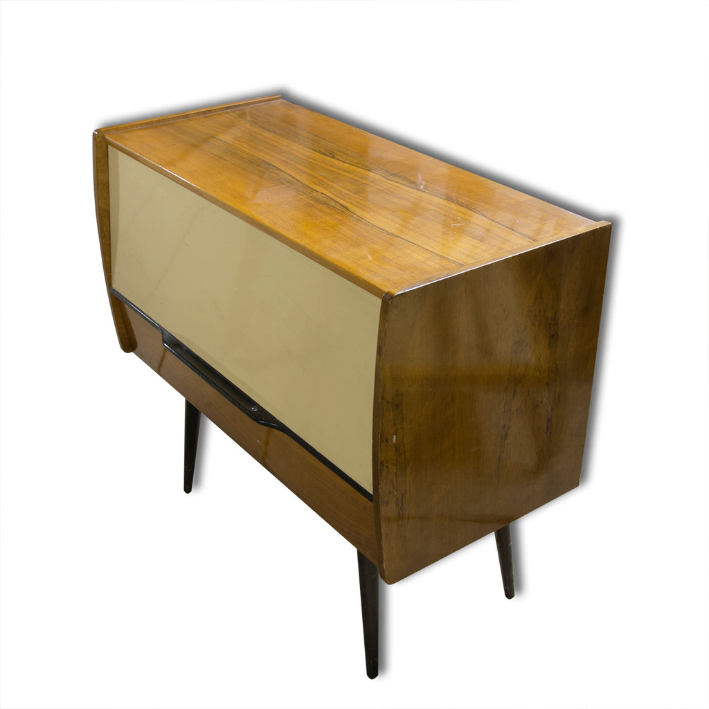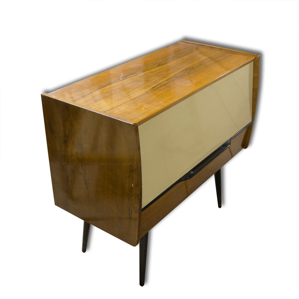 Very elegant design cabinet with a built gramophone. Produced by Supraphone in the 1960´s. Made in Czechoslovakia. Very well preserved condition. Polished veneer. The original wiring.