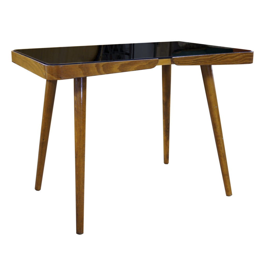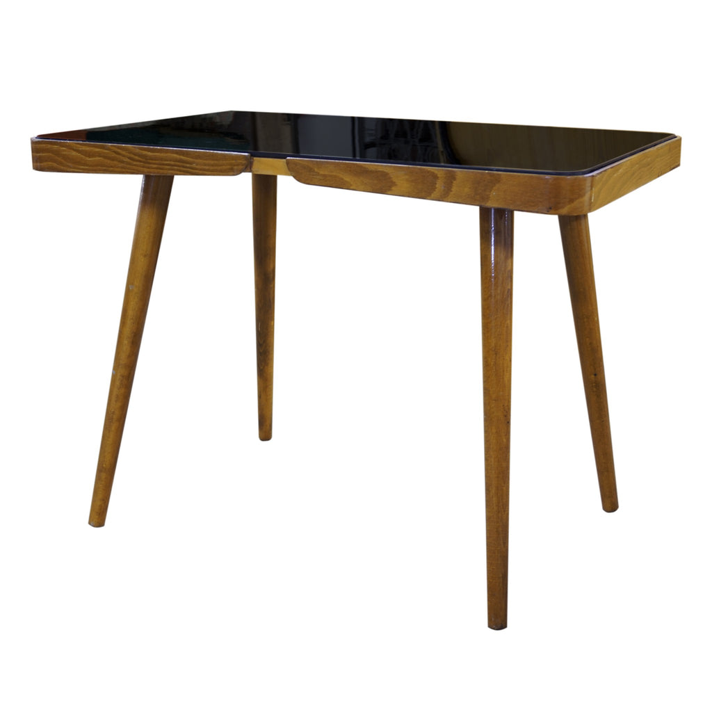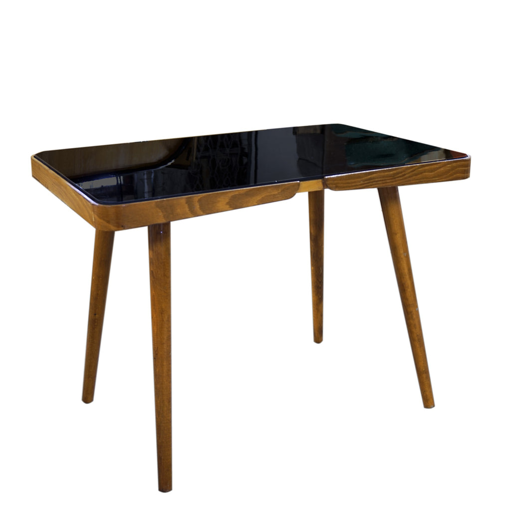 A luxury coffee table, it was made in the 1960´s. Associated with world-renowned exhibition EXPO 58 in Brussels. Beechwood. Black glass tabletop. In very well preserved condition. Height 56 cm, length 88 cm, width 50 cm.