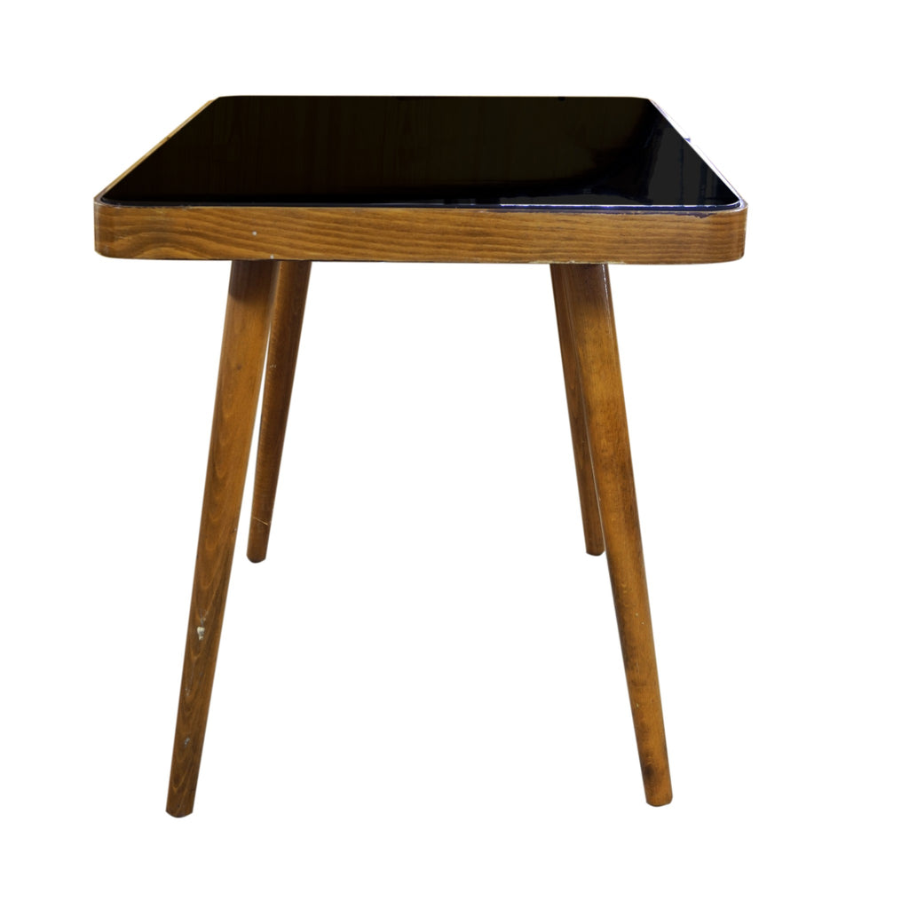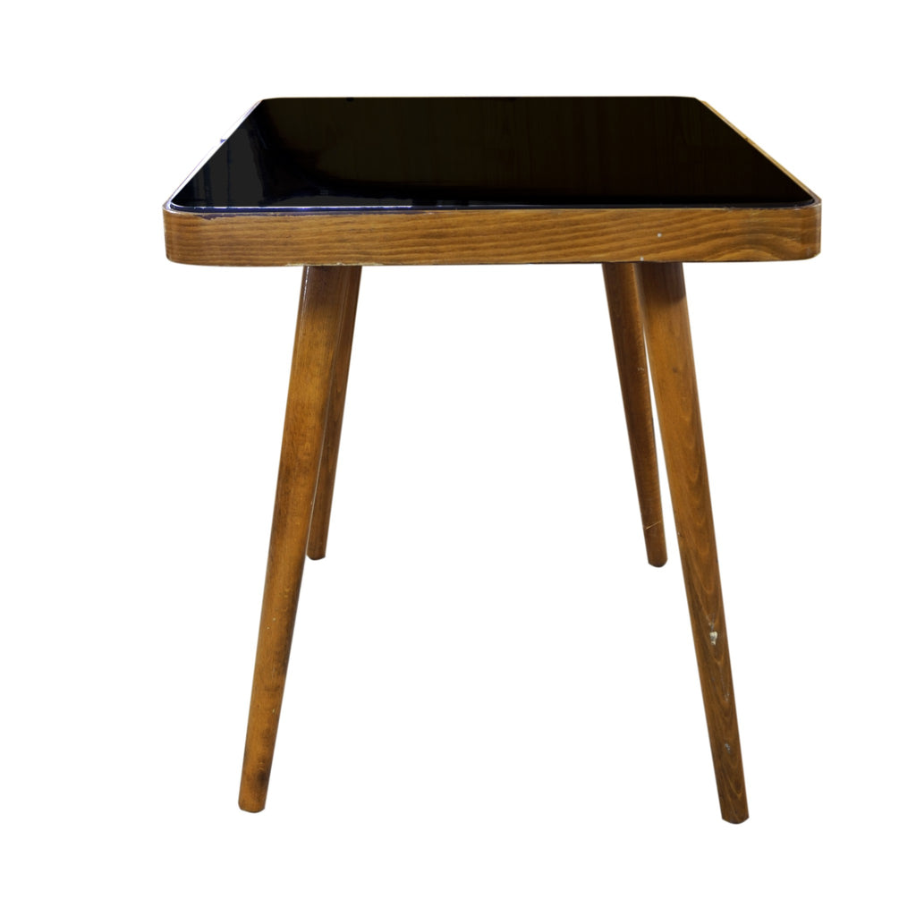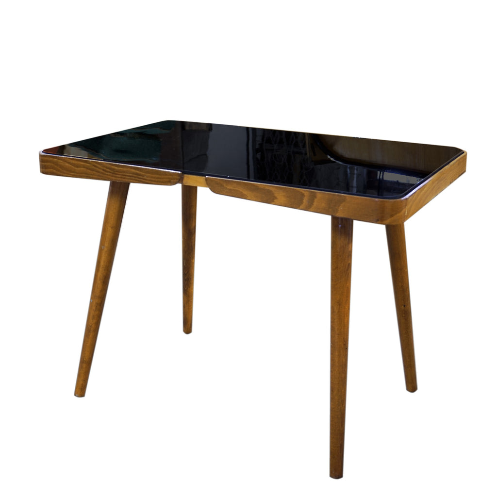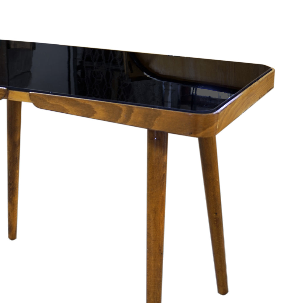 A luxury coffee table, it was made in the 1960´s. Associated with world-renowned exhibition EXPO 58 in Brussels. Beechwood. Black glass tabletop. In very well preserved condition. Height 56 cm, length 88 cm, width 50 cm.