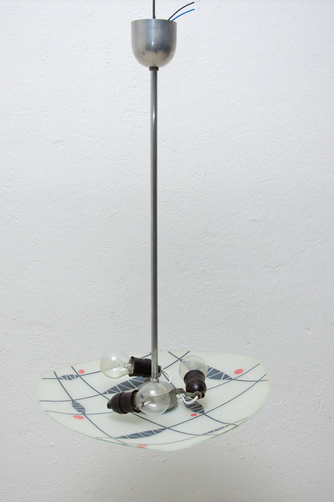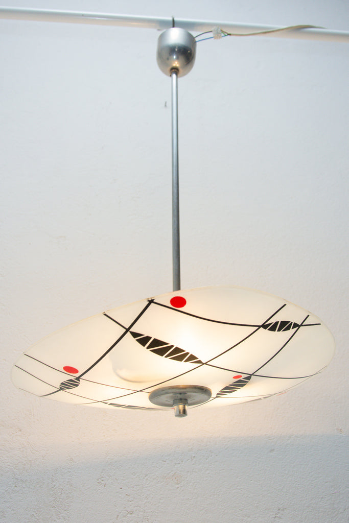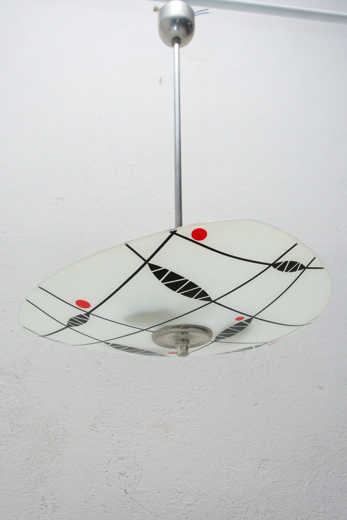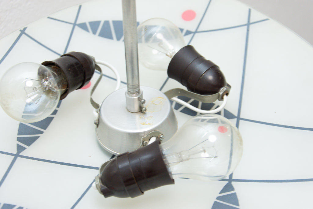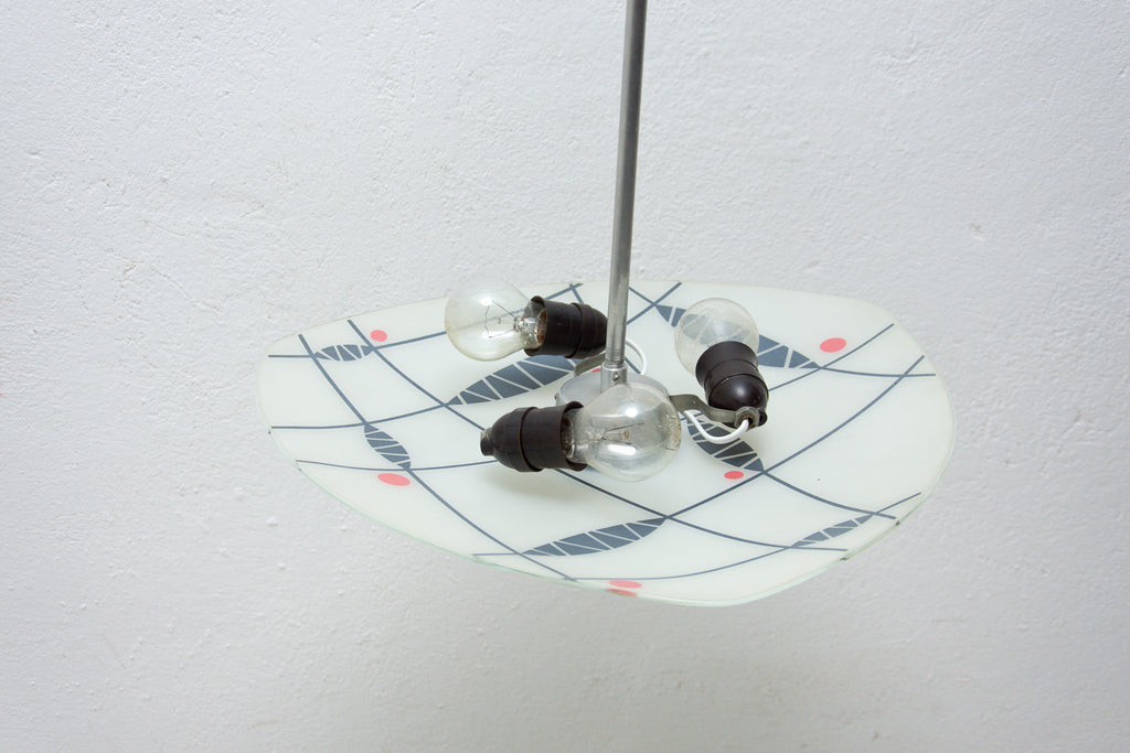 Mid century space age chandelier from the turn of the 50s and 60s connected with the exhibition EXPO 58 in Brussels. Awesome design. Painted motifs. Chrome-plated rod. In very good condition, new wiring.