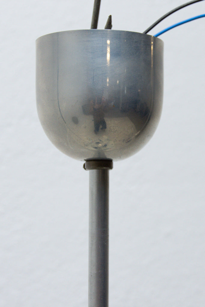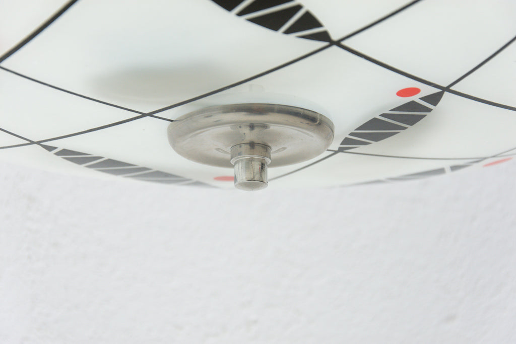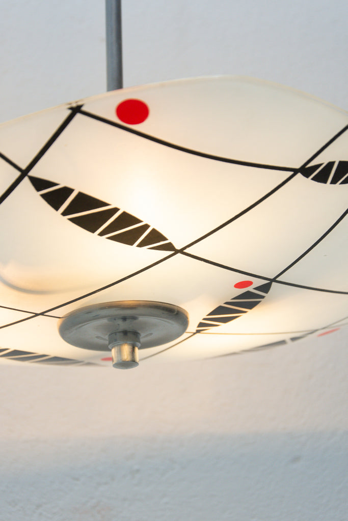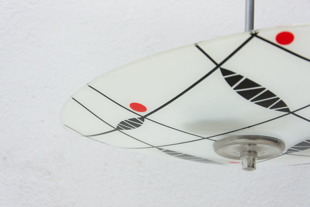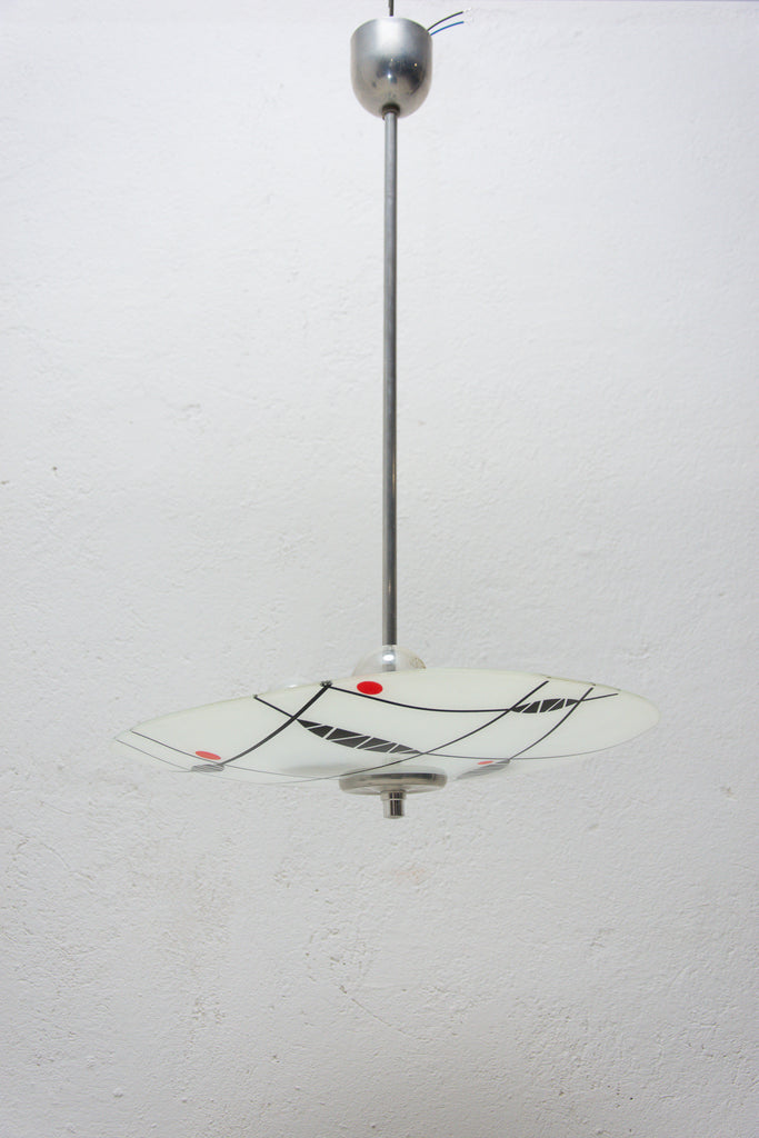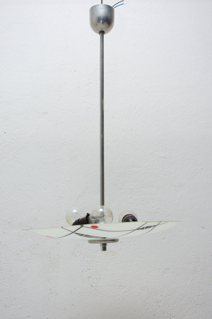 Mid century space age chandelier from the turn of the 50s and 60s connected with the exhibition EXPO 58 in Brussels. Awesome design. Painted motifs. Chrome-plated rod. In very good condition, new wiring.