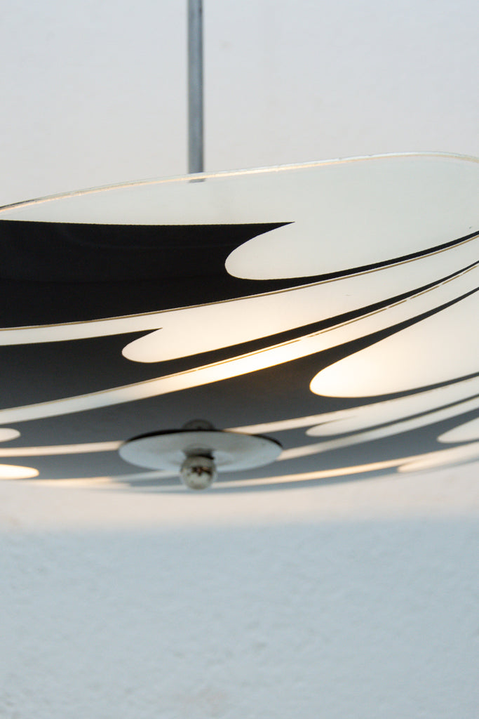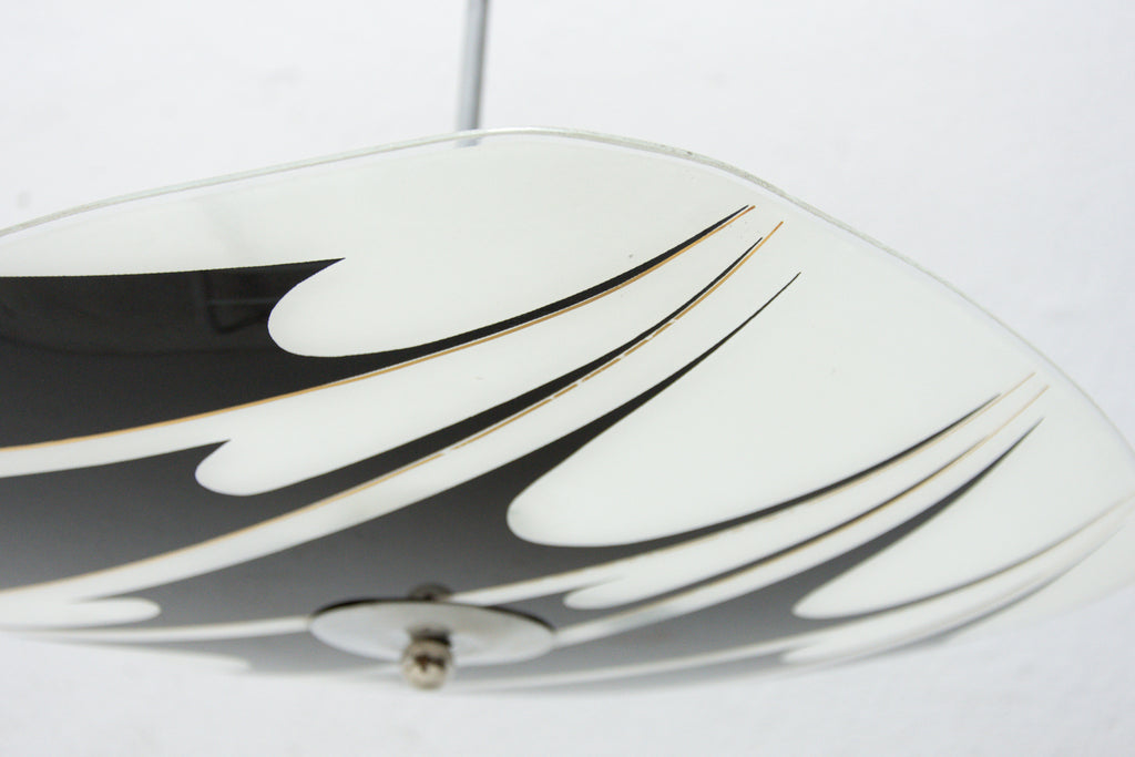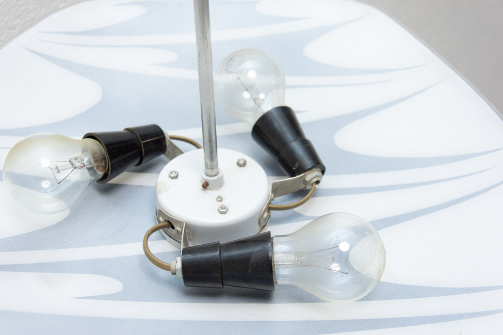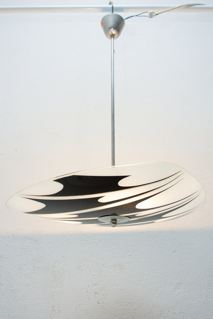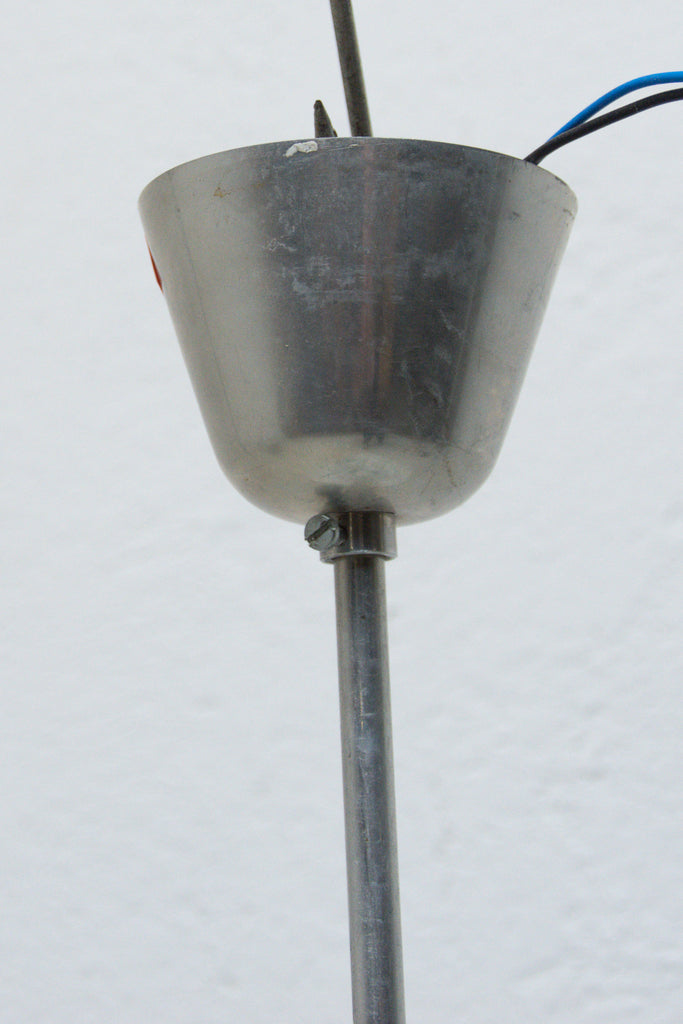 Mid century space age chandelier from the turn of the 50s and 60s connected with the exhibition EXPO 58 in Brussels. Awesome design. Painted motifs. Chrome-plated rod. In very good condition, new wiring.
