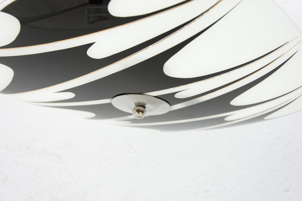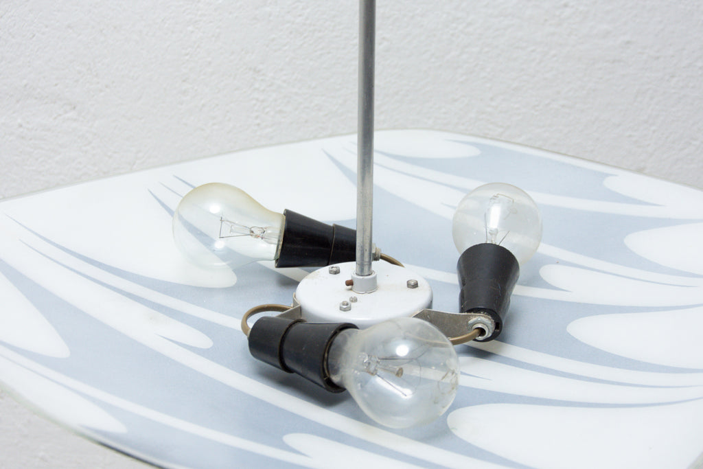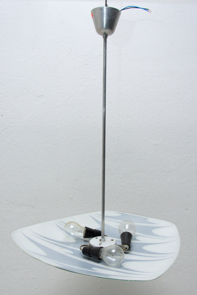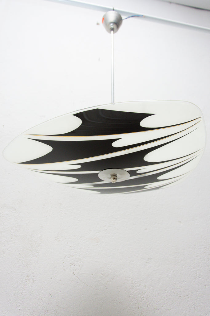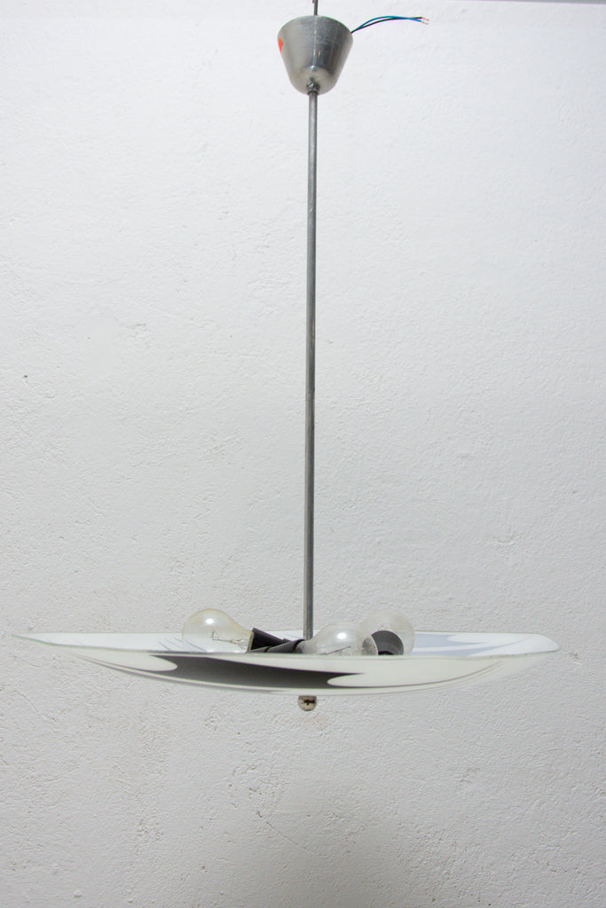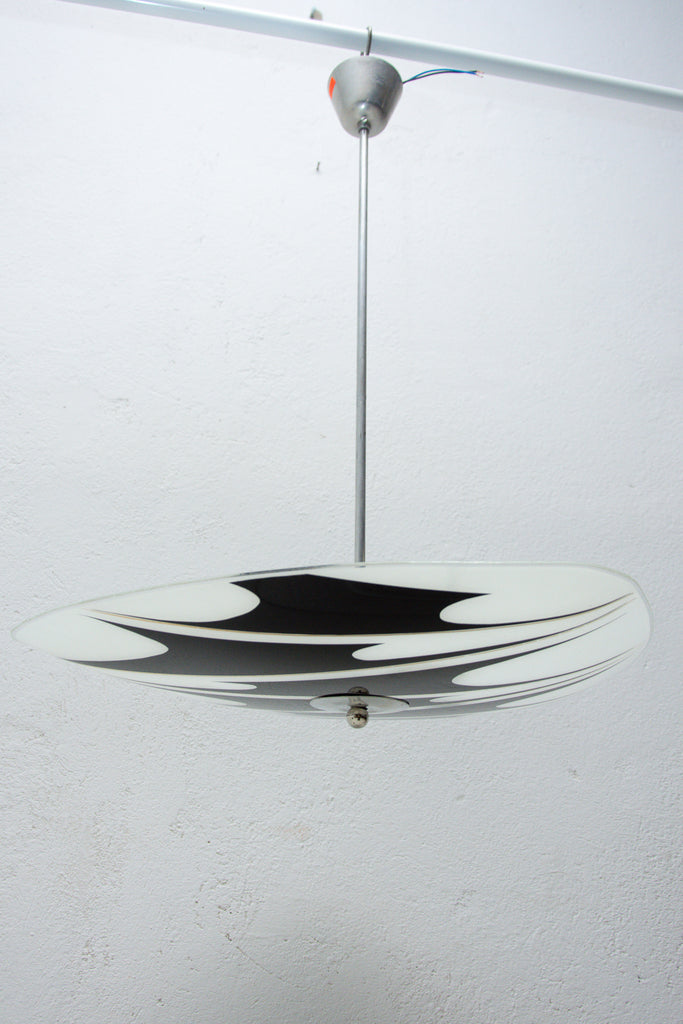Mid century space age chandelier from the turn of the 50s and 60s connected with the exhibition EXPO 58 in Brussels. Awesome design. Painted motifs. Chrome-plated rod. In very good condition, new wiring.