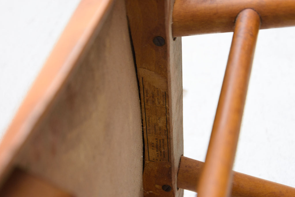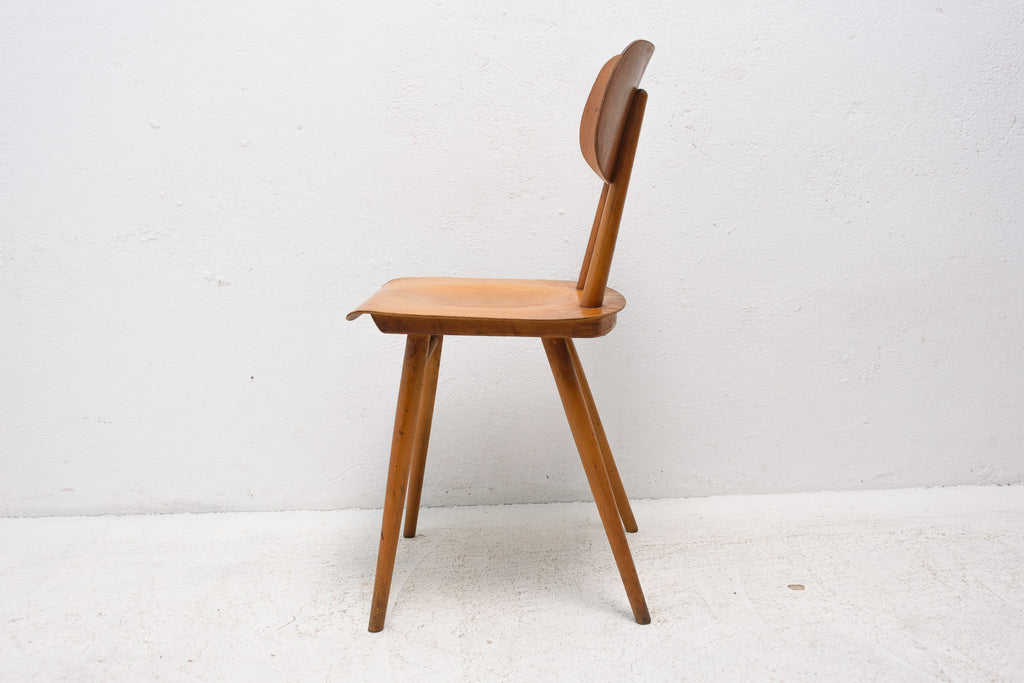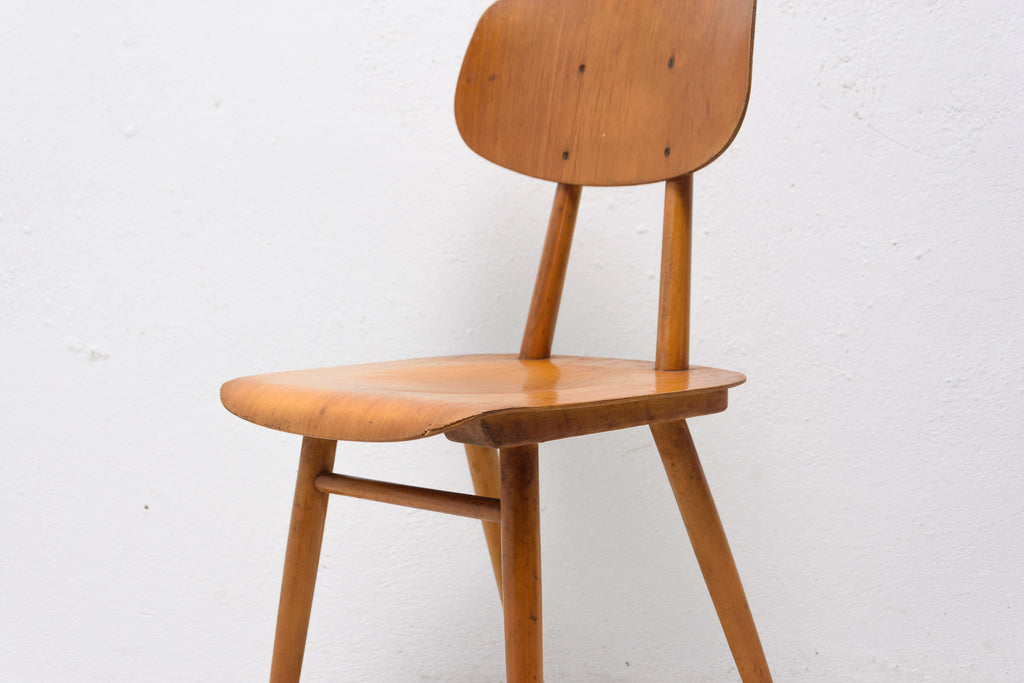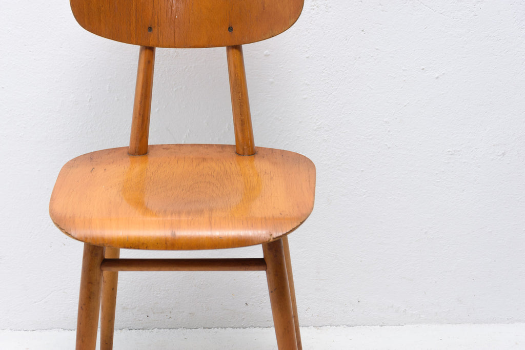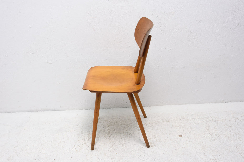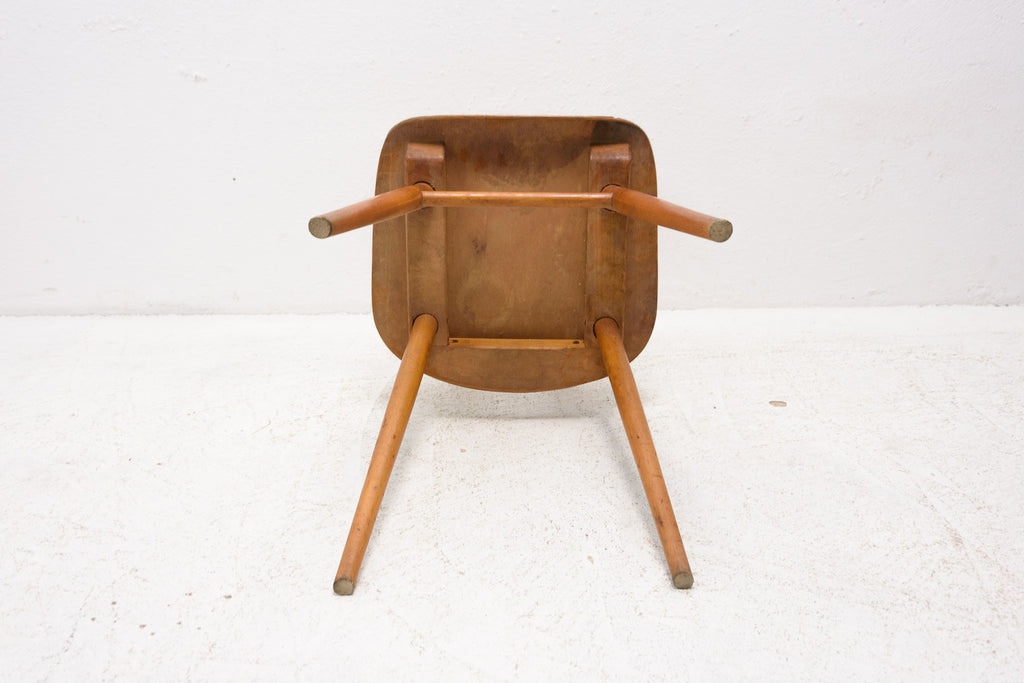 Set of four patinated dining chairs from the 1960´s. It was produced by TON, Czechoslovakia. The TON company was established as successor to the famous Thonet after World War II in Czechoslovakia and continued the production of bentwood furniture. It features a beechwood construction and lacquered seats and backrests. The chairs are in good Vintage condition. Very interesting model