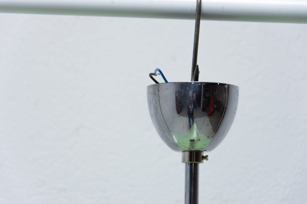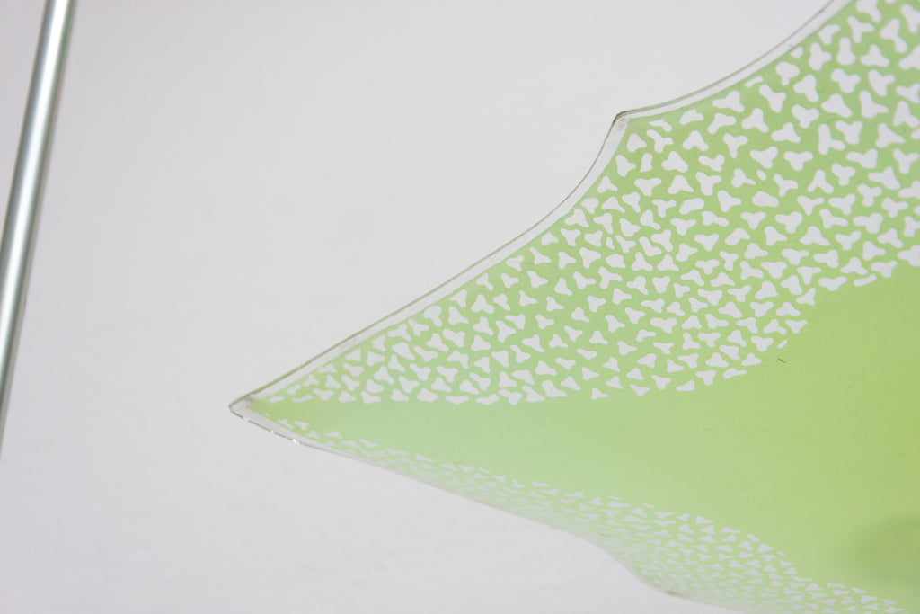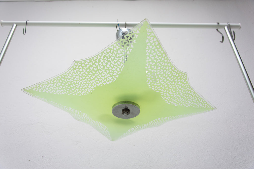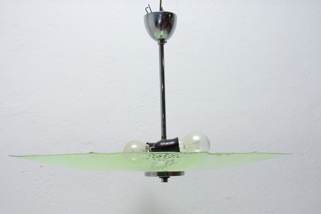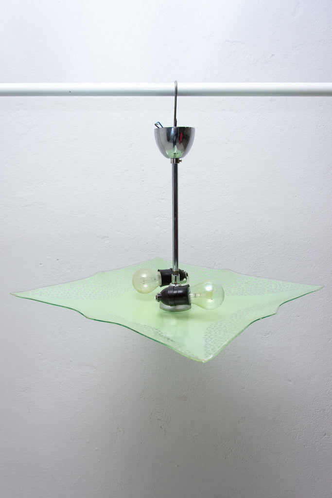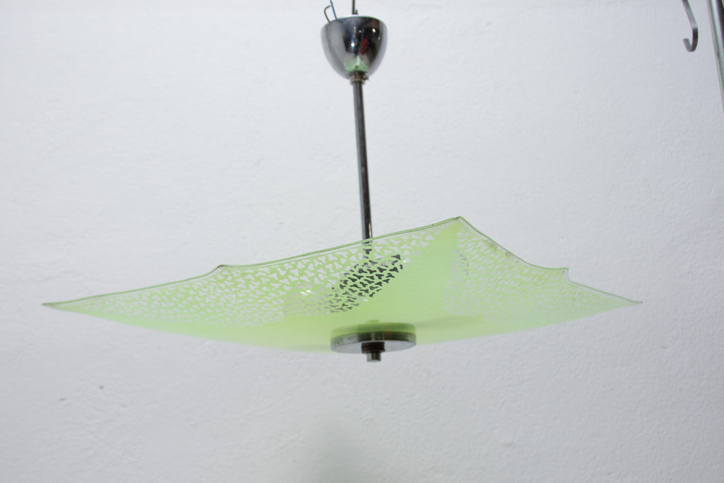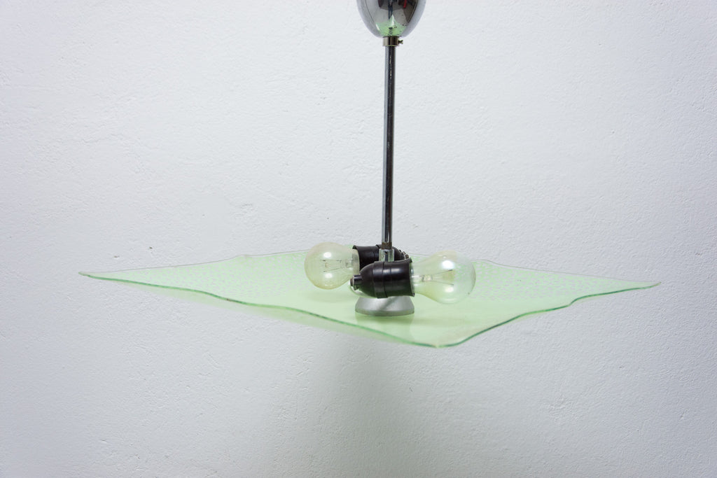 Mid century pendant from the turn of the 50s and 60s connected with the exhibition EXPO 58 in Brussels. Awesome design. Painted motifs. Chrome-plated rod. In very good condition, new wiring.