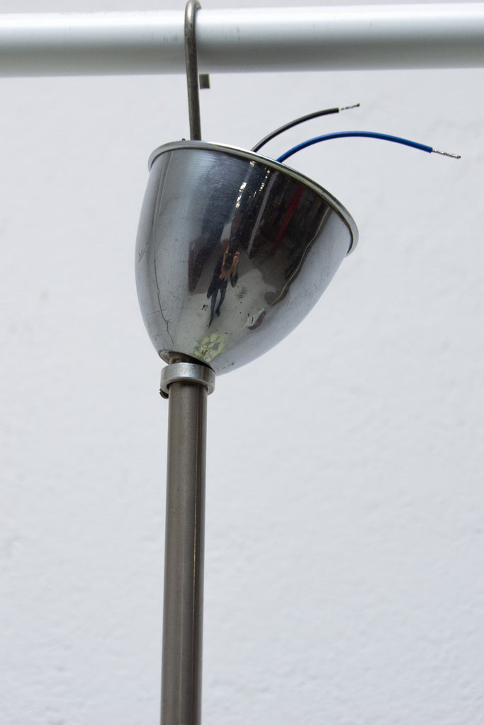 Mid century space age chandelier from the turn of the 50s and 60s connected with the exhibition EXPO 58 in Brussels. Awesome design. Painted motifs. Chrome-plated rod. In very good condition, new wiring.