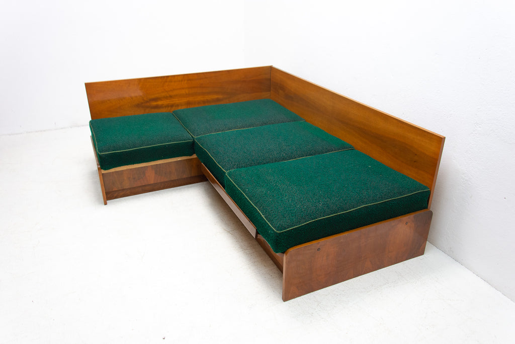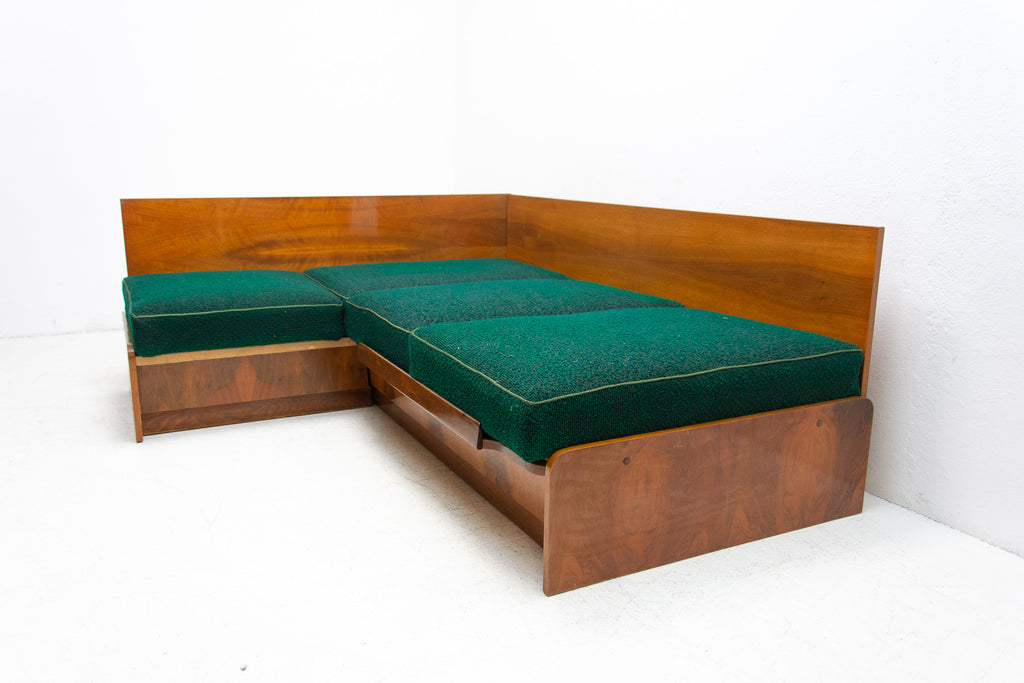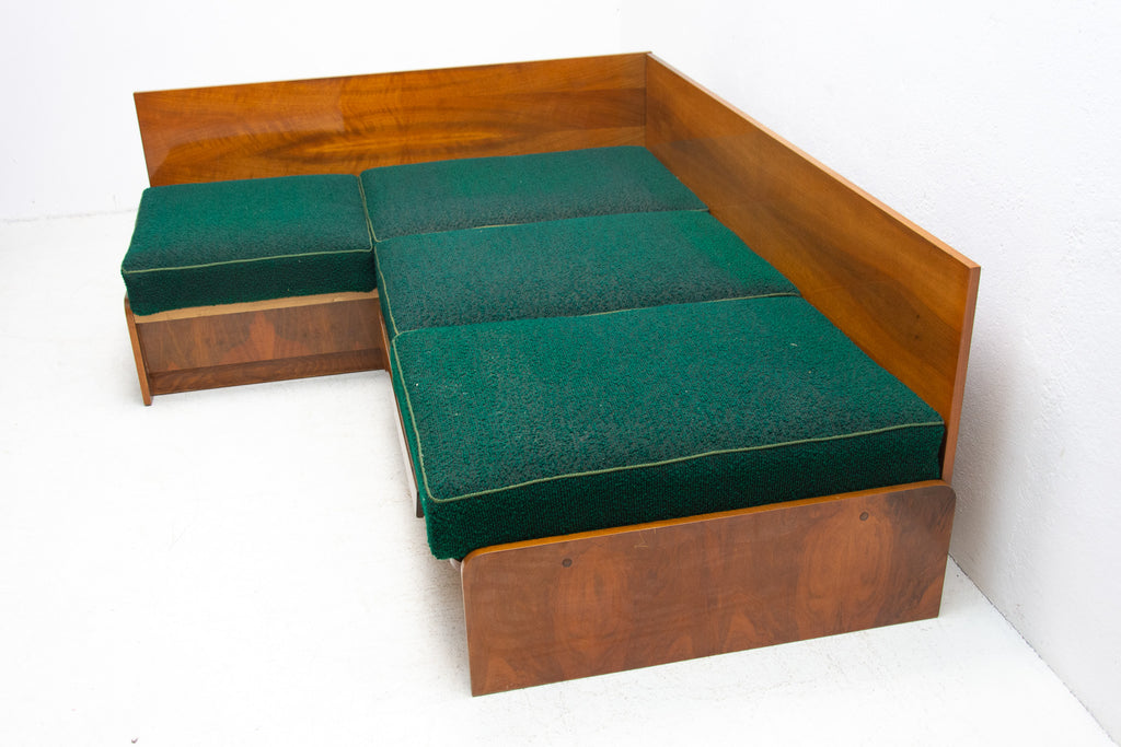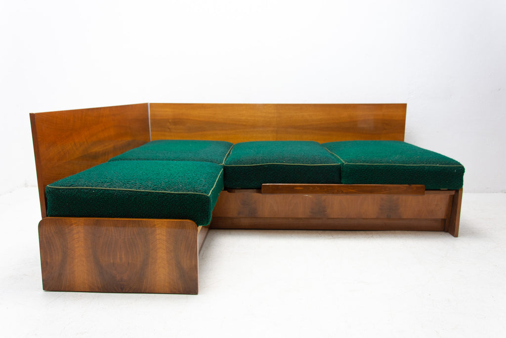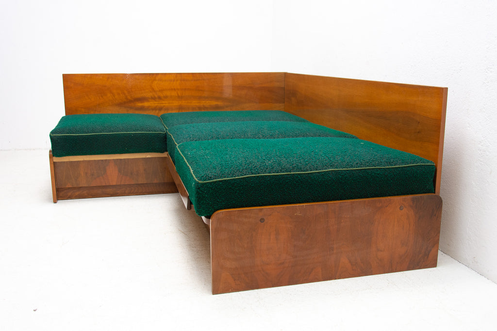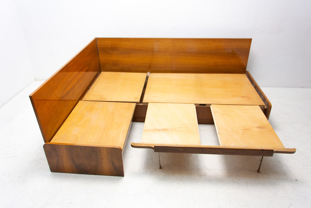 Mid century corner sofa bed designed by Jindřich Halabala. It was made in the former Czechoslovakia in the 1950´s. This sofa features a wooden structure that is veneered in the walnut. Sofa is adjustable for sleeping and is in very good condition.