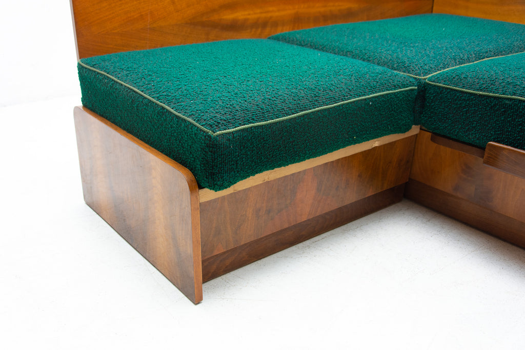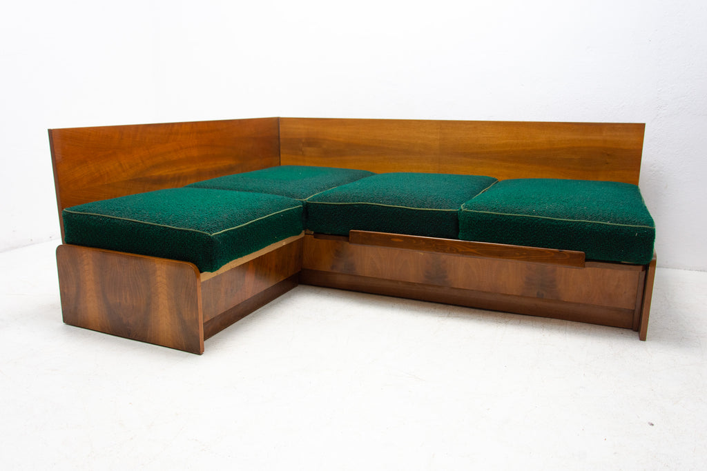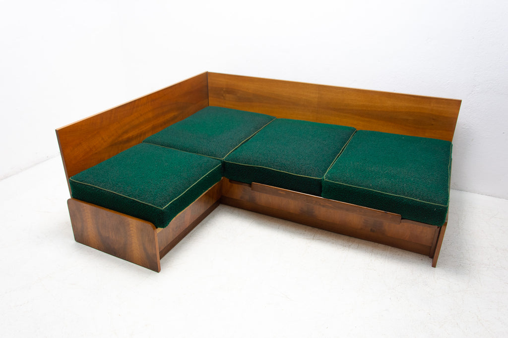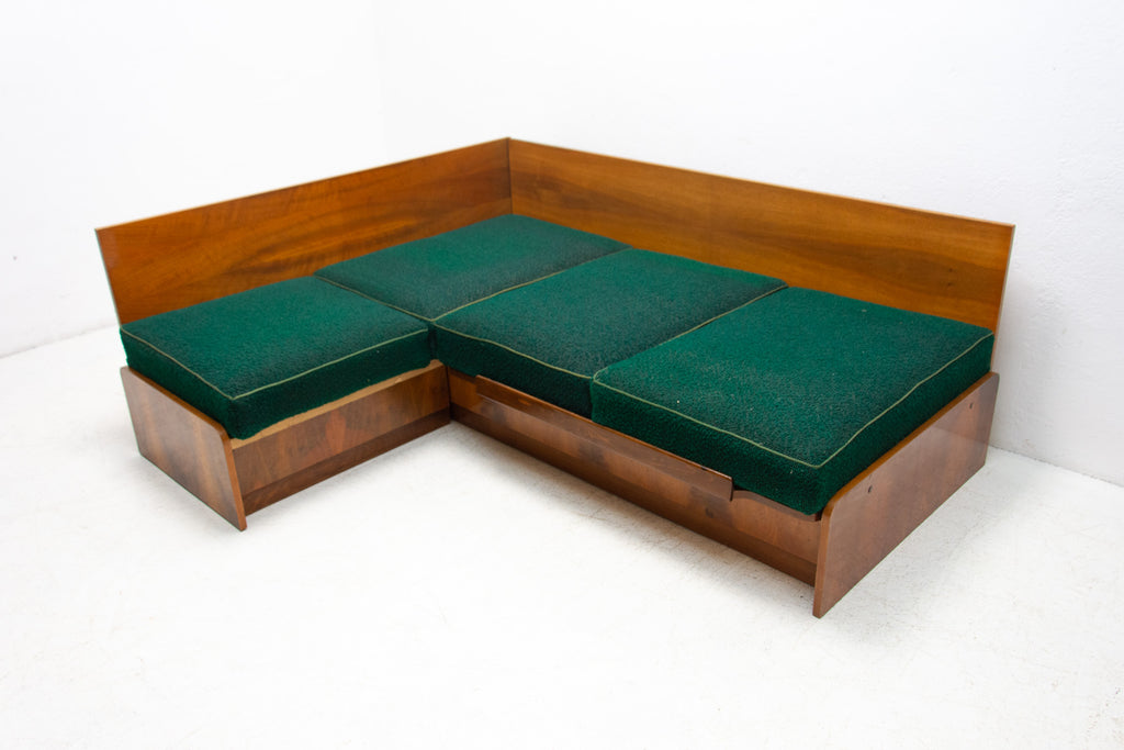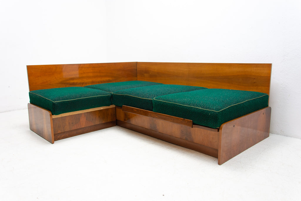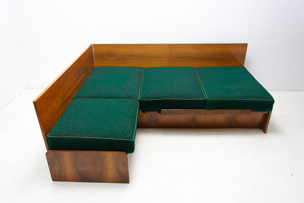 Mid century corner sofa bed designed by Jindřich Halabala. It was made in the former Czechoslovakia in the 1950´s. This sofa features a wooden structure that is veneered in the walnut. Sofa is adjustable for sleeping and is in very good condition.