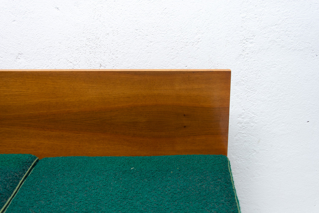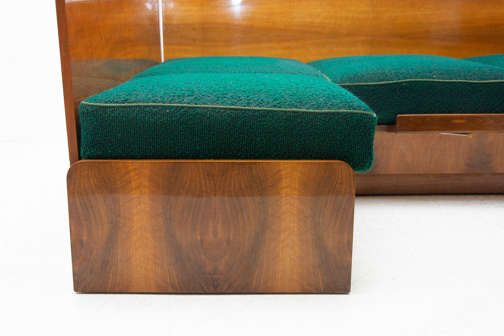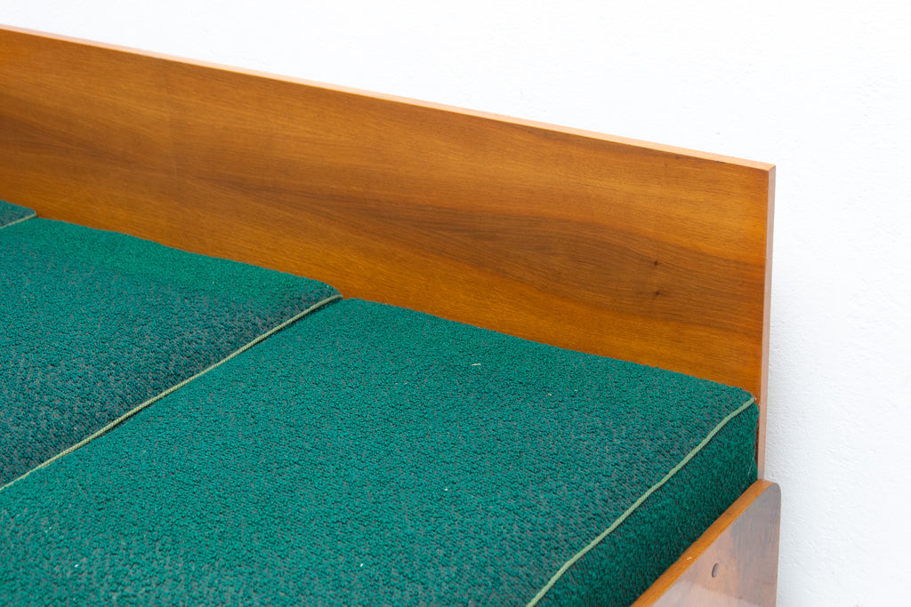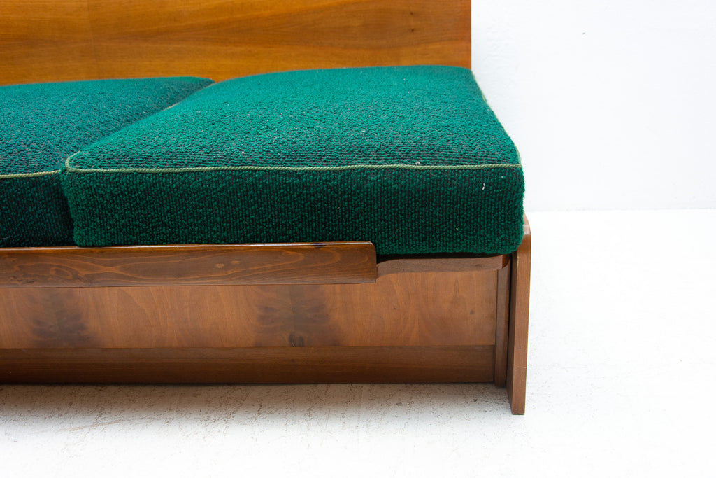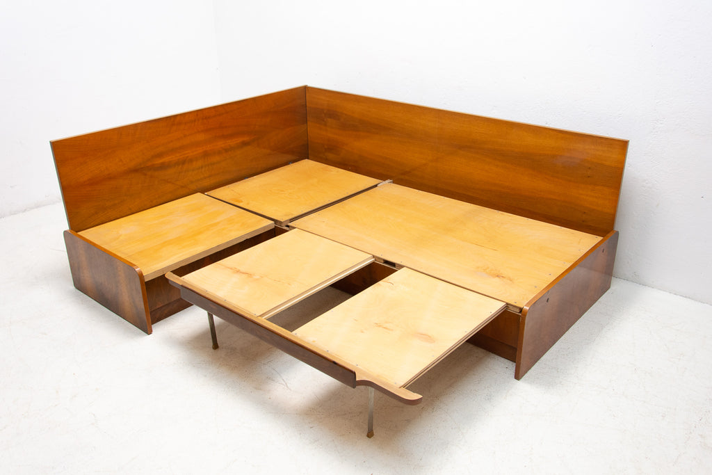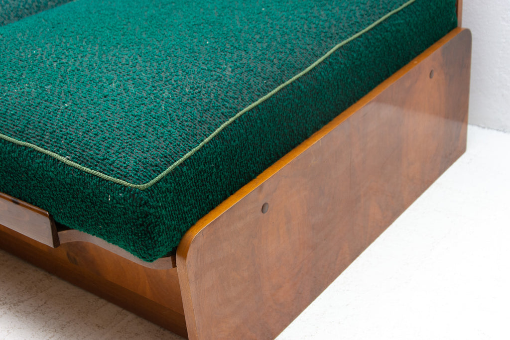 Mid century corner sofa bed designed by Jindřich Halabala. It was made in the former Czechoslovakia in the 1950´s. This sofa features a wooden structure that is veneered in the walnut. Sofa is adjustable for sleeping and is in very good condition.
