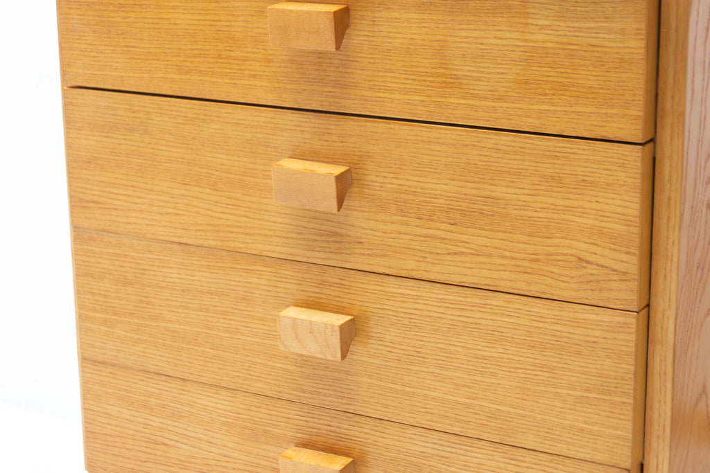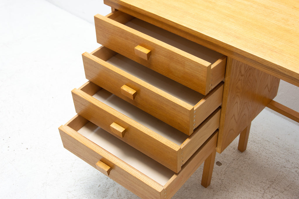 The design is very simple and elegant. It features a section with 4 drawers. The surface of this desk has been fully restored and is in very good condition.
