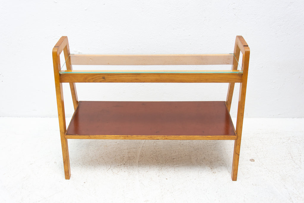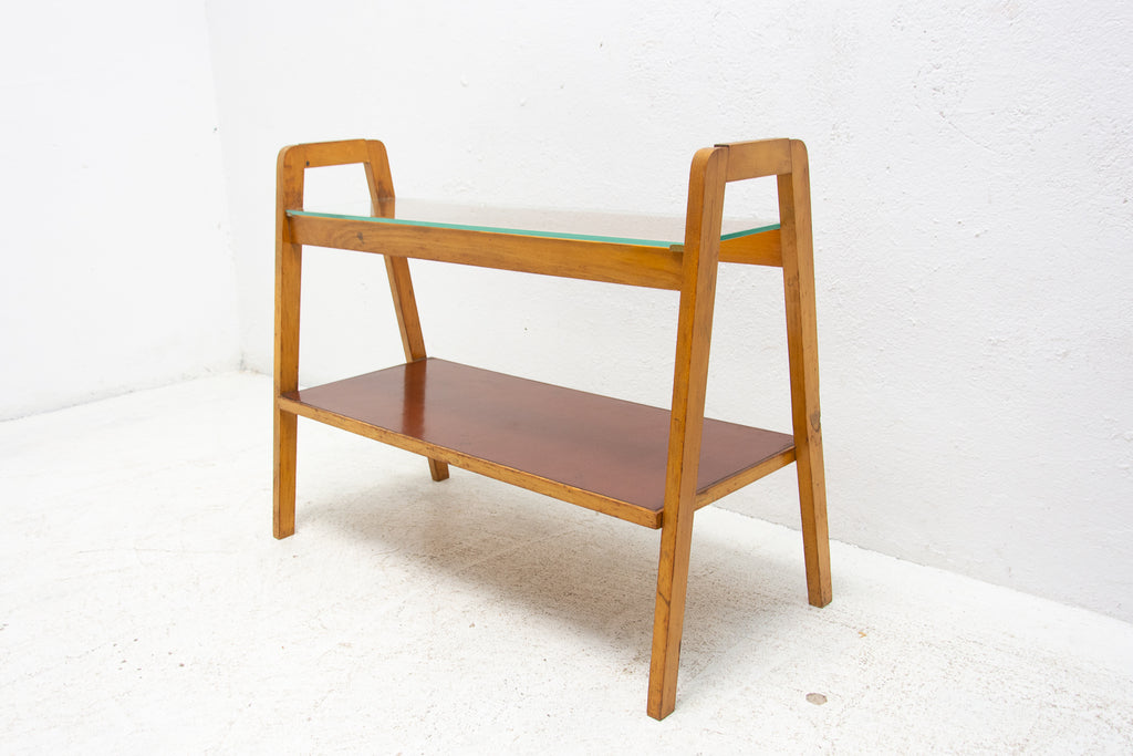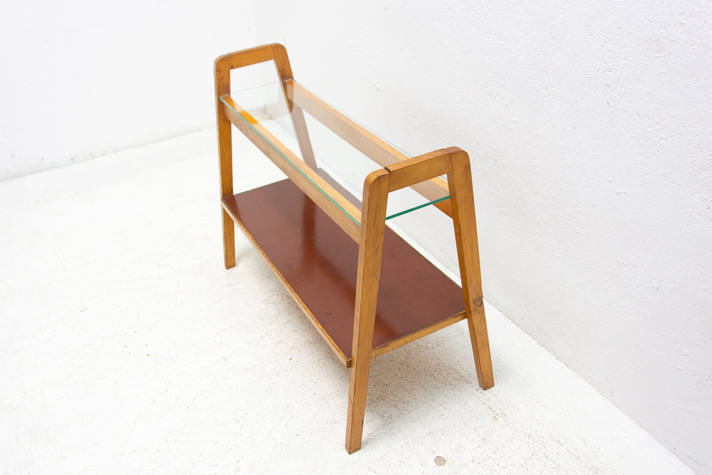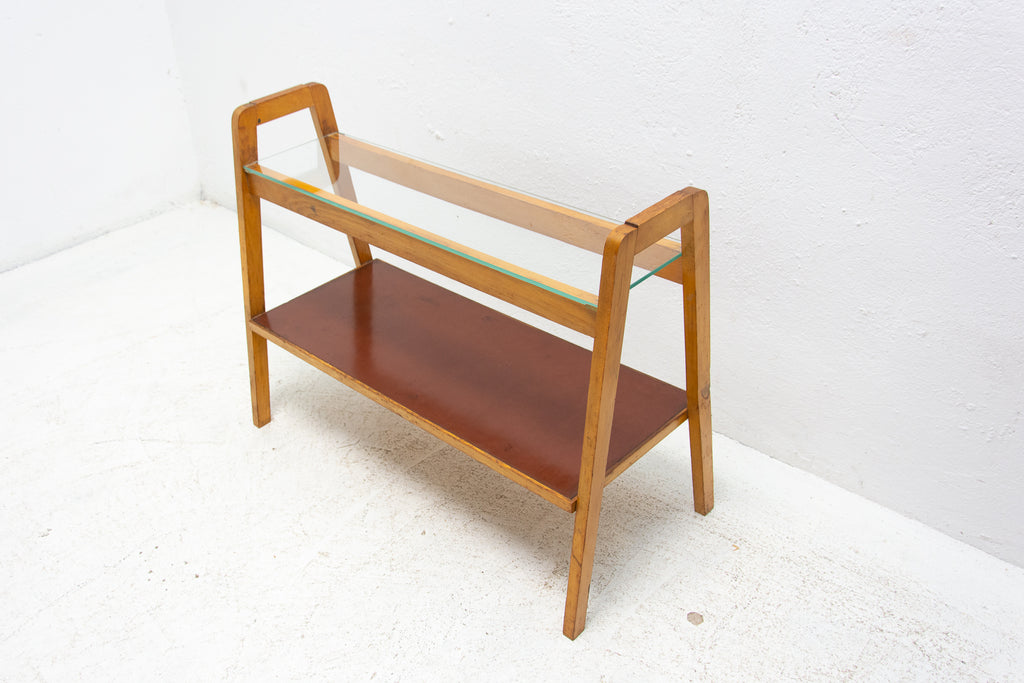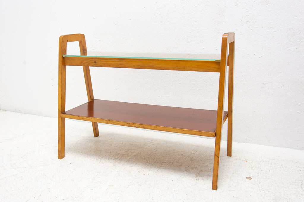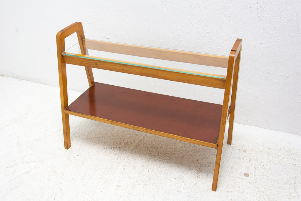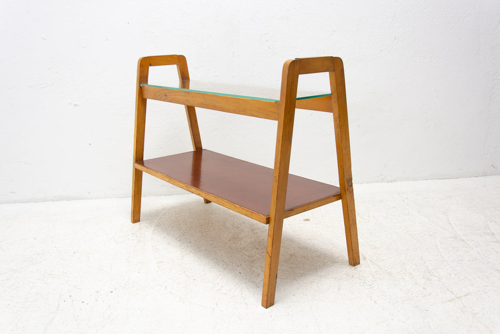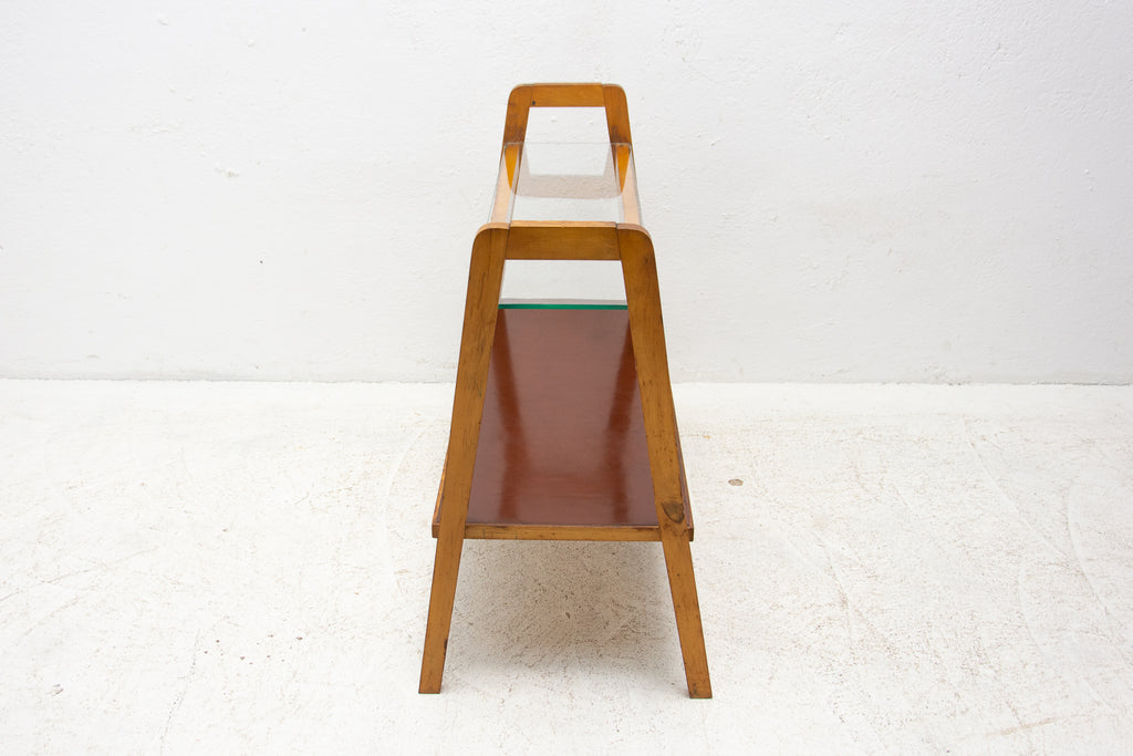 This side table was made by Krásná Jizba company in the 1960´s. It´s made of beech wood, glass and formica. Very well preserved condition.