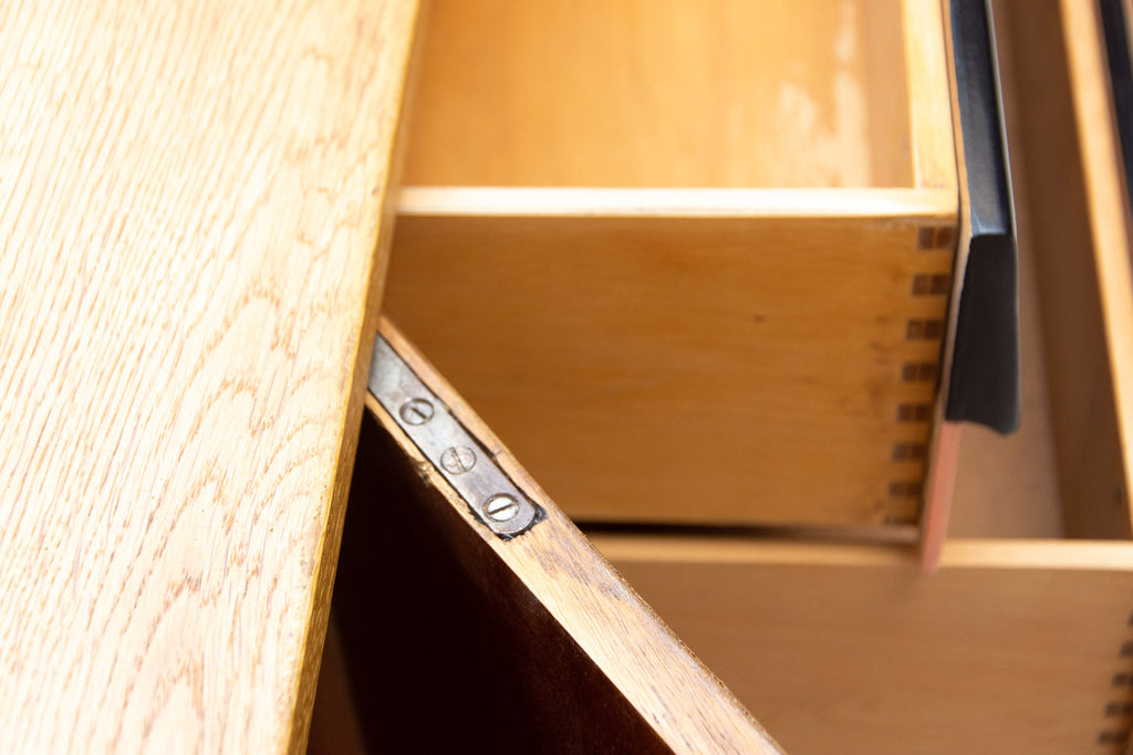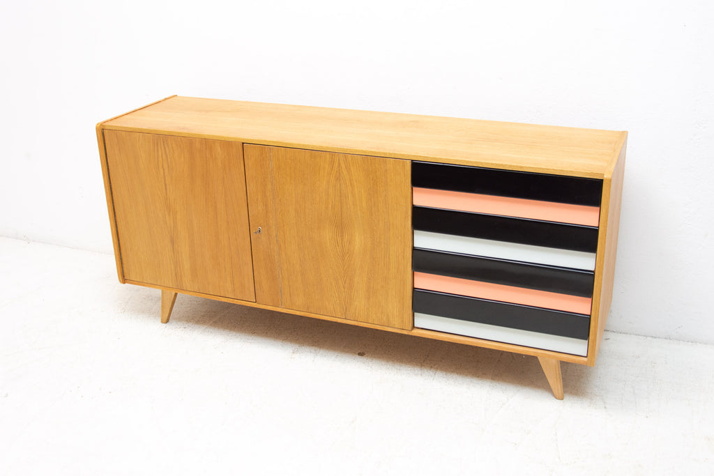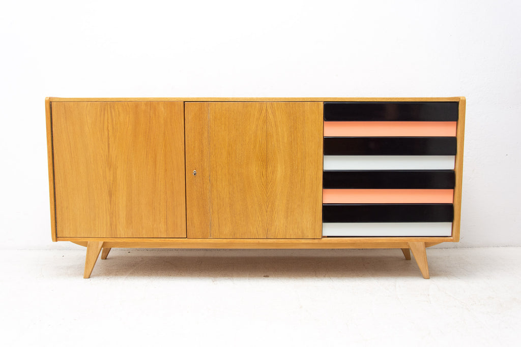 A popular Vintage sideboard model U-460 from the 1960´s. It was designed by Jiri Jiroutek for Interier Praha. It features a beech wood, plywood, colored lacquered drawers. Fully renovated. In excelent condition.