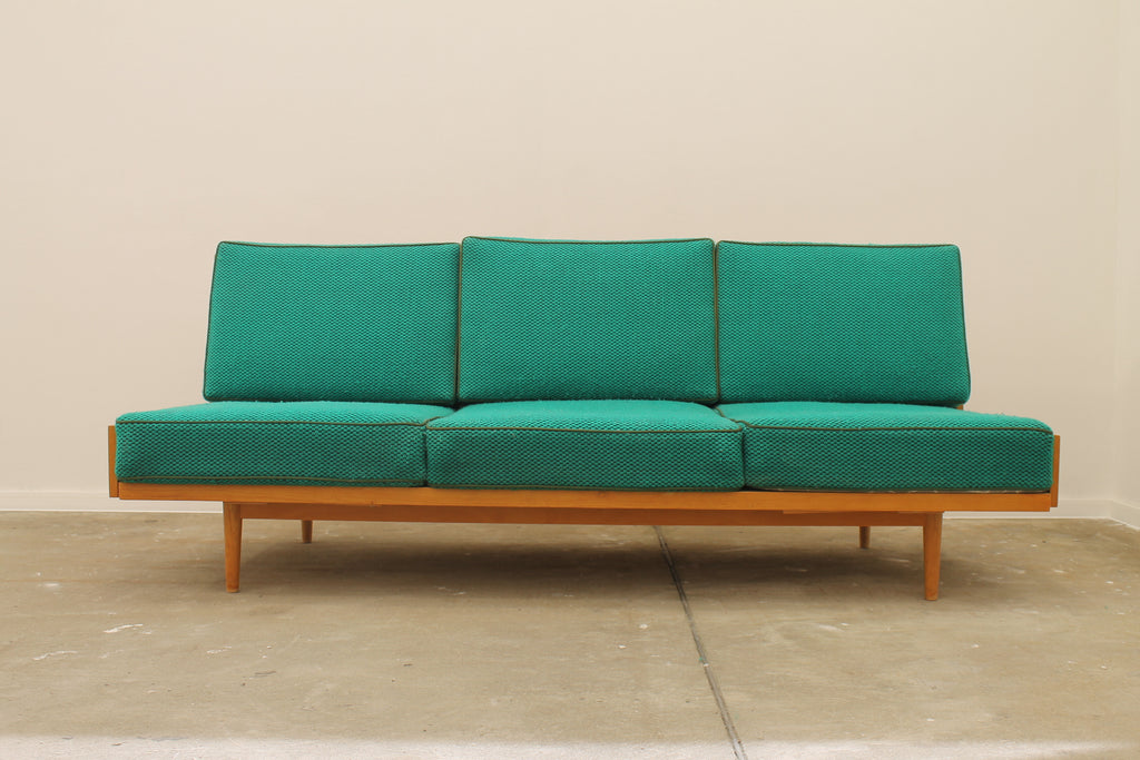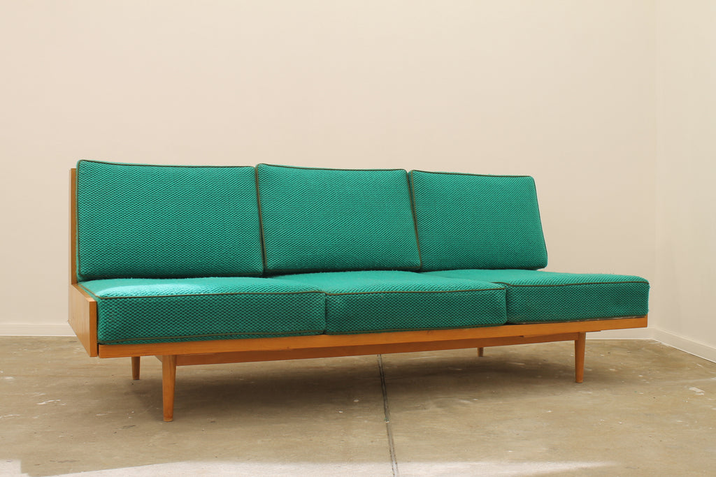 This mid century sofabed was made in the former Czechoslovakia in the 1970s. The sofa has a beechwood and playwood structure and original upholstery. These sofas are currently very popular, both due to their attractive appearance and their practicality. The sofa can easily be folded into a smaller double bed. The mattresses are medium soft and comfortable.