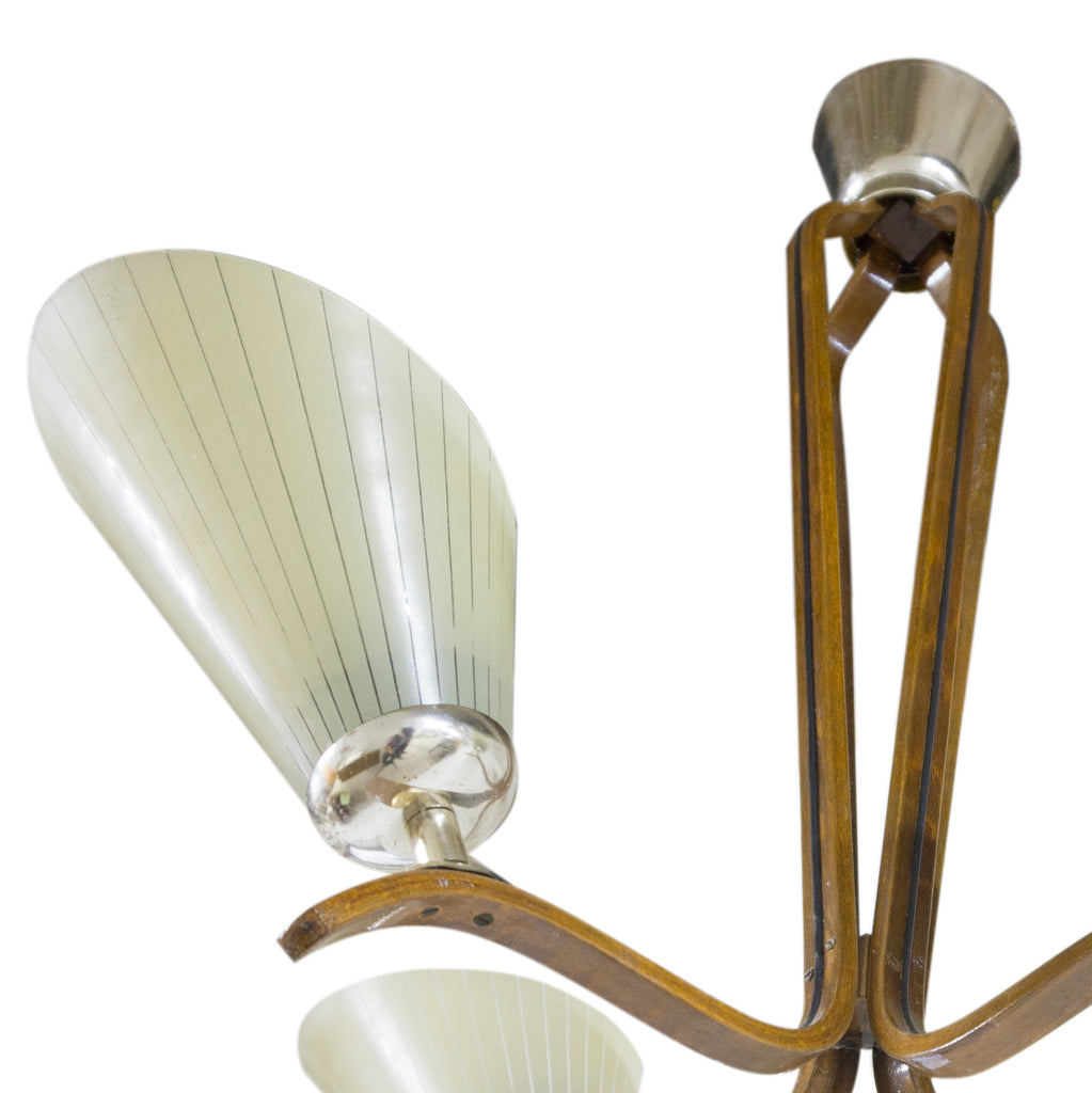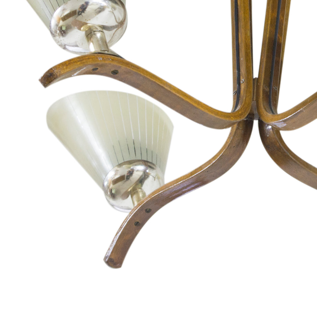 Mid-century chandelier made in Czechoslovakia. Material: wooden structure, chrome, frosted glass-lampshades. Interesting model. In very well preserved condition, original wiring.