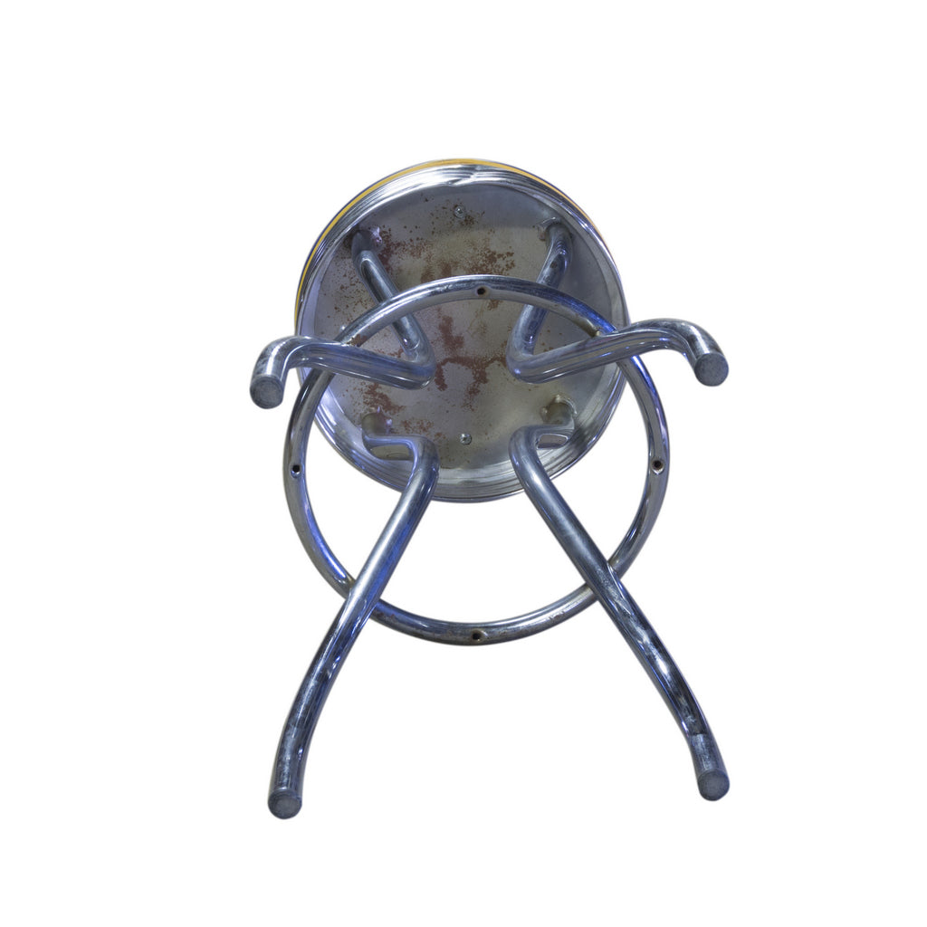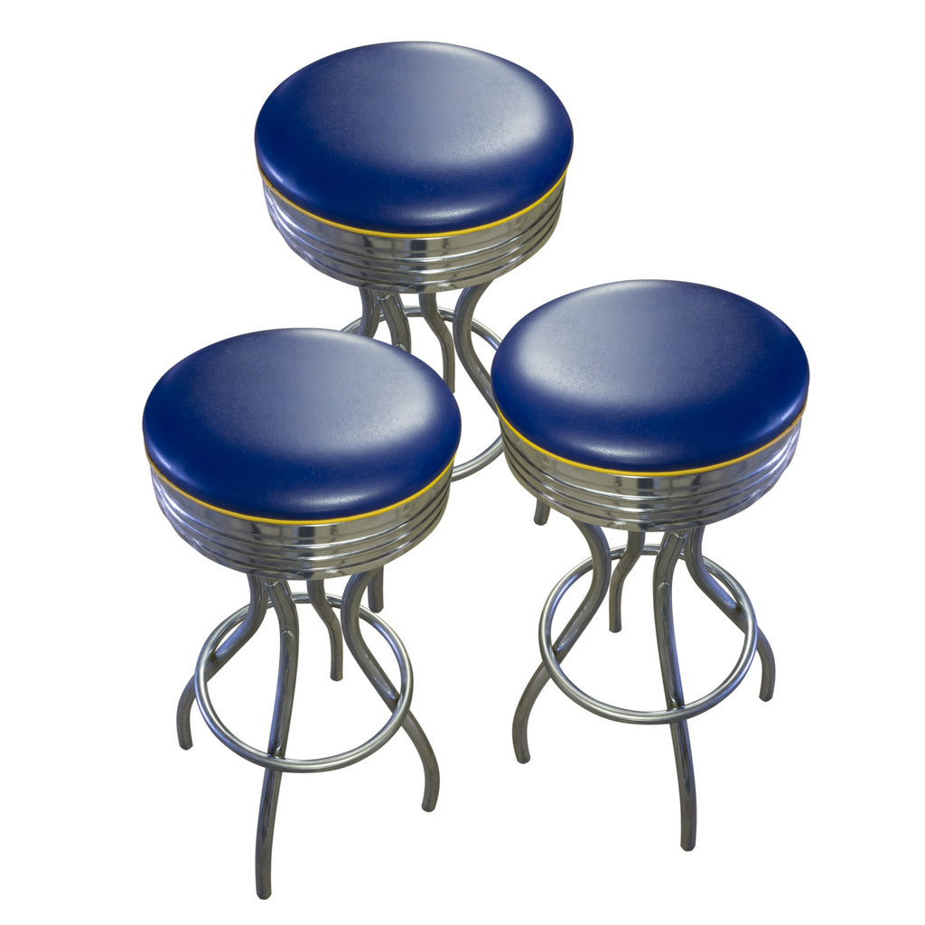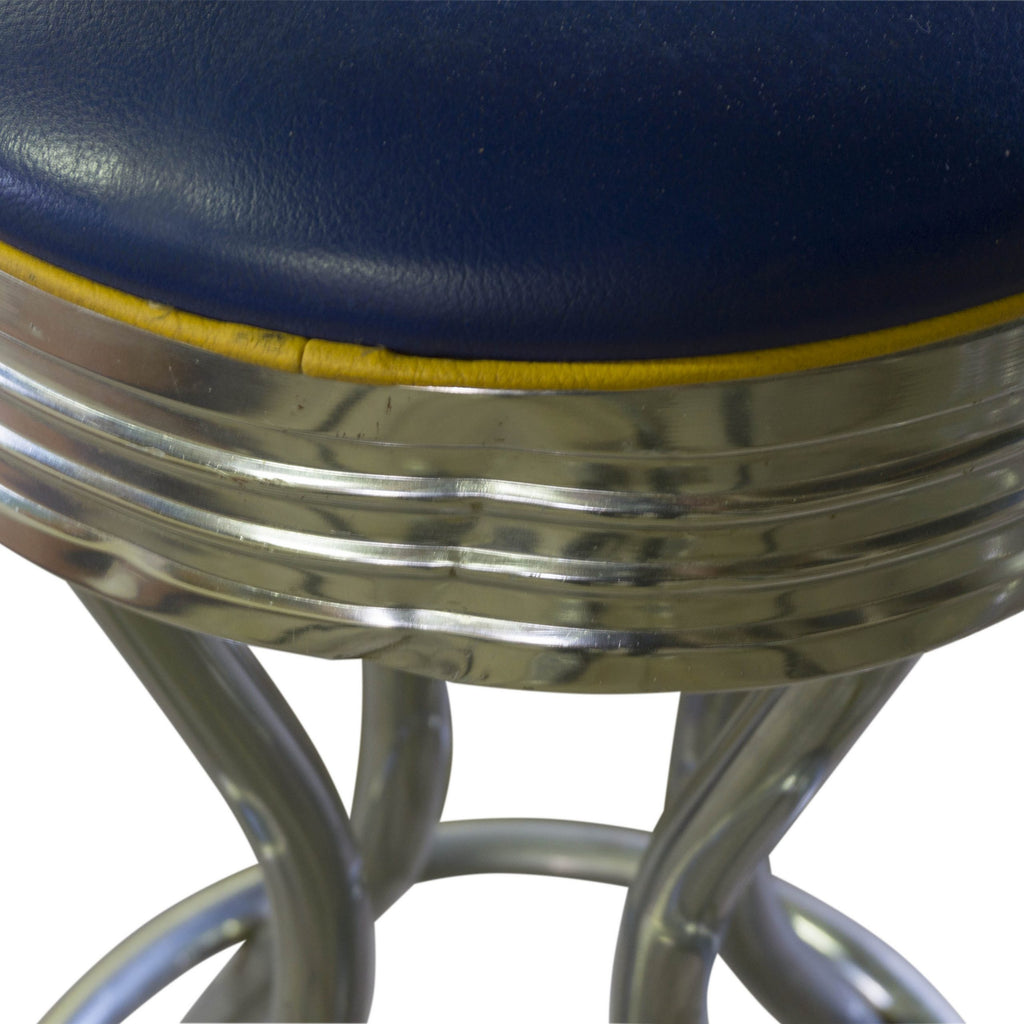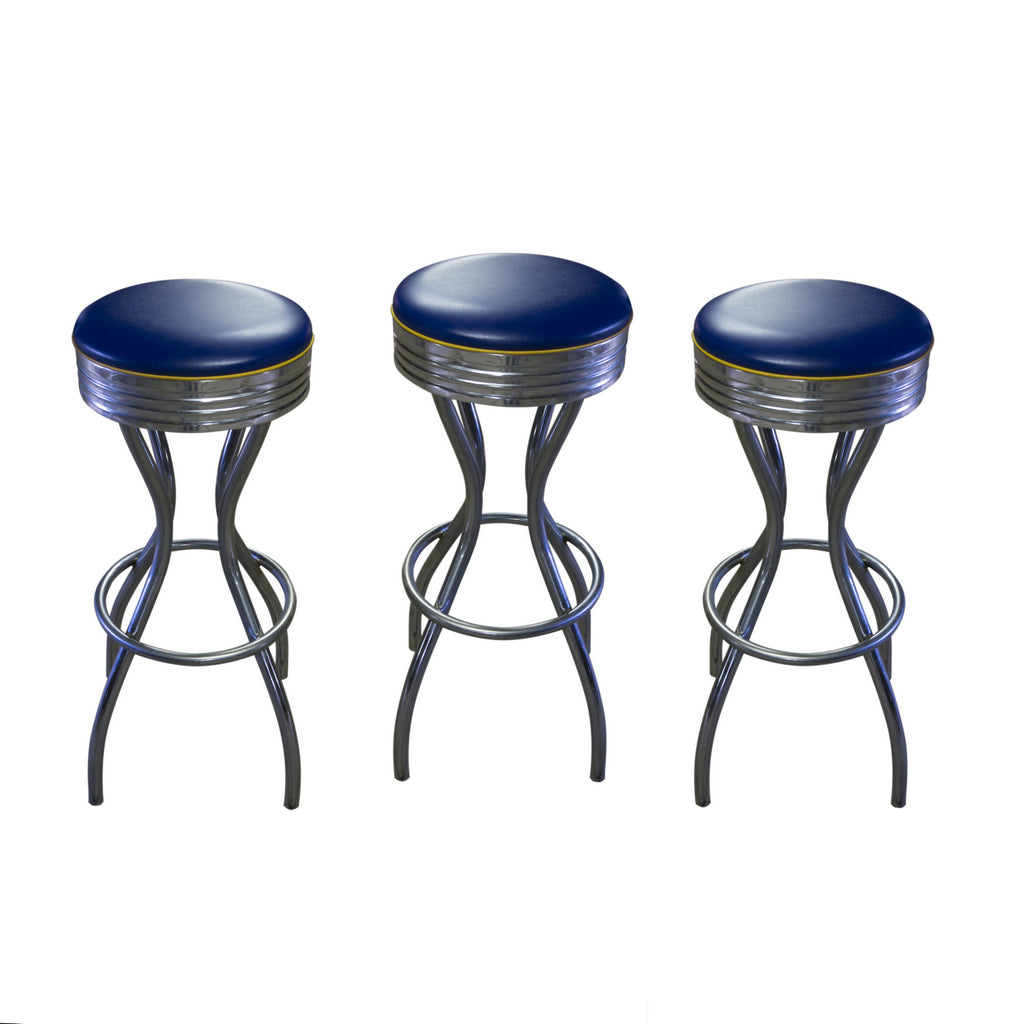 These bar stools feature modern chrome bases and beautiful dark blue upholstery, offering comfortable seating. Unique addition for any home or office space. Probably 1970-1980´s. The structure is made of bent tubular steel. Unfortunately they have partially damaged upholstery, the stools having chromed metal around the seat, which is in several places slightly bent, but easily fixed. See photos. Chrome is very well preserved. Price is for the set of three.