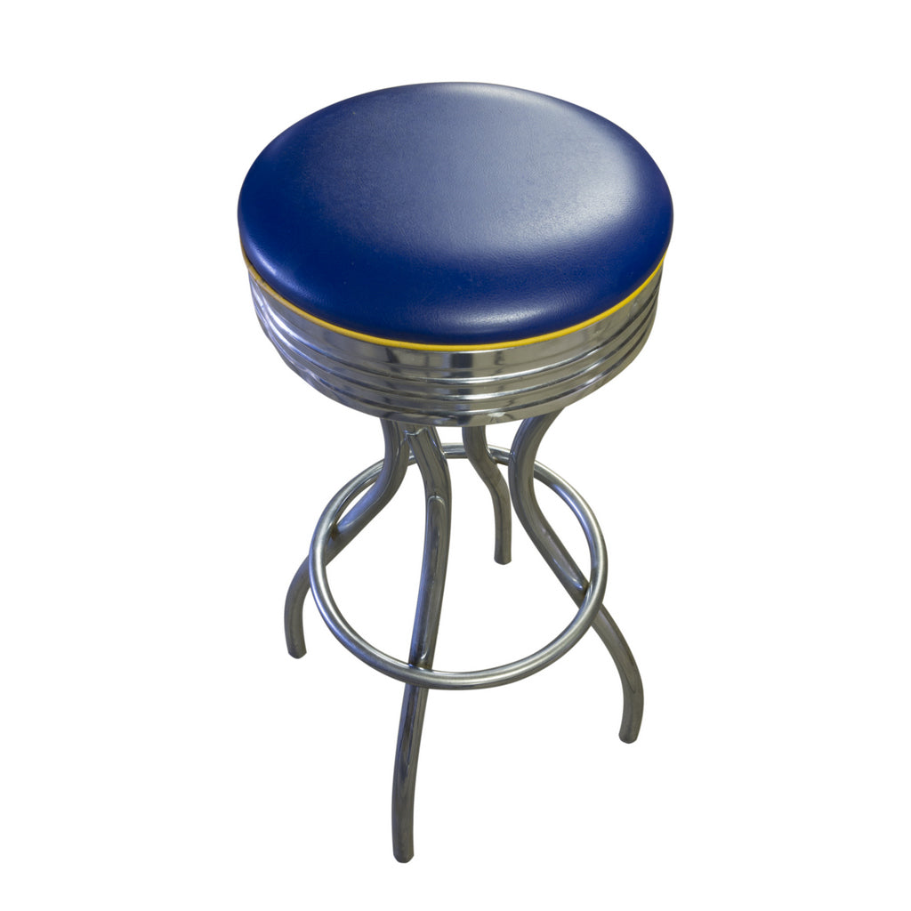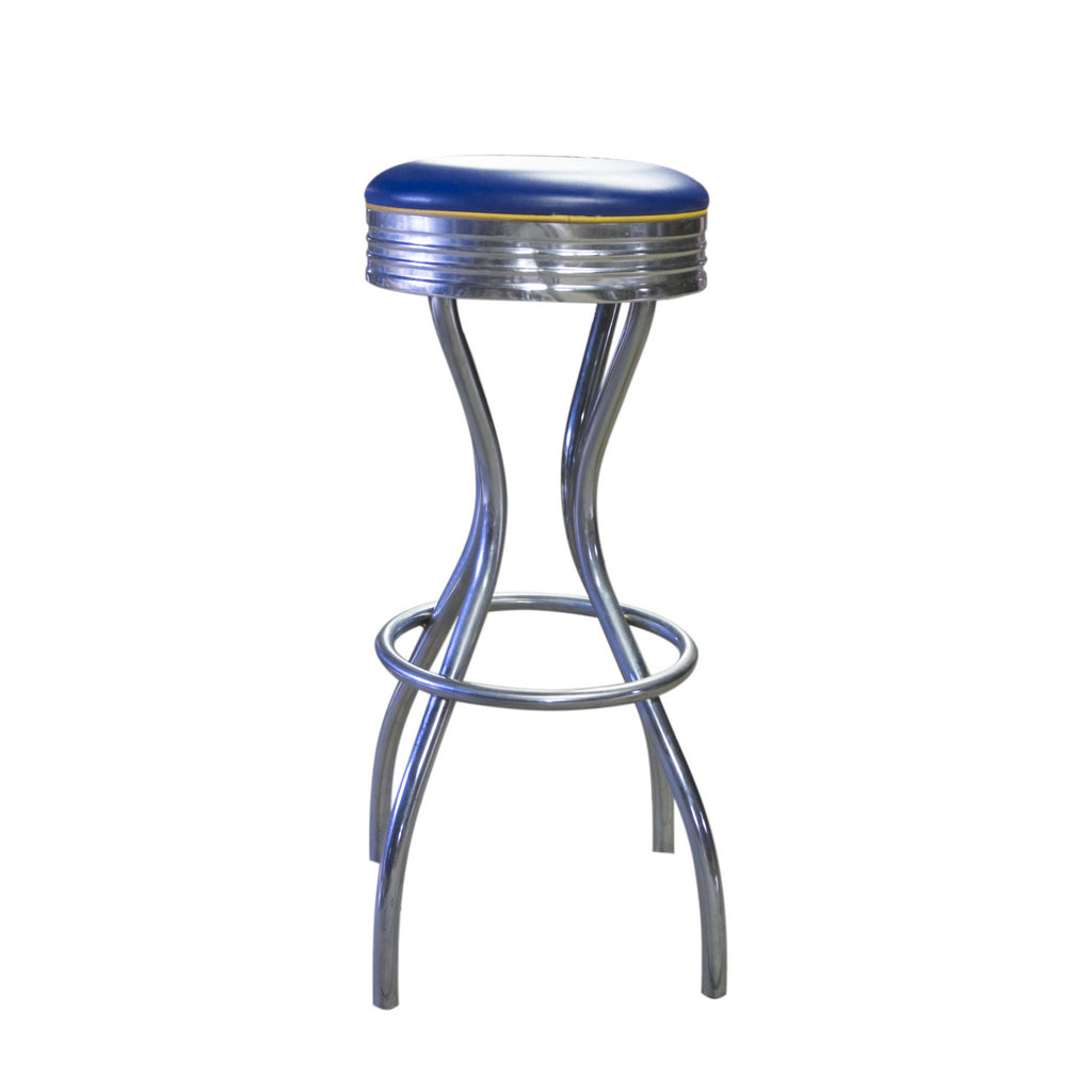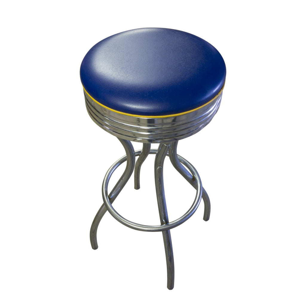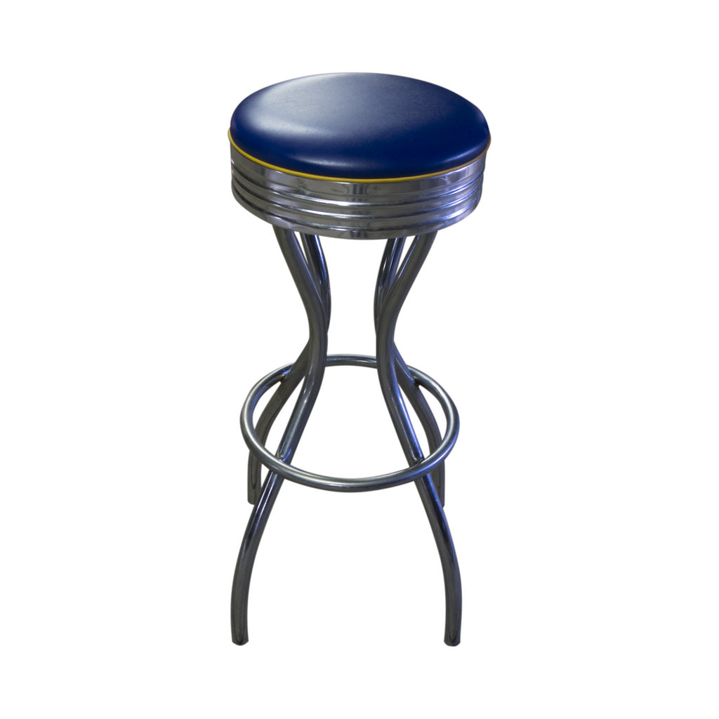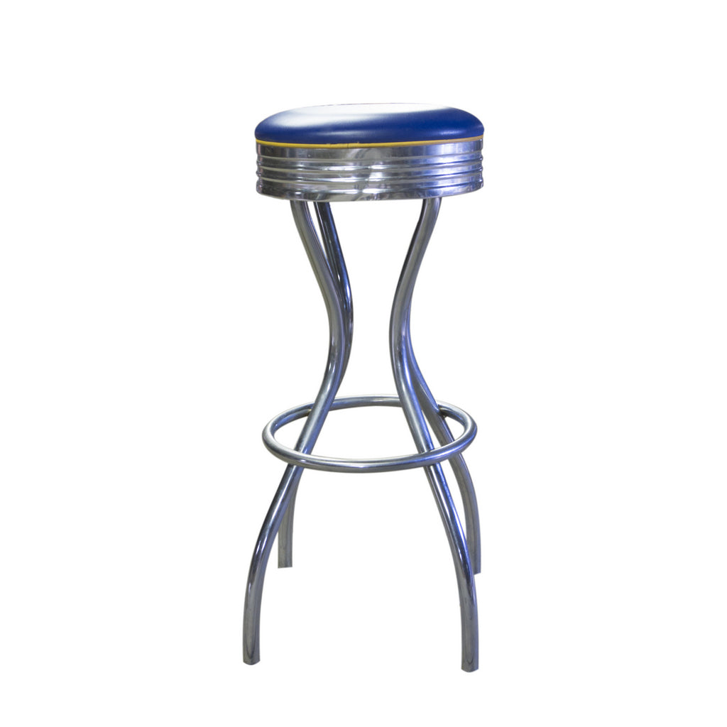 These bar stools feature modern chrome bases and beautiful dark blue upholstery, offering comfortable seating. Unique addition for any home or office space. Probably 1970-1980´s. The structure is made of bent tubular steel. Unfortunately they have partially damaged upholstery, the stools having chromed metal around the seat, which is in several places slightly bent, but easily fixed. See photos. Chrome is very well preserved. Price is for the set of three.