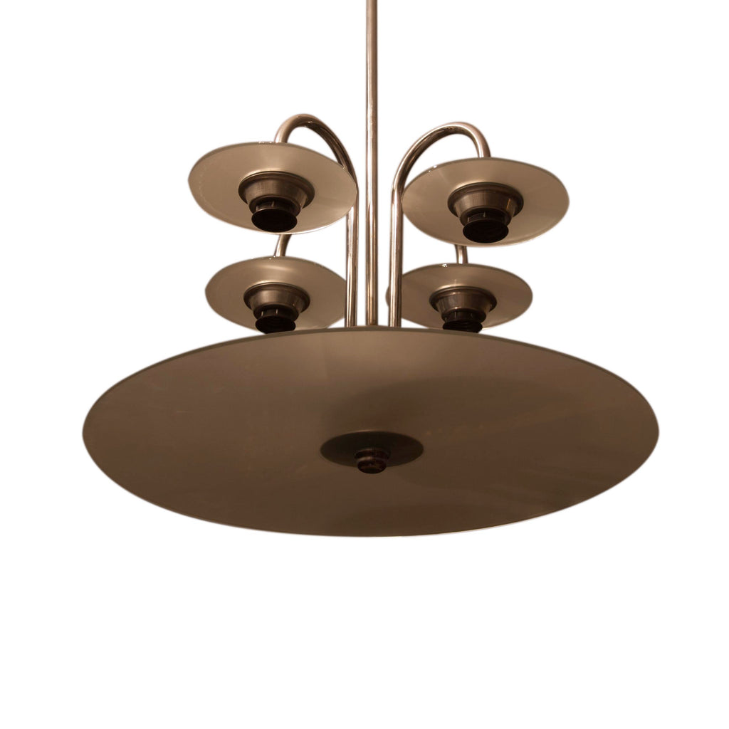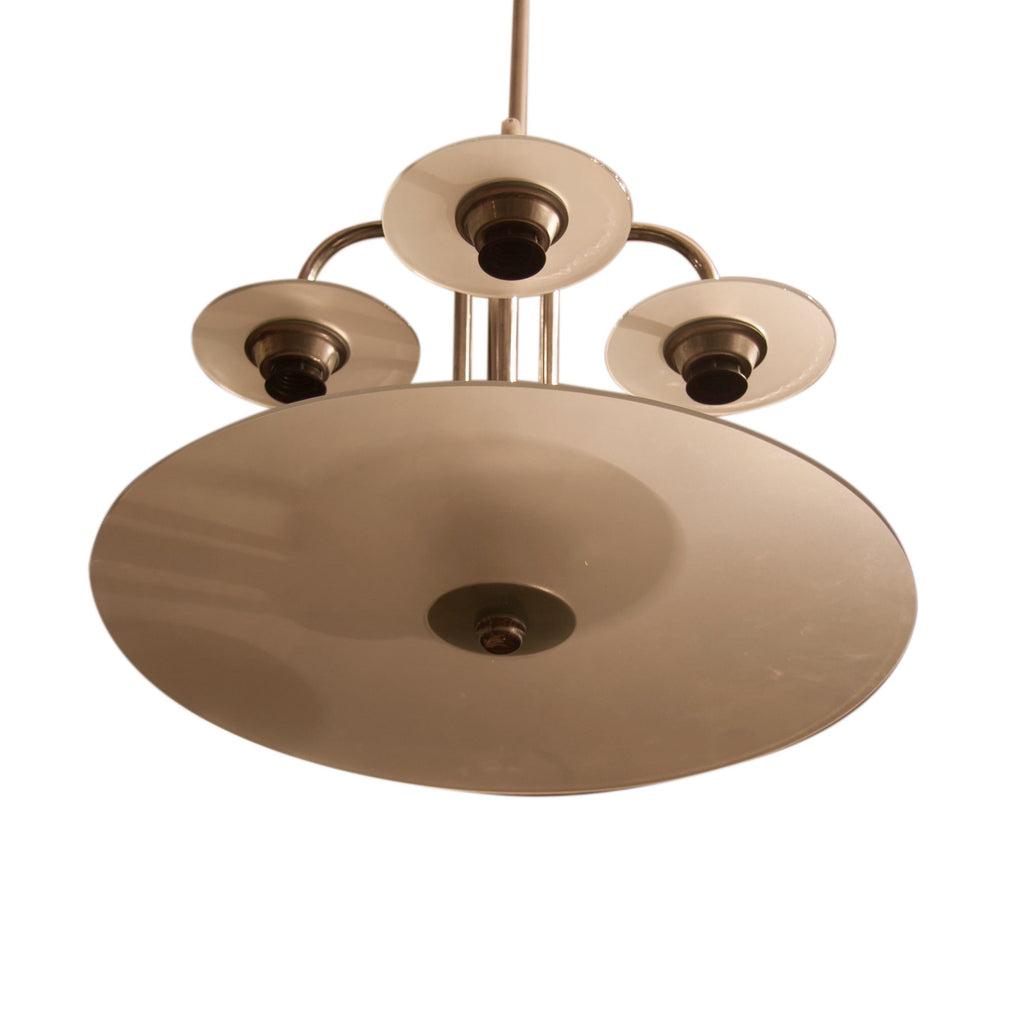 Chandelier from the Bauhaus period, an excellent model at the bottom of a large glass plate, the upper part consists of four bowl of opal glass. Everything on chrome frame. Excellent condition, new electrification. an excellent example of this timeless period and style.