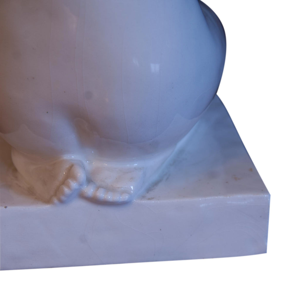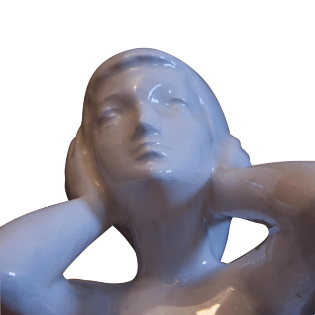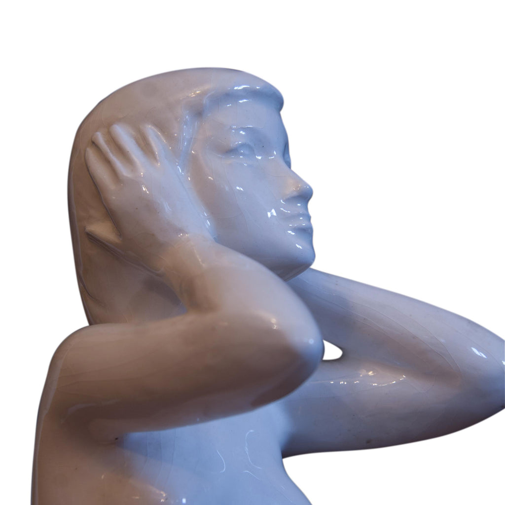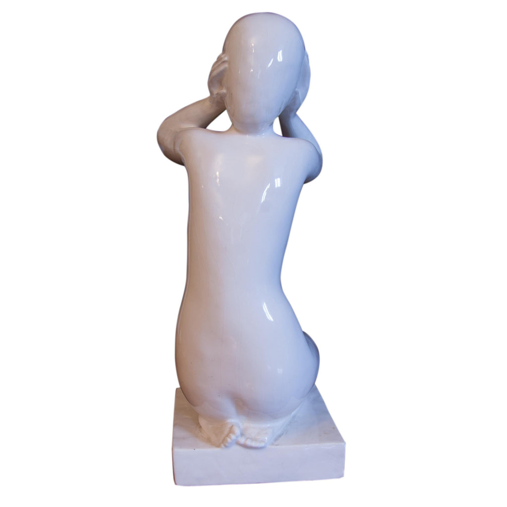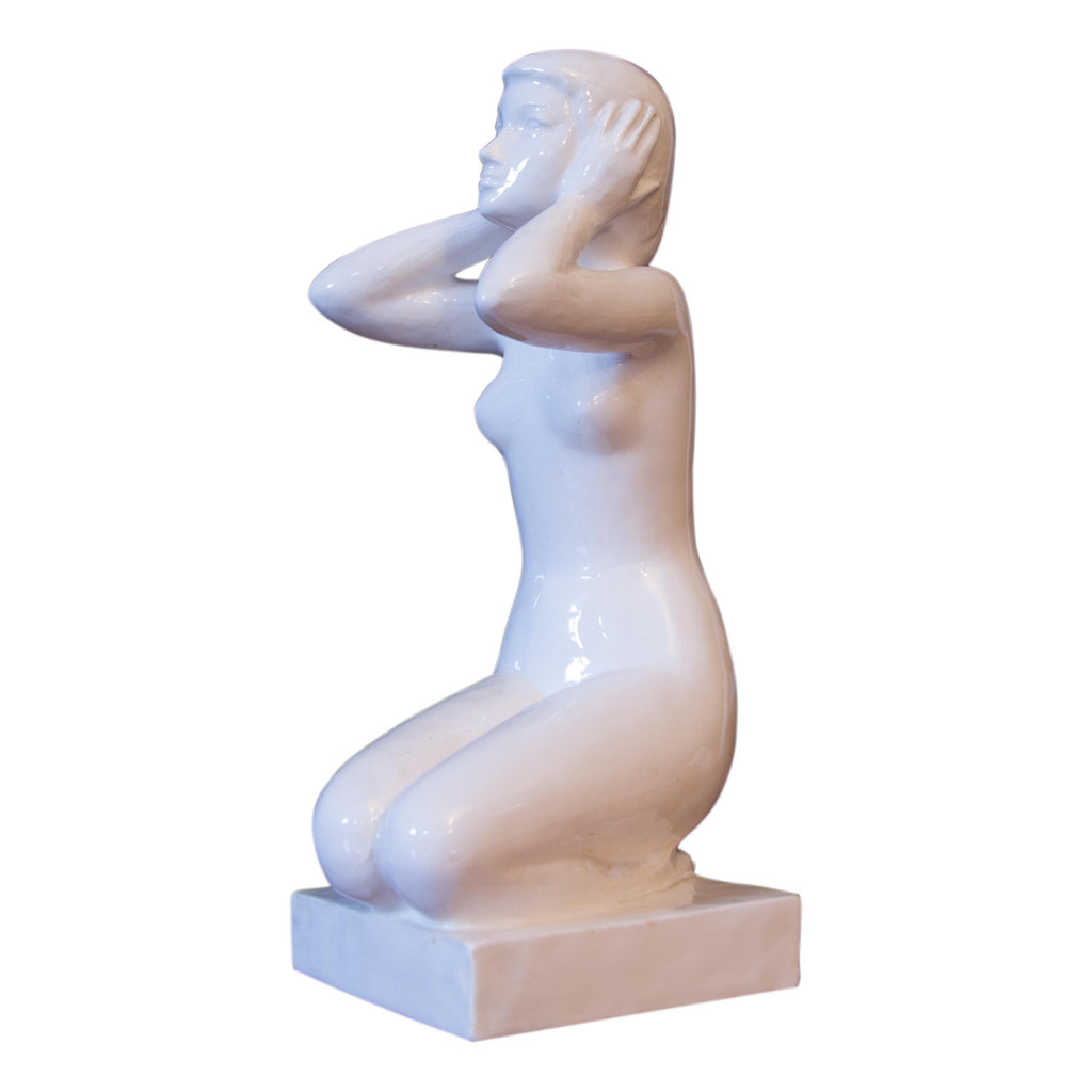 Beautiful sculpture, statue of a kneeling girl - female nude. EXPO 58. In perfect condition. Without any damage. White glaze. Marking of numbers. Dimensions: 34 cm, length 14 cm, depth 18 cm.