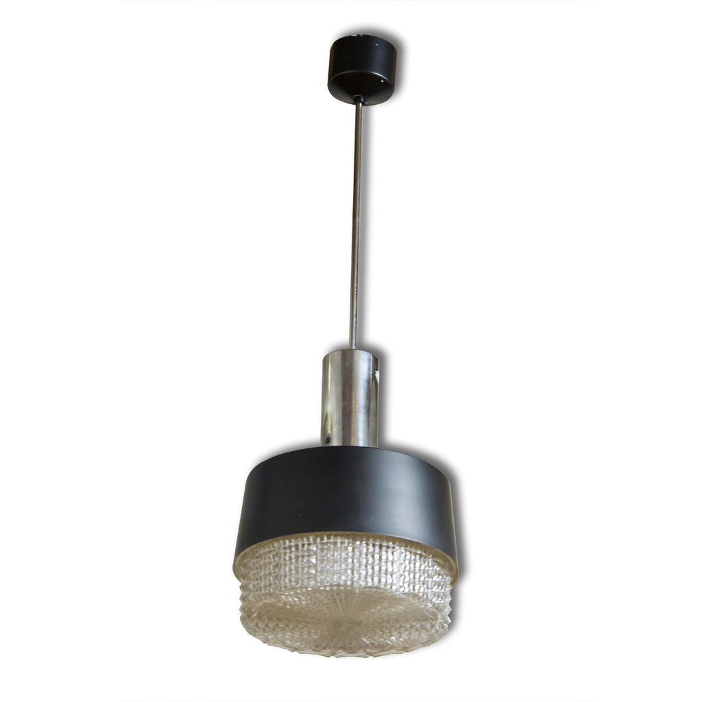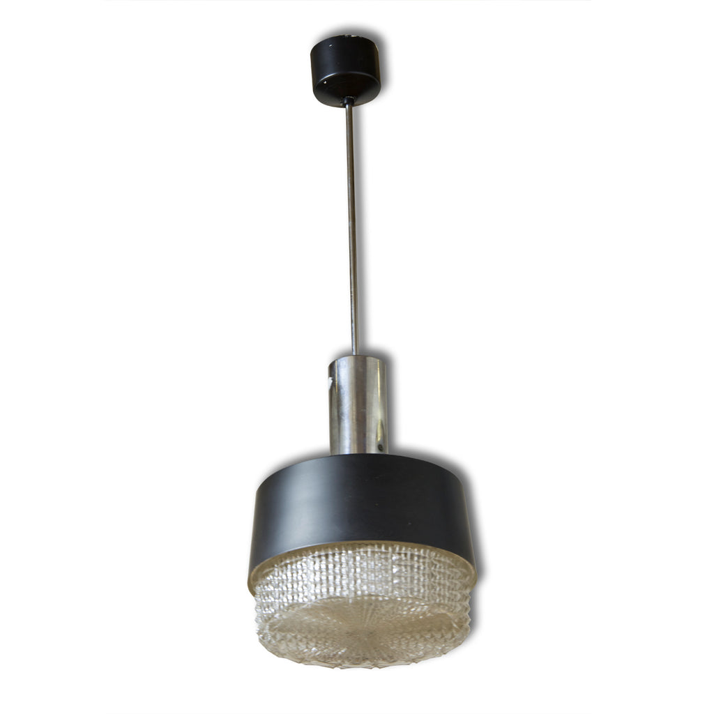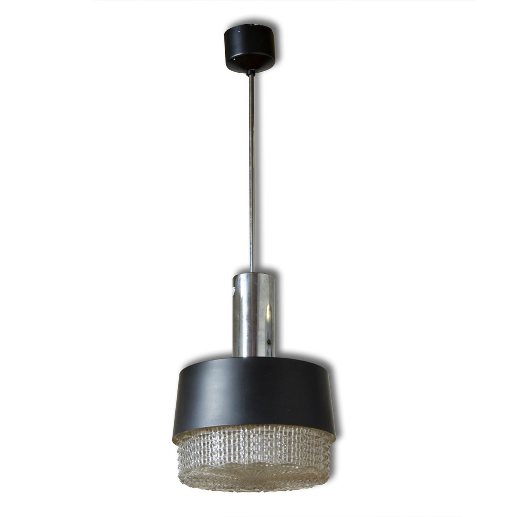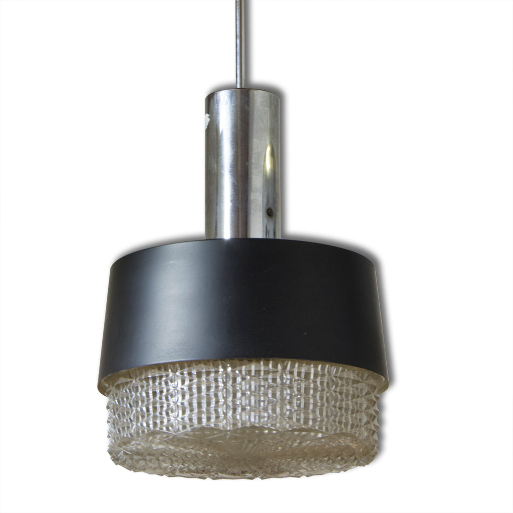 Mid century pendant probably produced by Napako, 1960´s. Material: metal, cut glass, chromium plated rod.