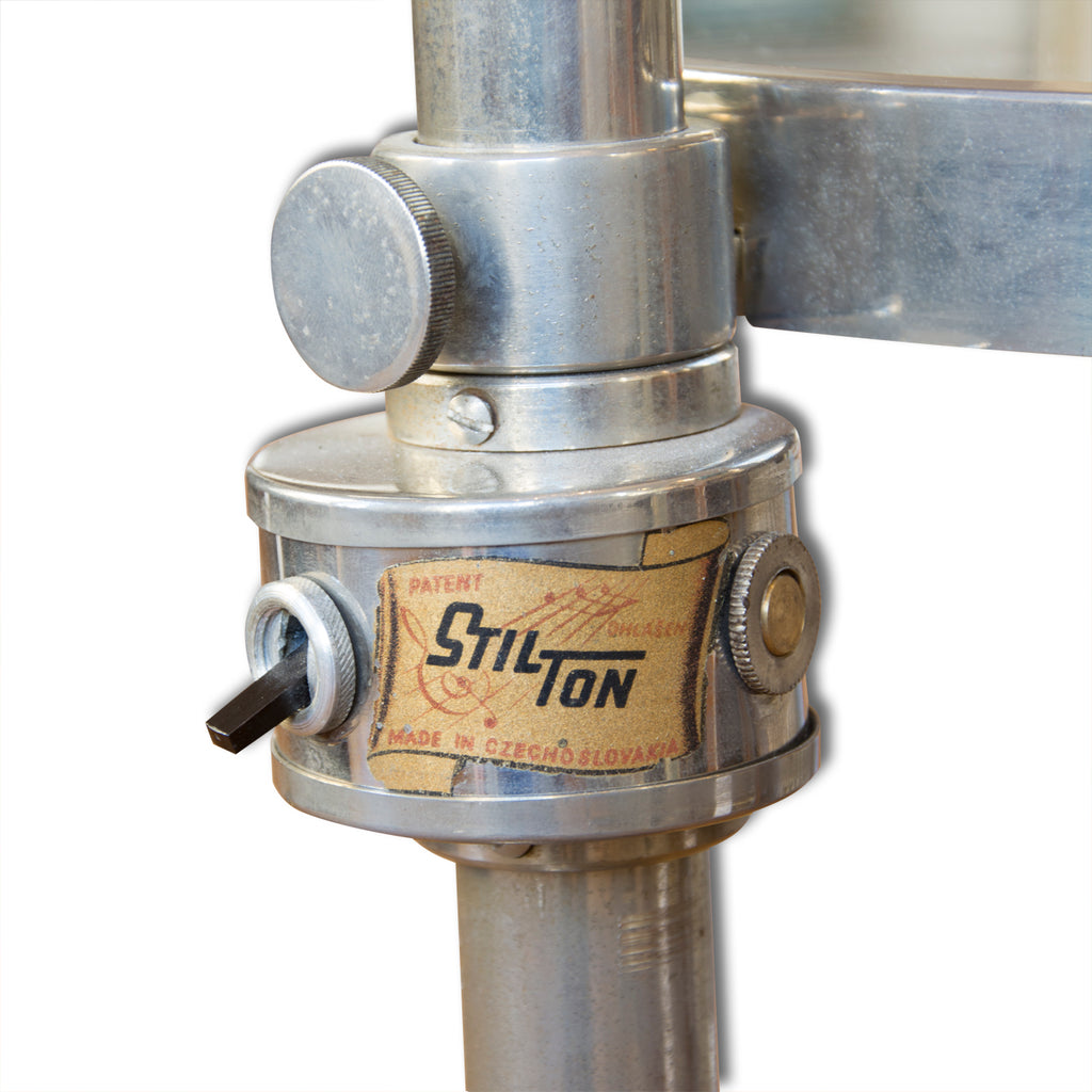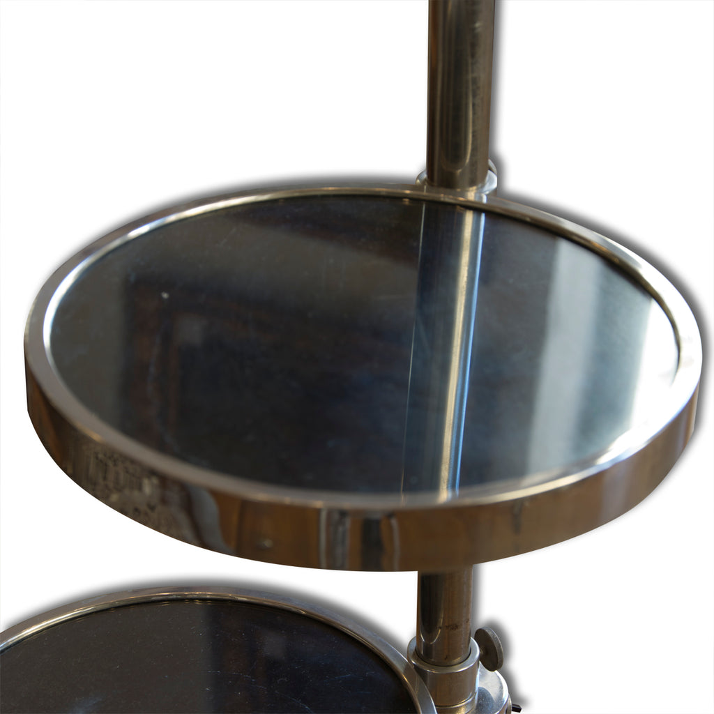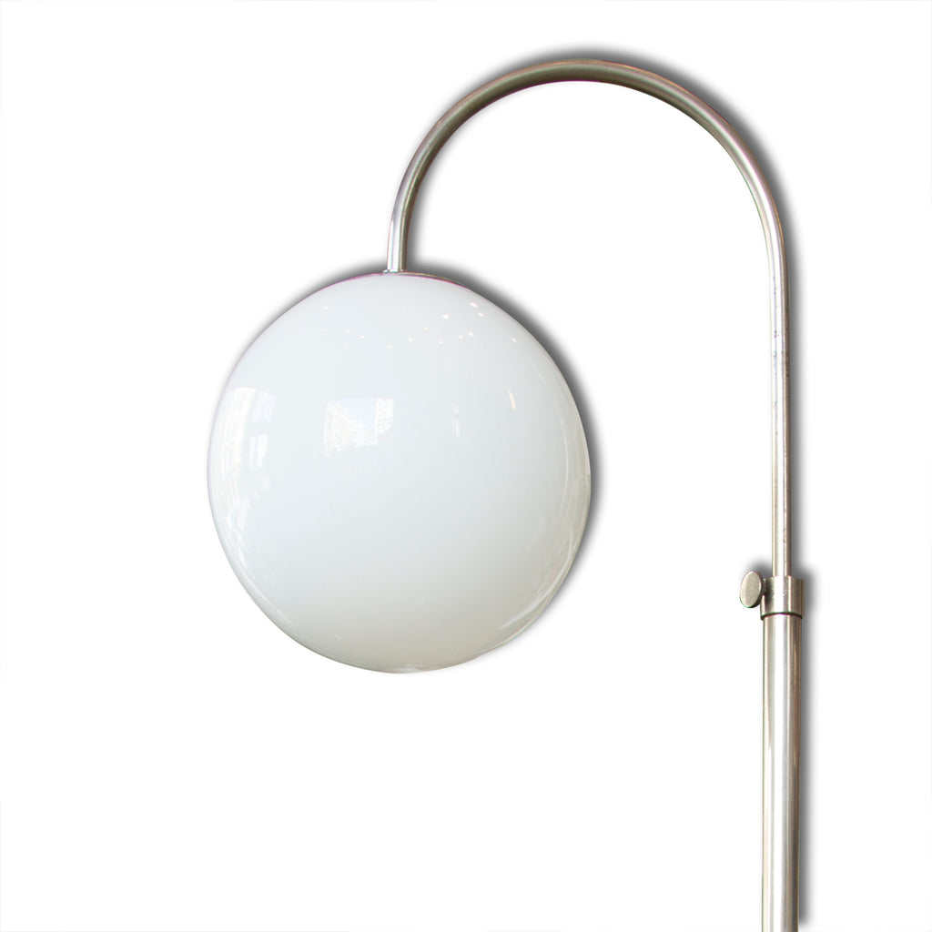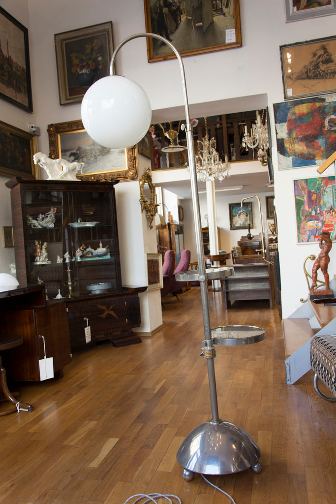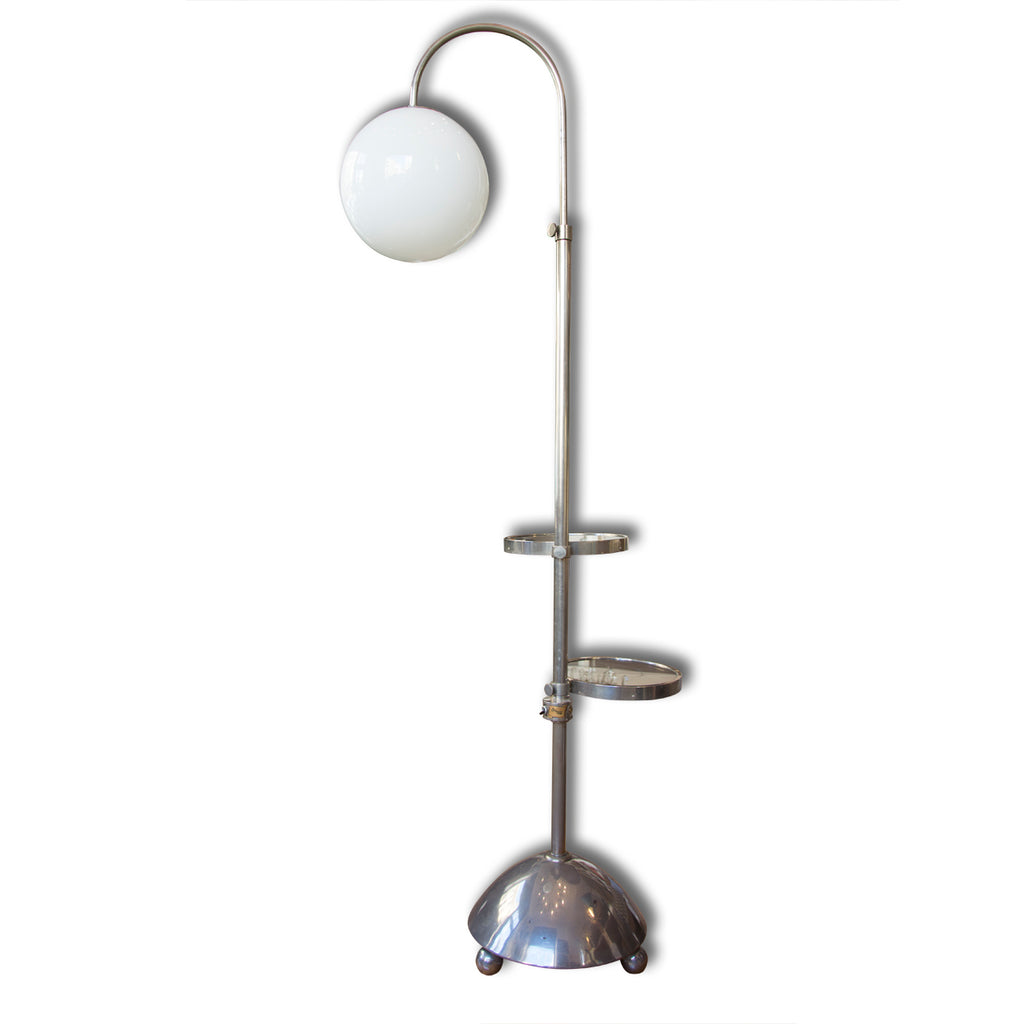This chromed floor lamp from the Bauhaus period was made in the 1930s in Bohemia. It features a chromed base with built-in load-speaker for the radio. In excellent condition, new wiring.