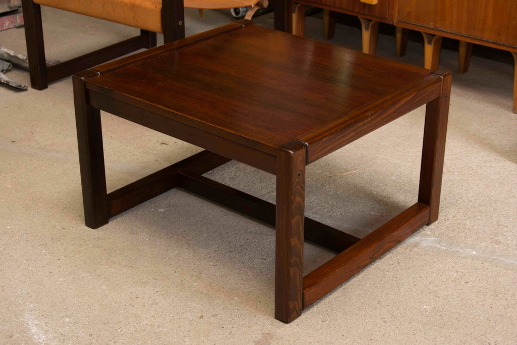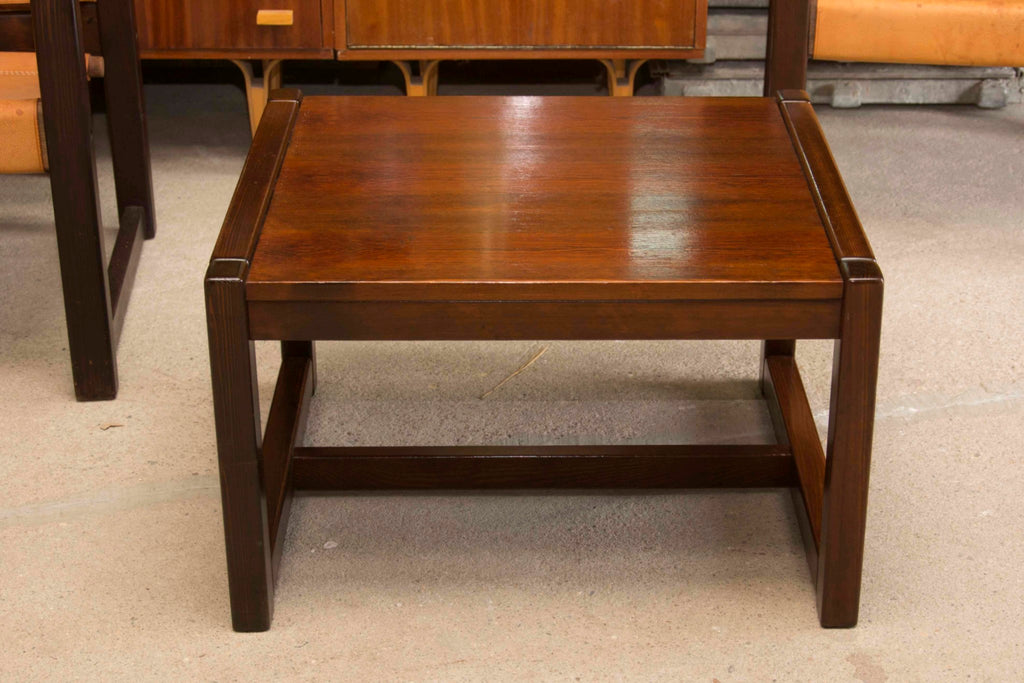 This living room set consists of a pair of leather Safari chairs with a coffee table, both designed by the Swedish designer Karin Mobring and produced in the 1970s. The chairs each feature a frame made of pine and the seating is made of very thick and sturdy cognac leather. The dimensions of the table are 62x28x57 cm (WxHxD). The chair dimensions: Height: 70 cm, Width 65 cm, Depth: 60 cm