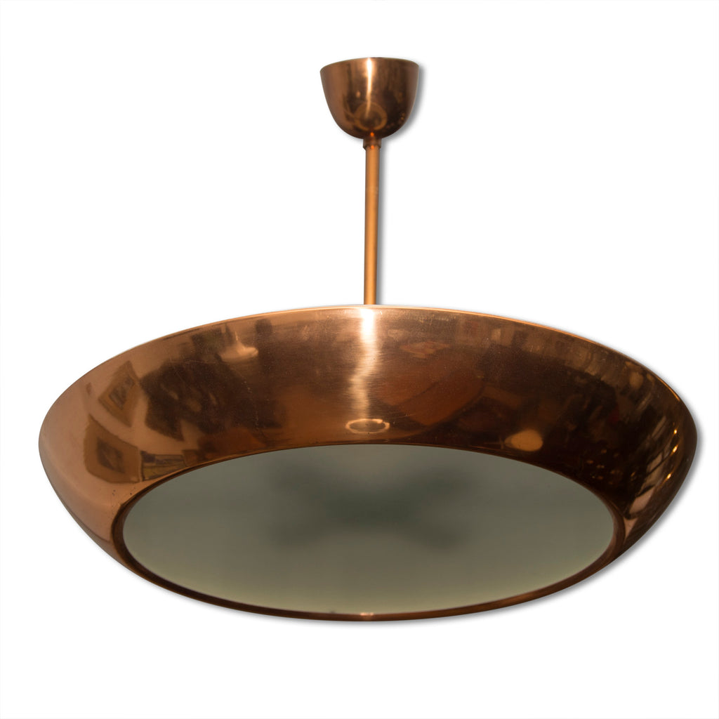 Simple brass pendant in the shape of "UFO" with central frosted glass disc.