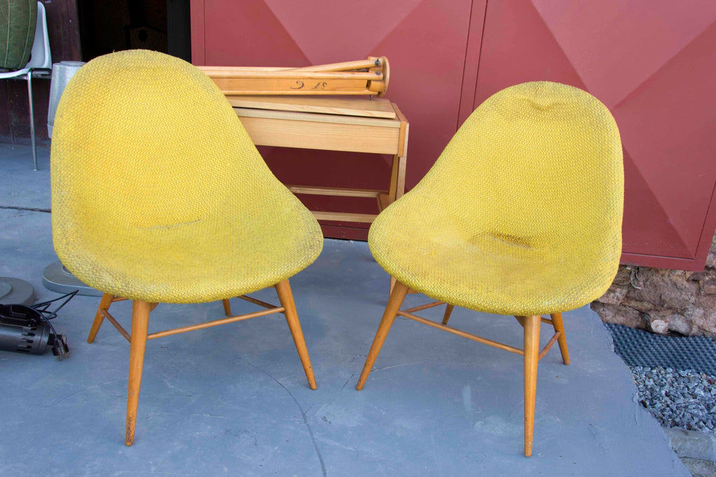 The chairs has a laminated construction and wooden legs. An upholstery is in its original condition an it shows signs of age and use due to some faded surfaces and minor upholstery defects. The chairs are overall in good Vintage condition. Price is for the pair