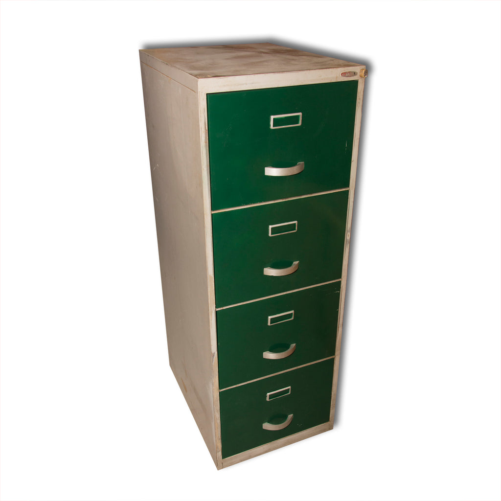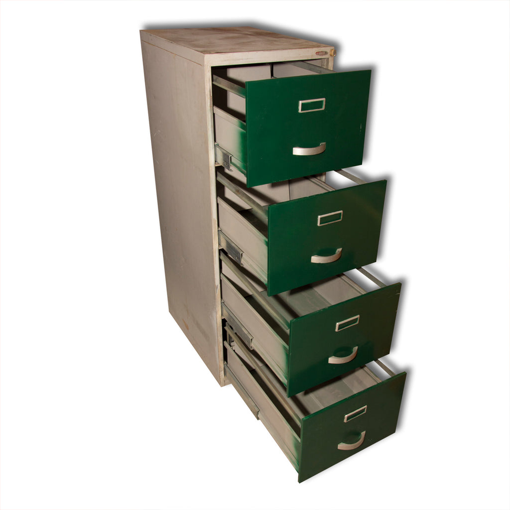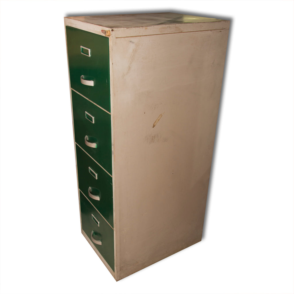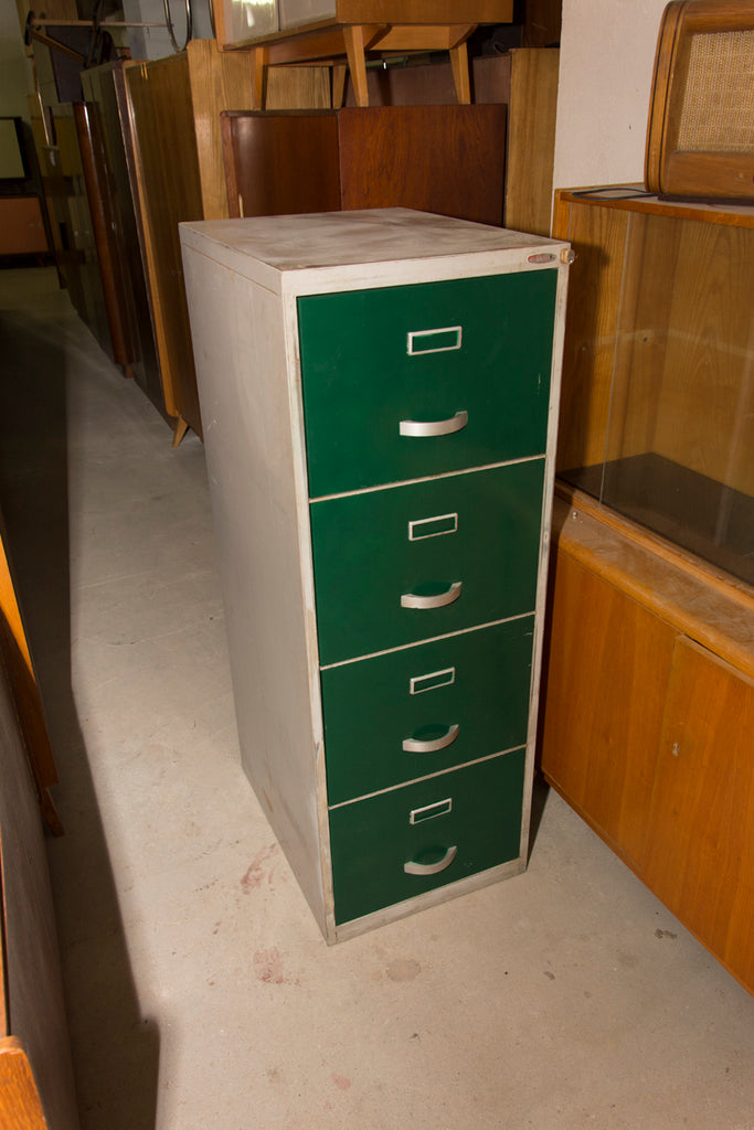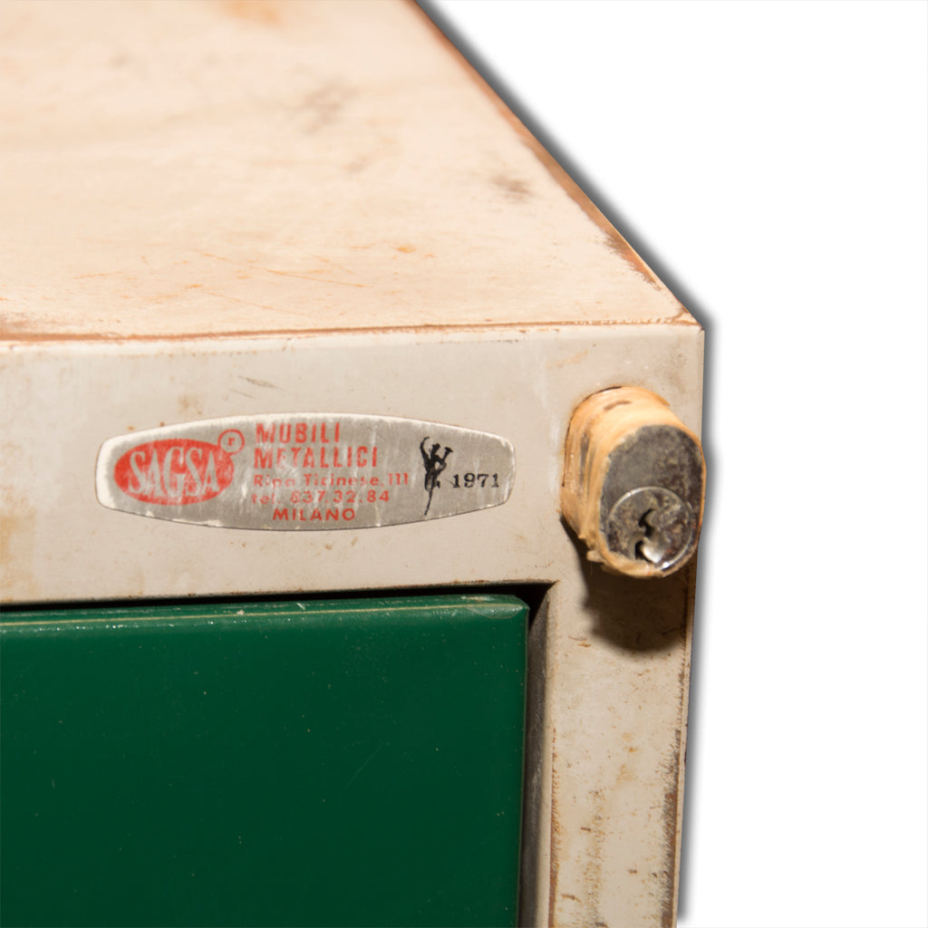 This grey-green metal filing cabinet was designed and manufactured by the company Sagsa in Italy in 1971. The four drawers are equipped with handles and brass label fields. The cabinet is generaly in good Vintage condition, it shows some signs of age and use. The drawers has been probably overlaid in the past. The key is not available.