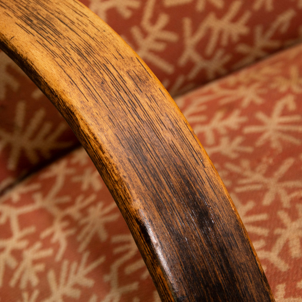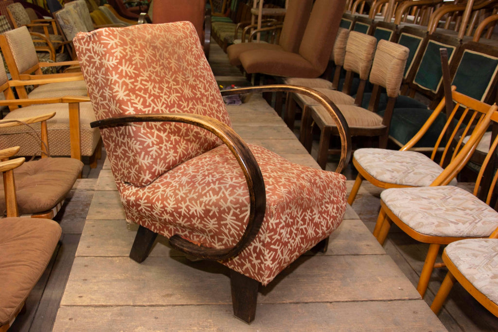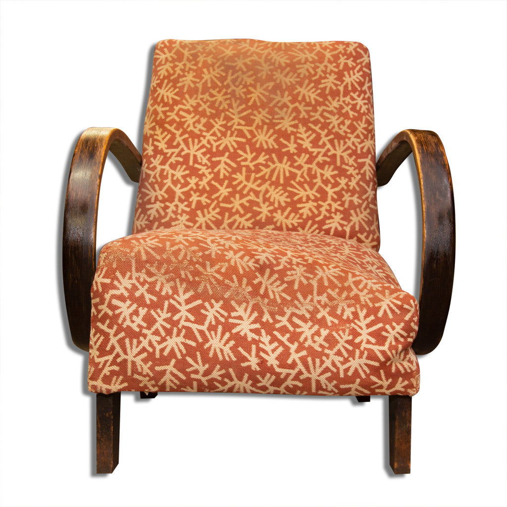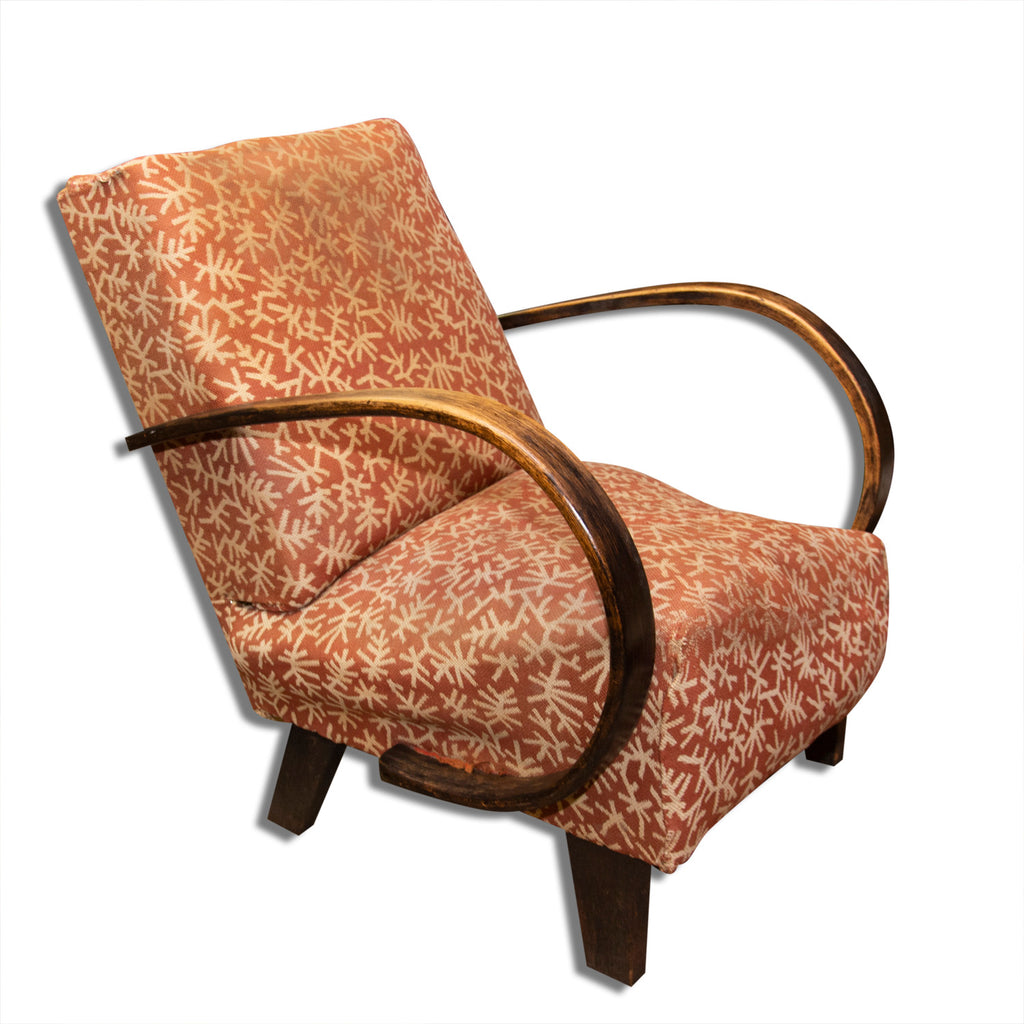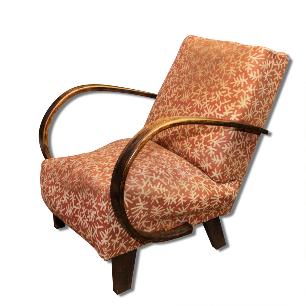 This bentwood armchair was designed and produced by Thonet in the 1930´s. The upholstery of the chair is in a poor condition. The wood is structuraly ok without any cracks etc. Bears some signs of age and use.