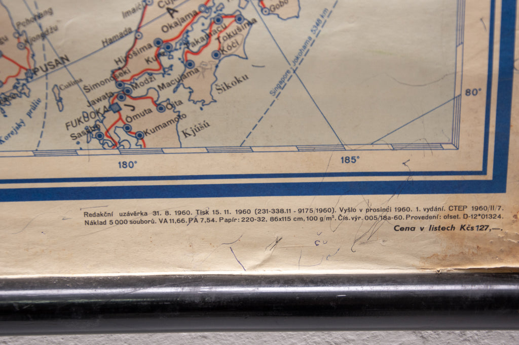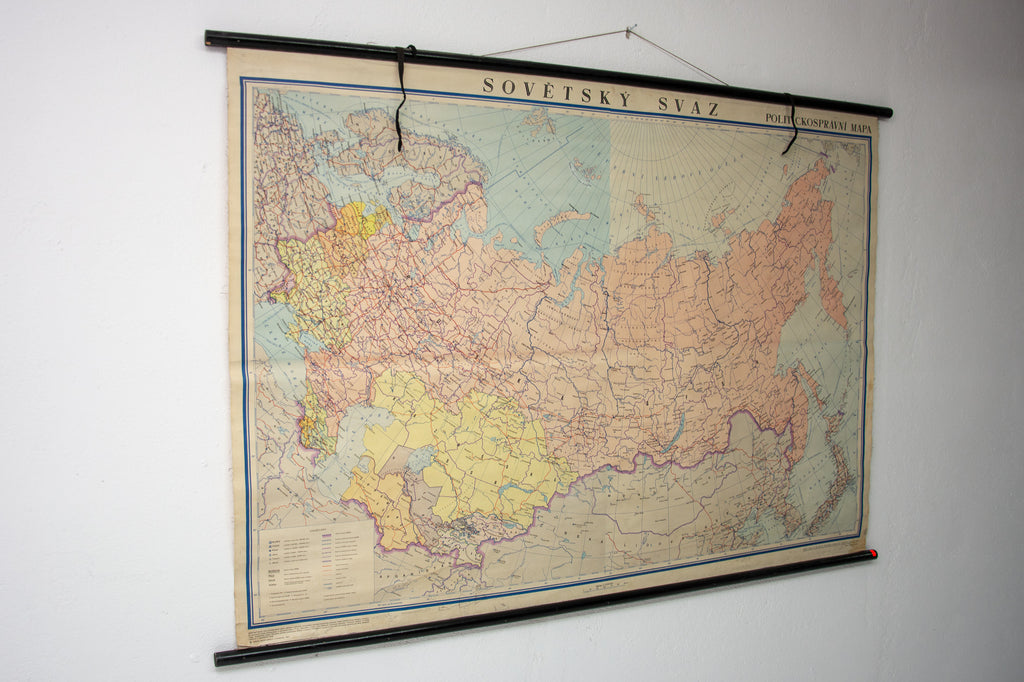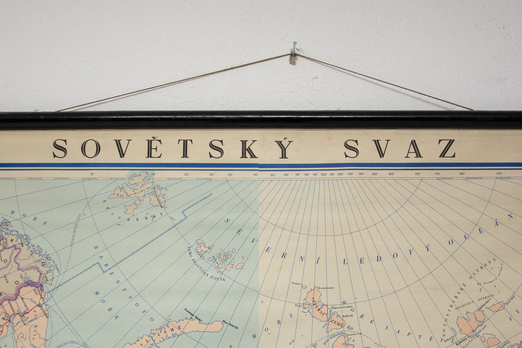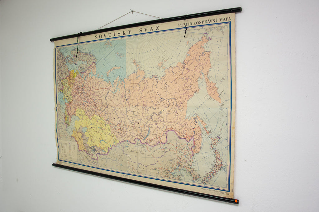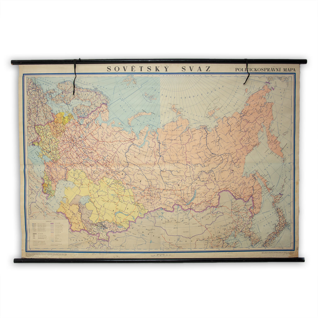Old Vintage school paper map of Soviet Union. It was produced in 1960 in the former Czechoslovakia. Map has on top and bottom wooden slats. It´s in good Vintage condition.