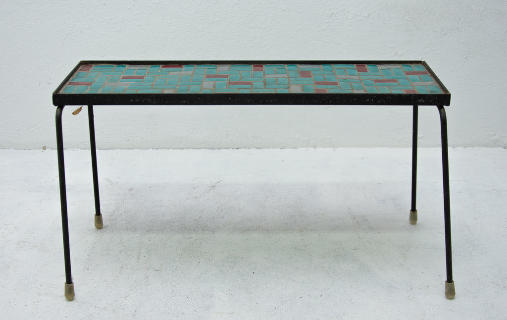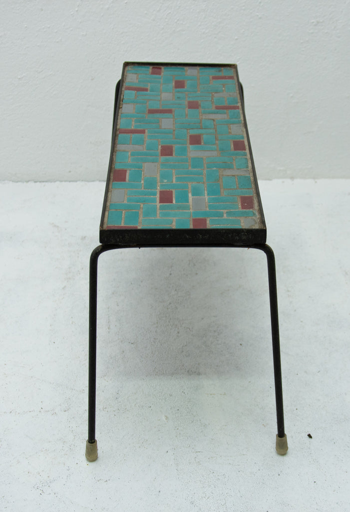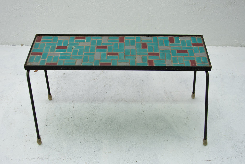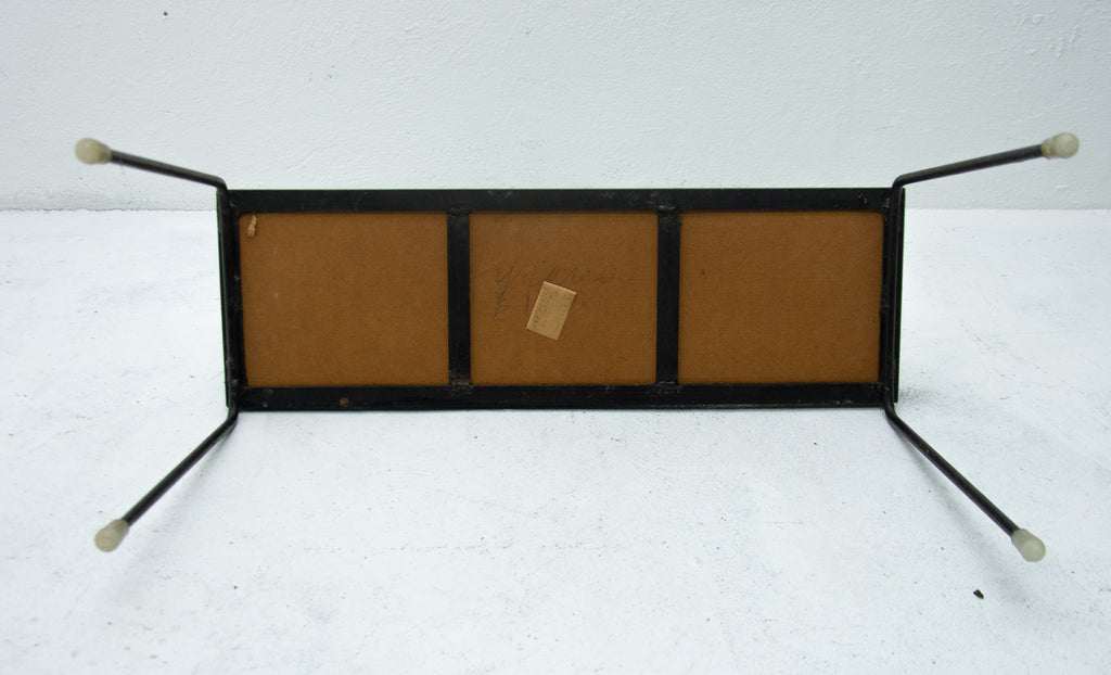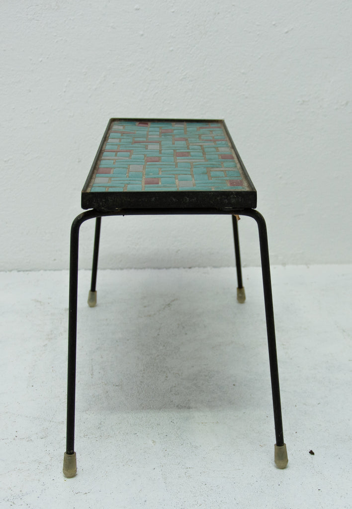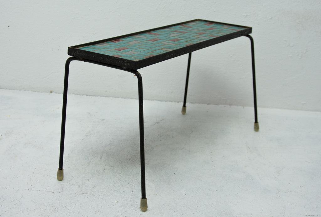 Mid-century very small flower table from the 1960´s. It´s associated with the world-famous EXPO 58 exhibition in Brussels. It was made in the former Czechoslovakia. It features an iron black lacquered structure and ceramic table top. The table is in good Vintage condition without any damage, bears signs of age and using.