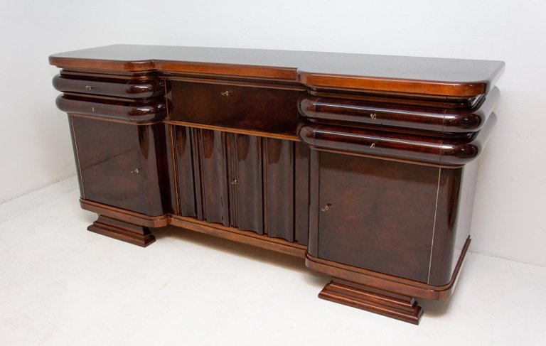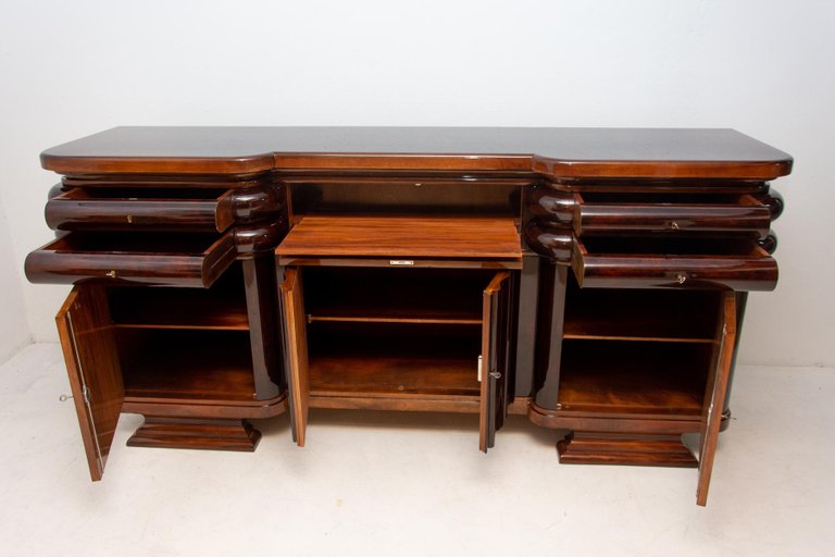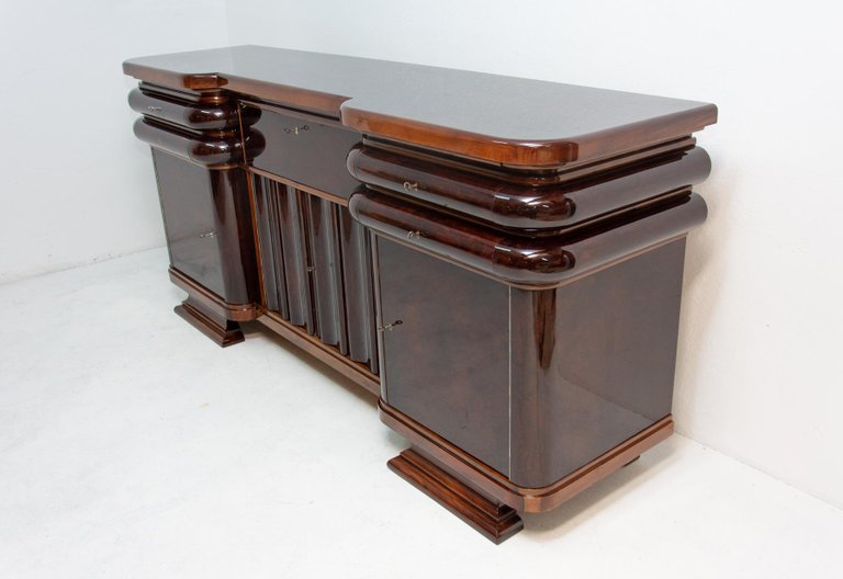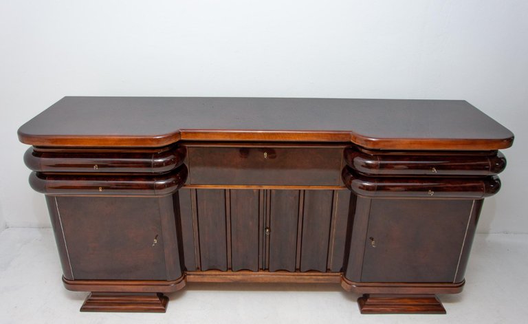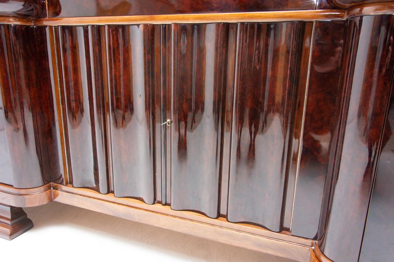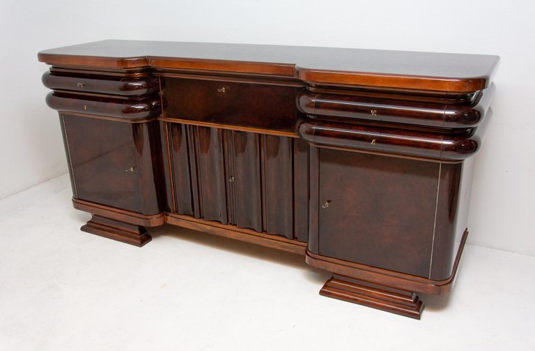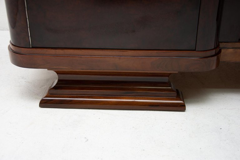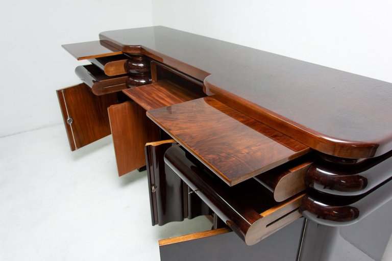 This exceptional sideboard or buffet was made in Bohemia in the 1930s by the famous local furniture company Jan stícha-Lísov. It´s made of solid wood and veneered in walnut. It features a large storage space and unique rounded shapes of the drawers,. It´s in excellent condition, fully restored to a high gloss finish with polyurethane.