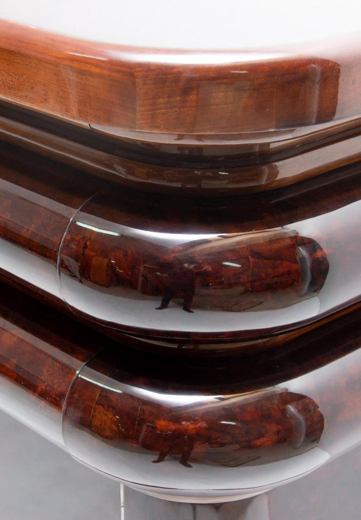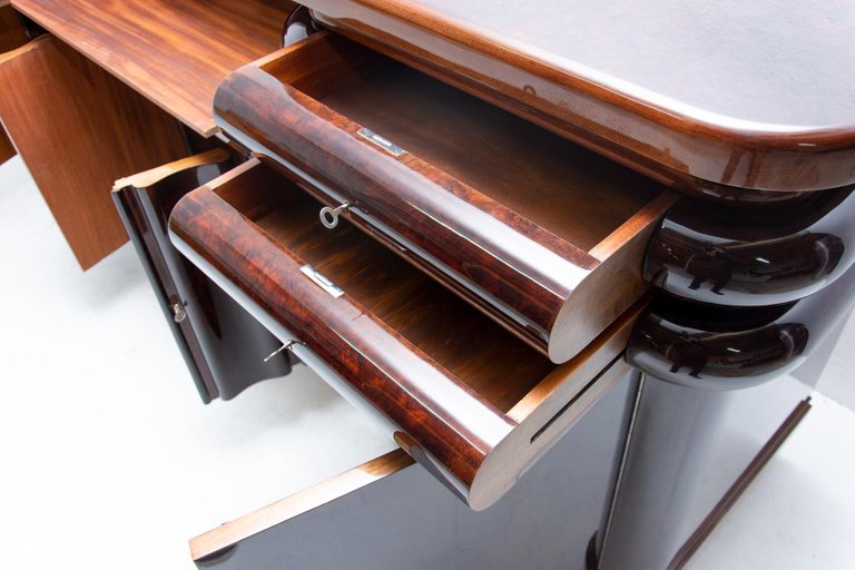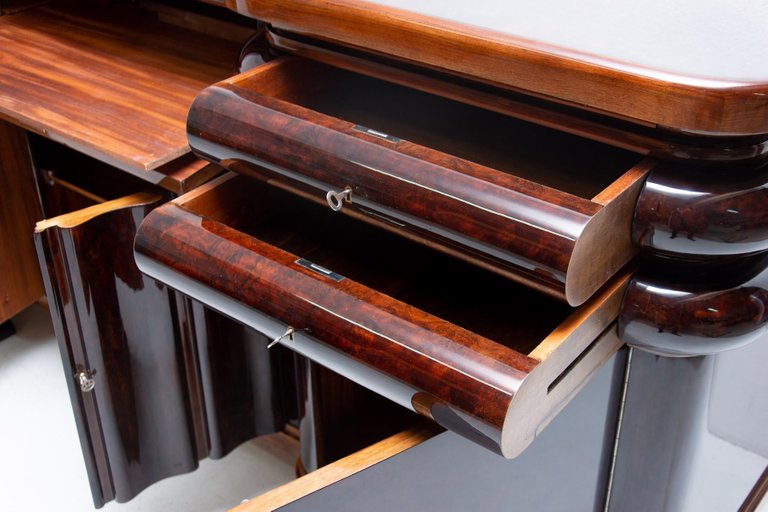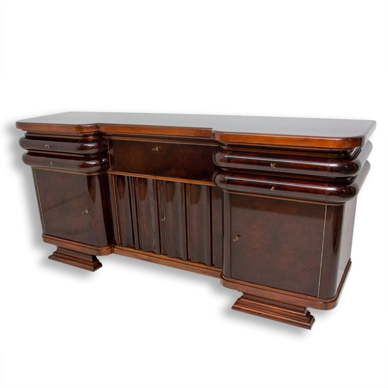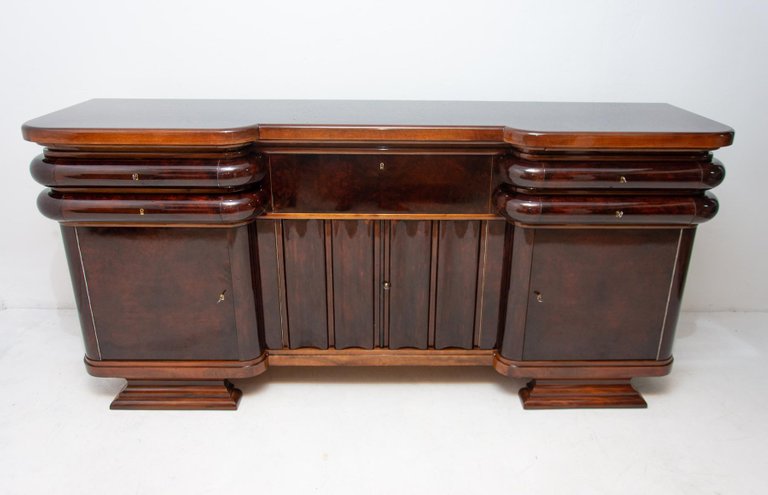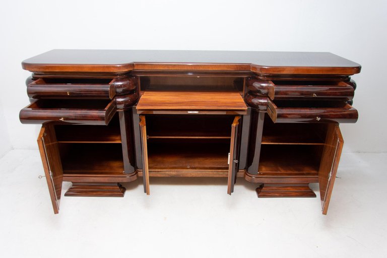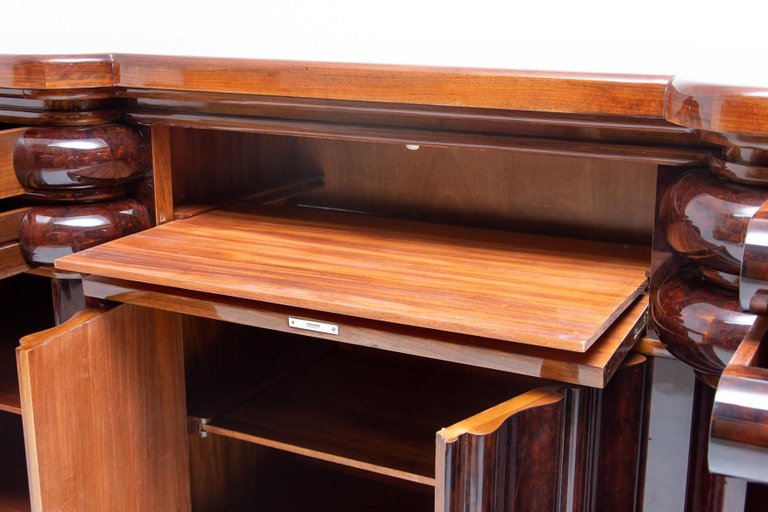 This exceptional sideboard or buffet was made in Bohemia in the 1930s by the famous local furniture company Jan stícha-Lísov. It´s made of solid wood and veneered in walnut. It features a large storage space and unique rounded shapes of the drawers,. It´s in excellent condition, fully restored to a high gloss finish with polyurethane.