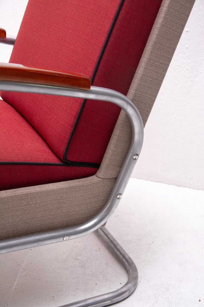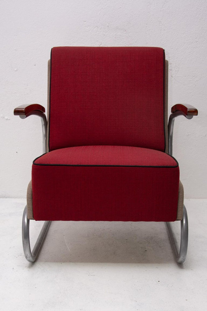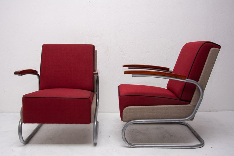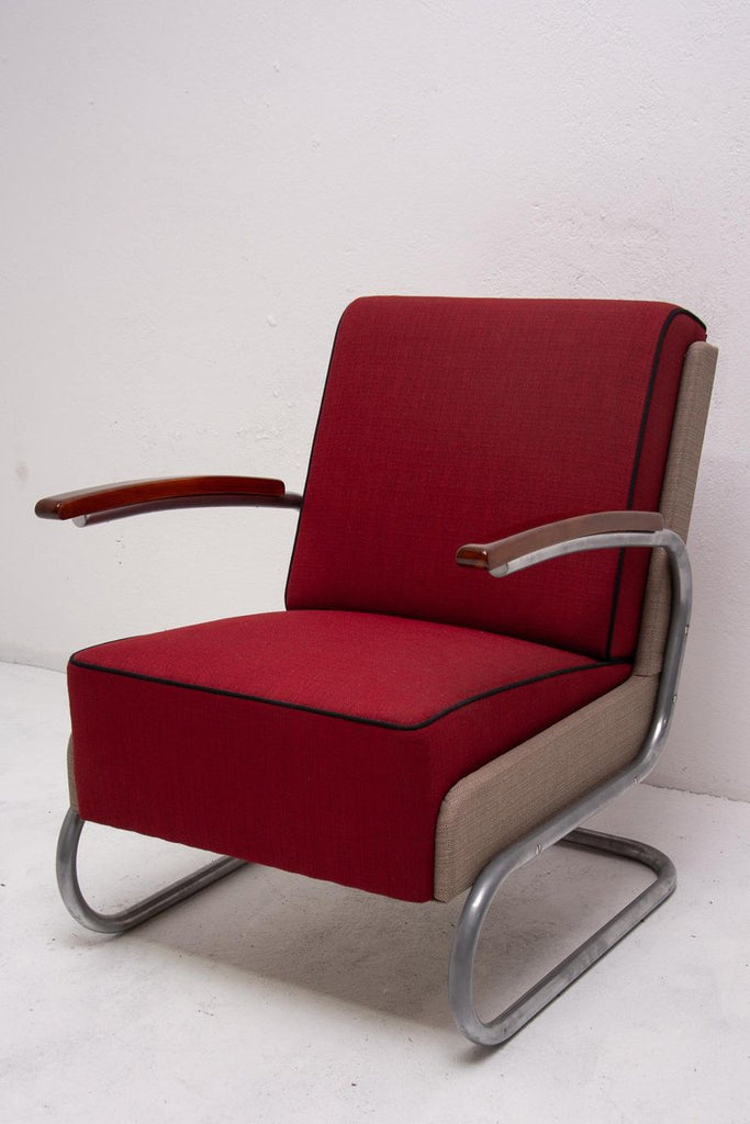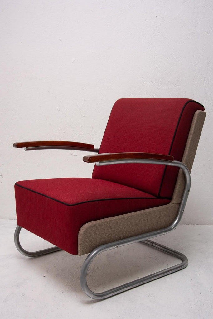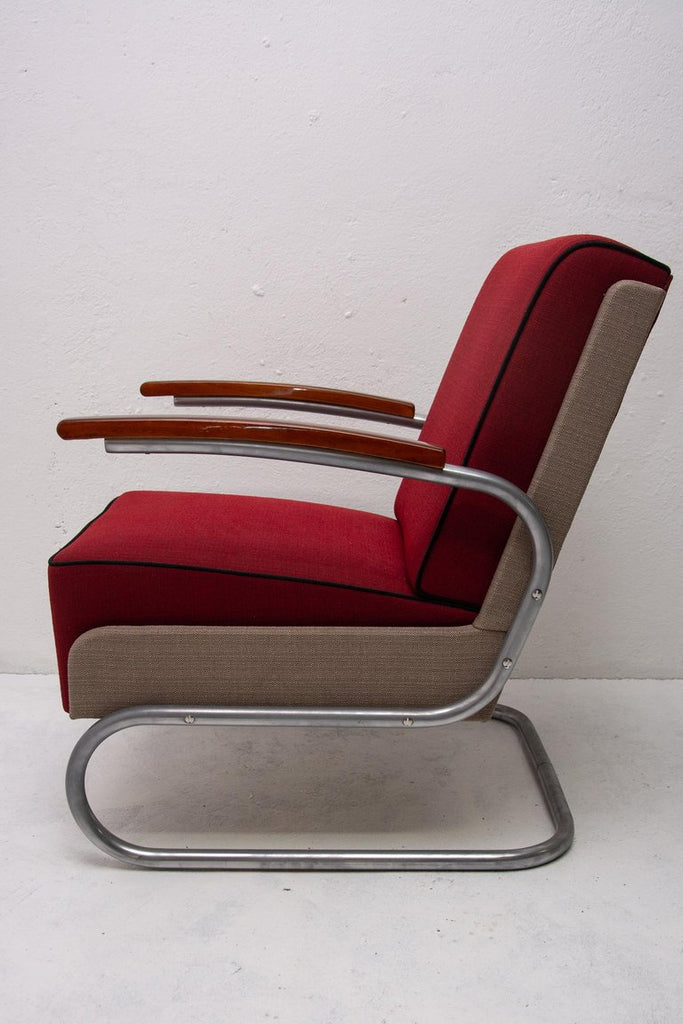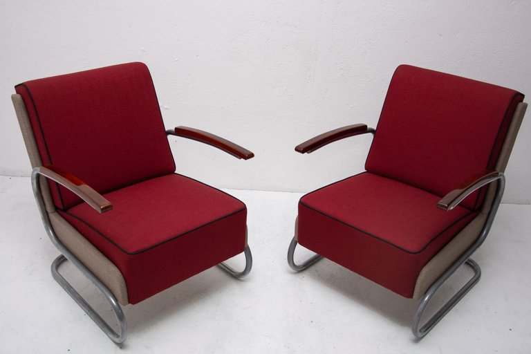 These armchairs was originally designed by W. H. Gispen in 1933 for Thonet. Then were produced under Thonet licence by Mucke Melder and Kovona Company in the Czechoslovakia. The armchairs are in excellent condition, expertly renovated metal frame, newly coated armrests lacquered with high gloss polyurethane, completely new upholstery.