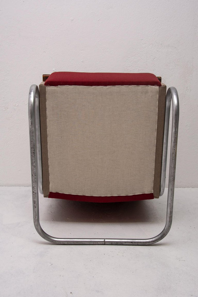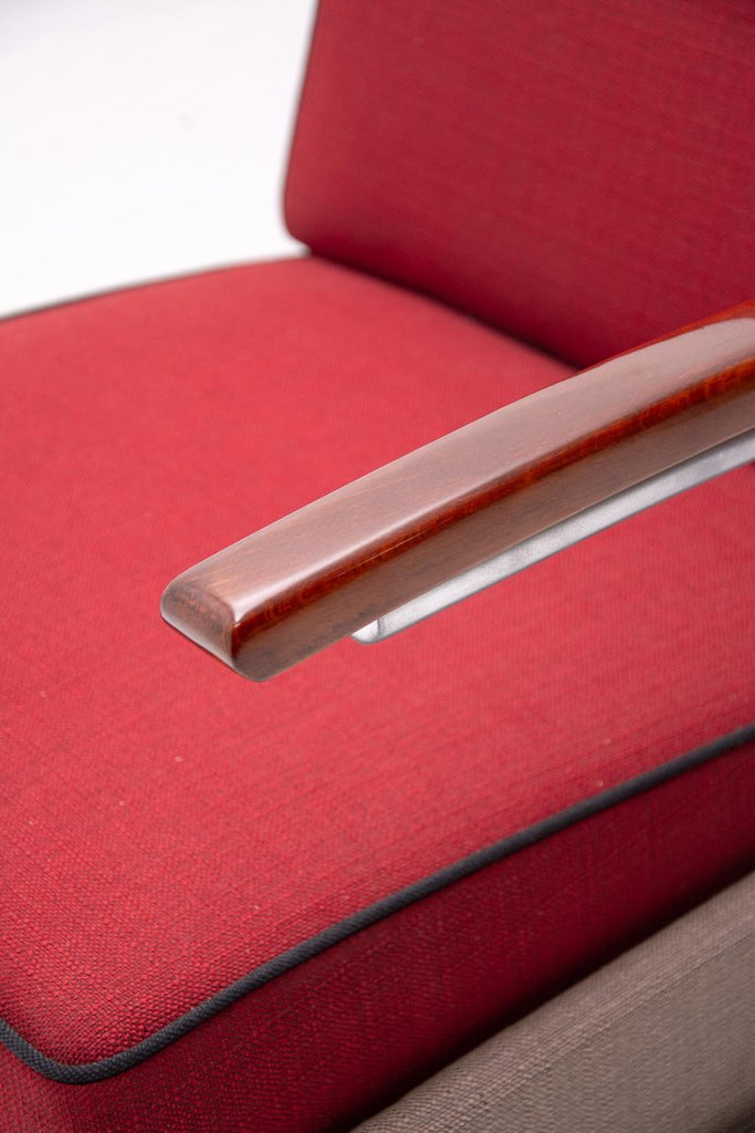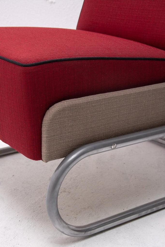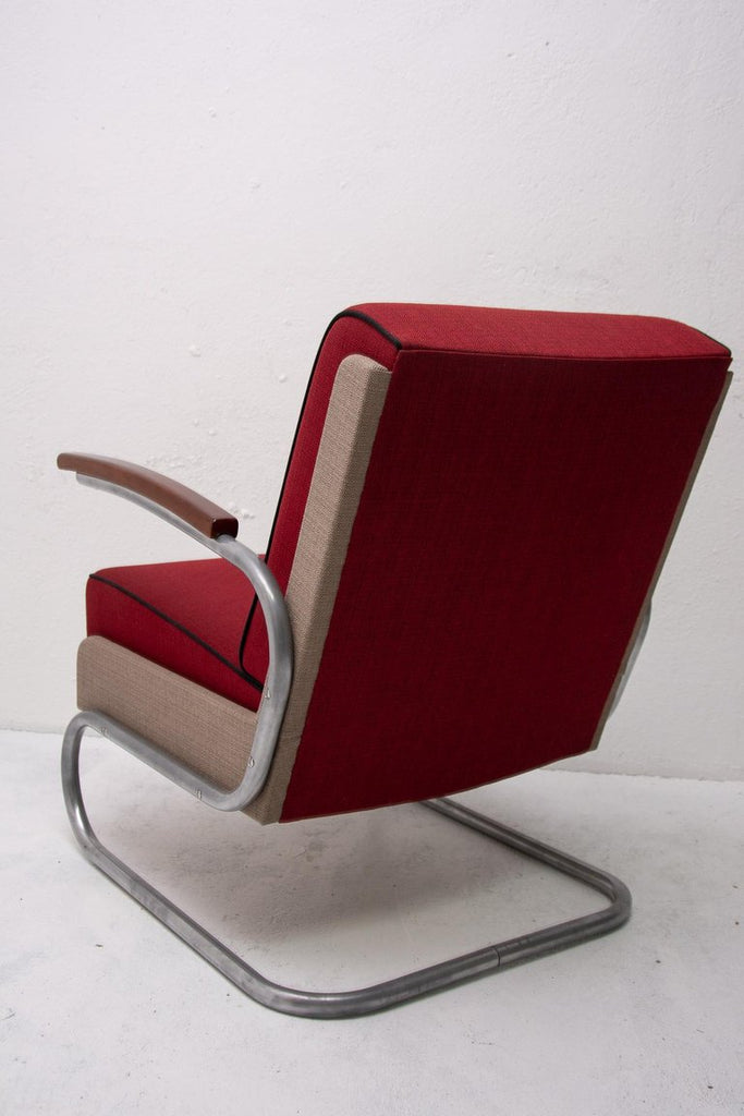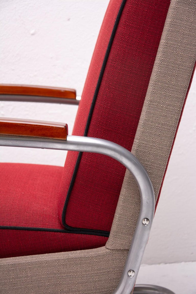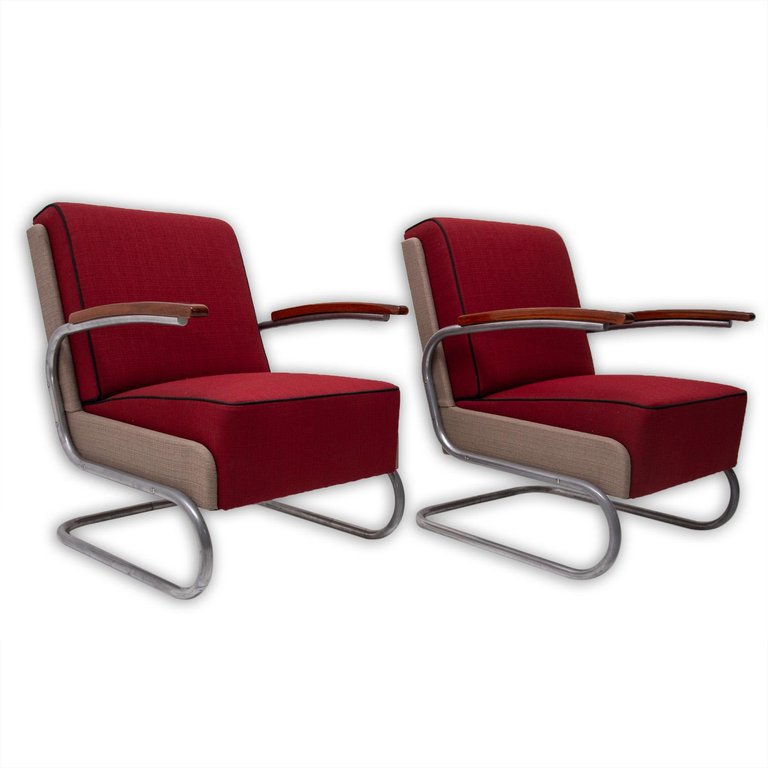 These armchairs was originally designed by W. H. Gispen in 1933 for Thonet. Then were produced under Thonet licence by Mucke Melder and Kovona Company in the Czechoslovakia. The armchairs are in excellent condition, expertly renovated metal frame, newly coated armrests lacquered with high gloss polyurethane, completely new upholstery.