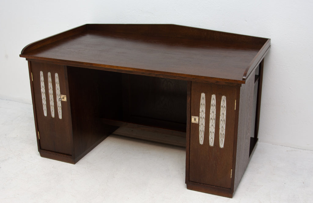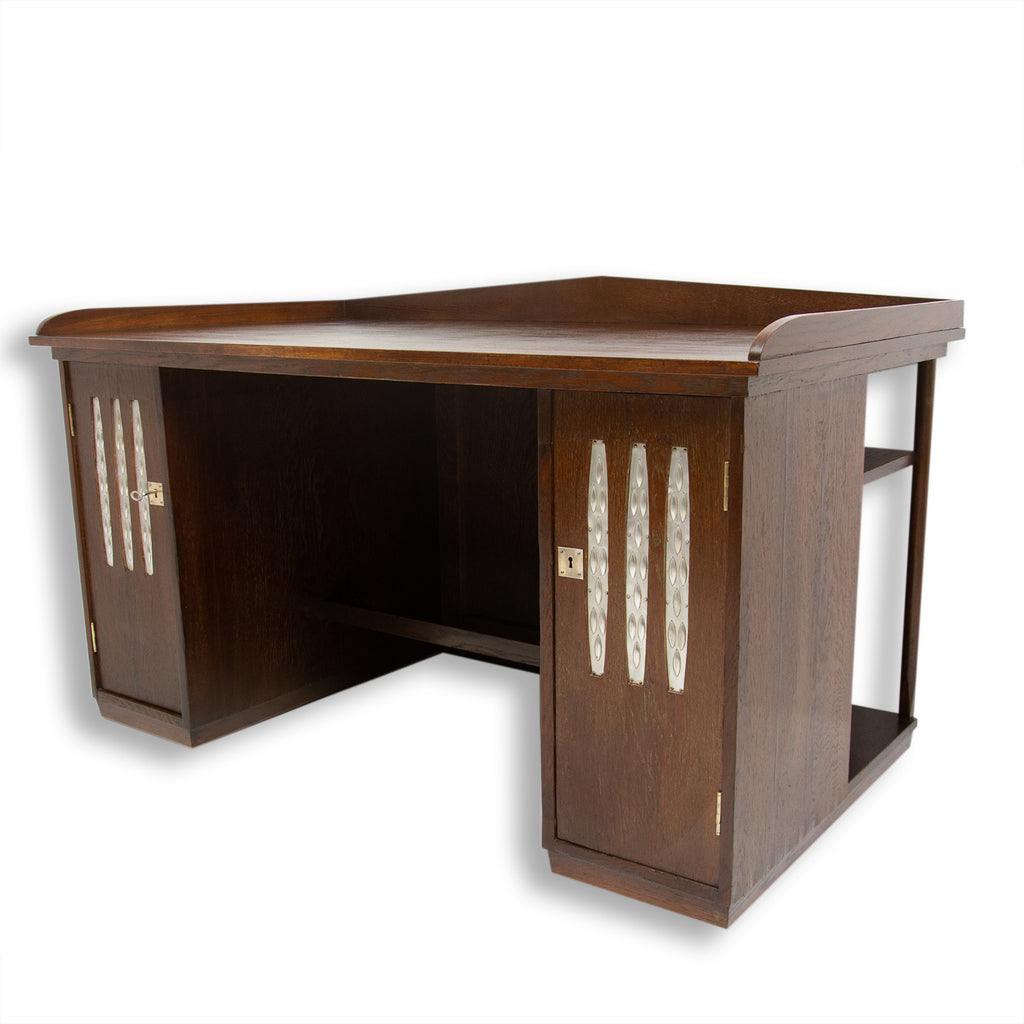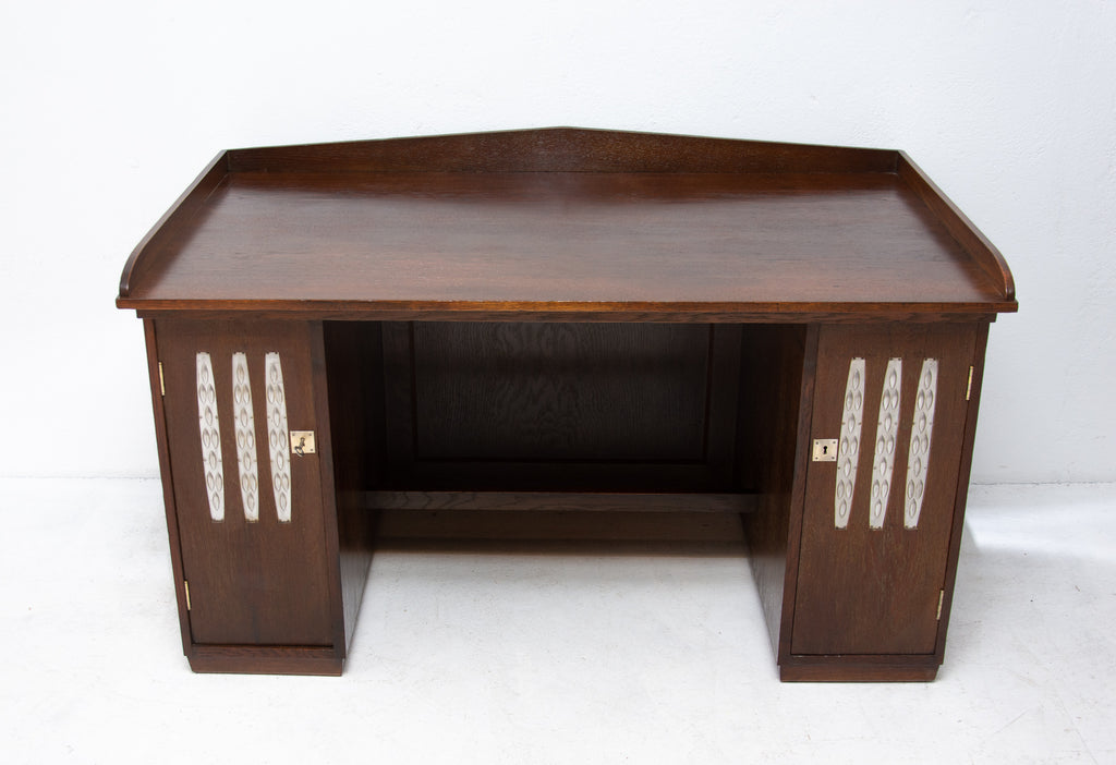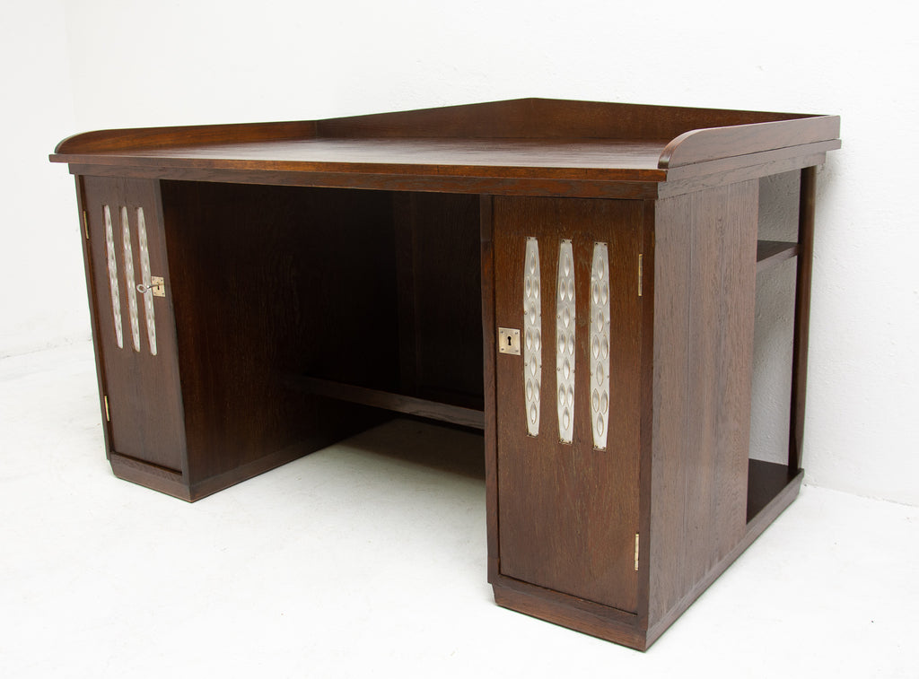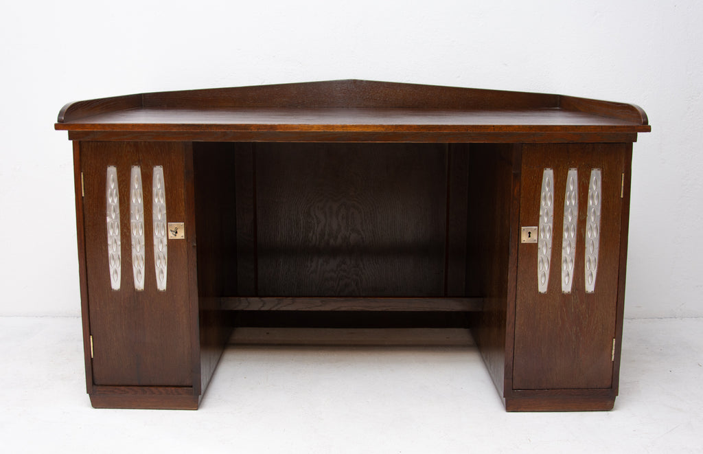 This Secession writing desk was produced in Austria-Hungary, circa 1910. It is made of oakwood. This is an example of geometric Art Nouveau in furniture design. The table is characterized by traditional elements of this style. Brass decorative elements are fitted on the door front. From behind The table reminids the Art Nouveau building of the theater. The table is in excellent condition after a complete renovation.