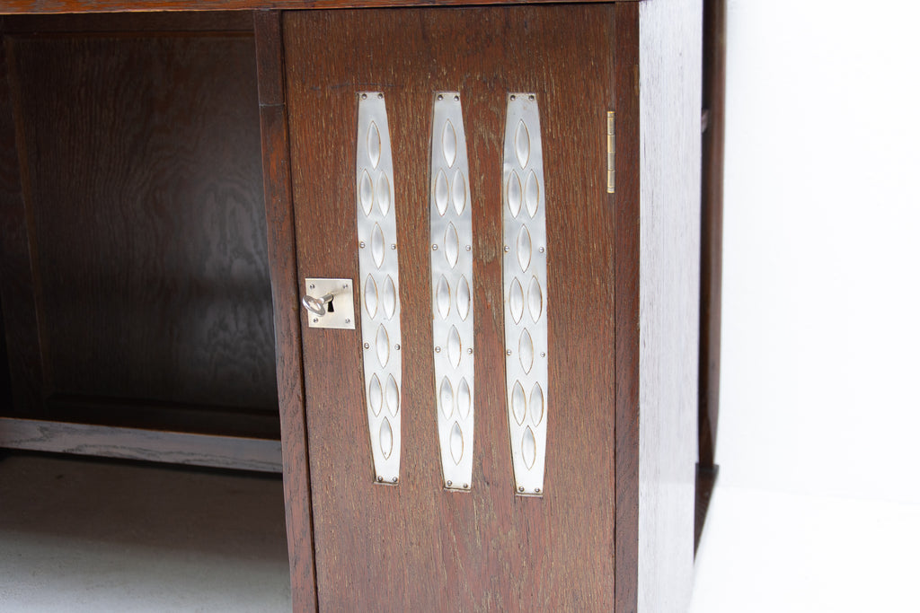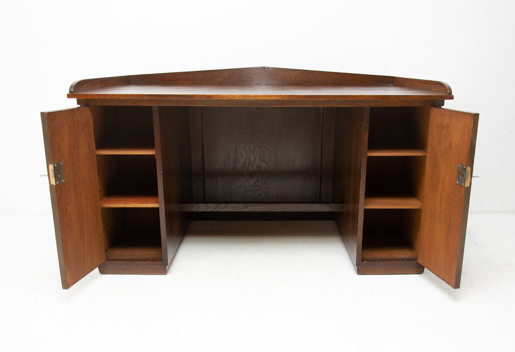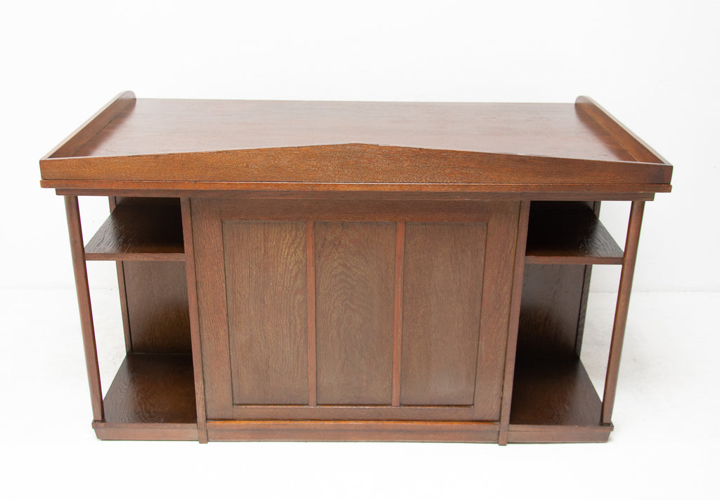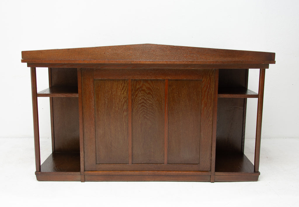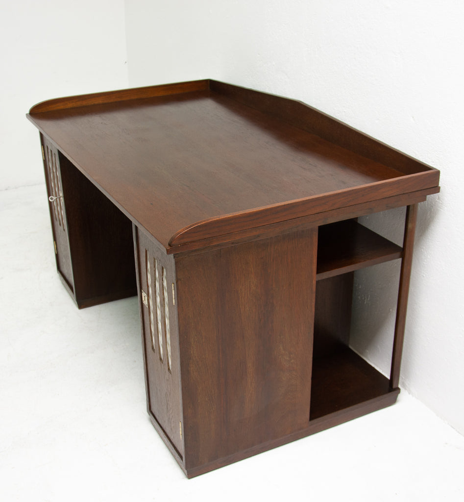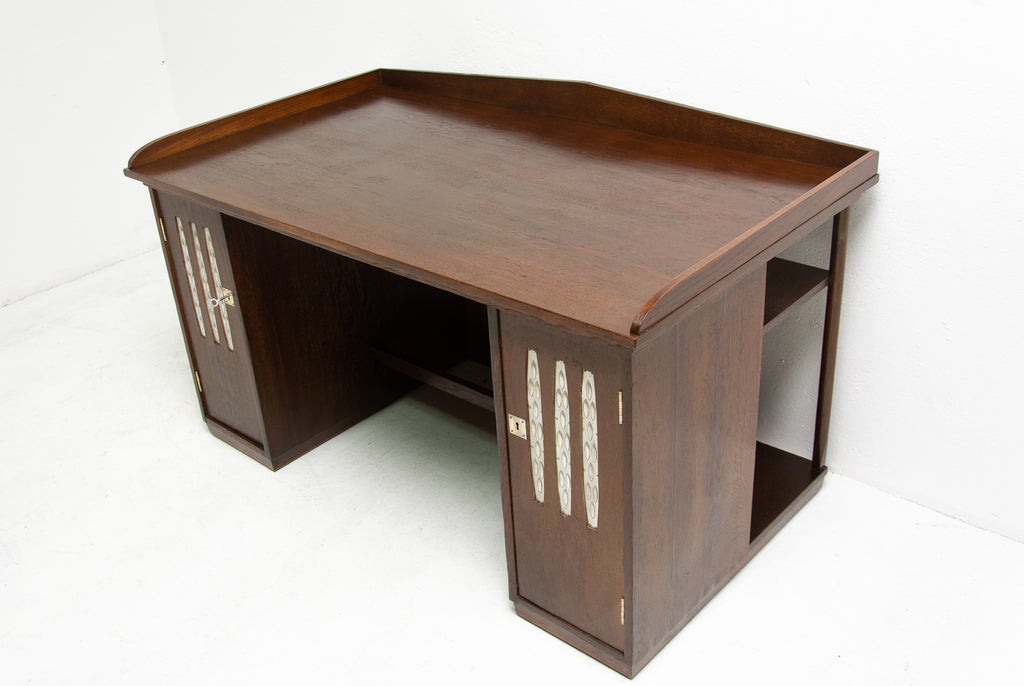 This Secession writing desk was produced in Austria-Hungary, circa 1910. It is made of oakwood. This is an example of geometric Art Nouveau in furniture design. The table is characterized by traditional elements of this style. Brass decorative elements are fitted on the door front. From behind The table reminids the Art Nouveau building of the theater. The table is in excellent condition after a complete renovation.