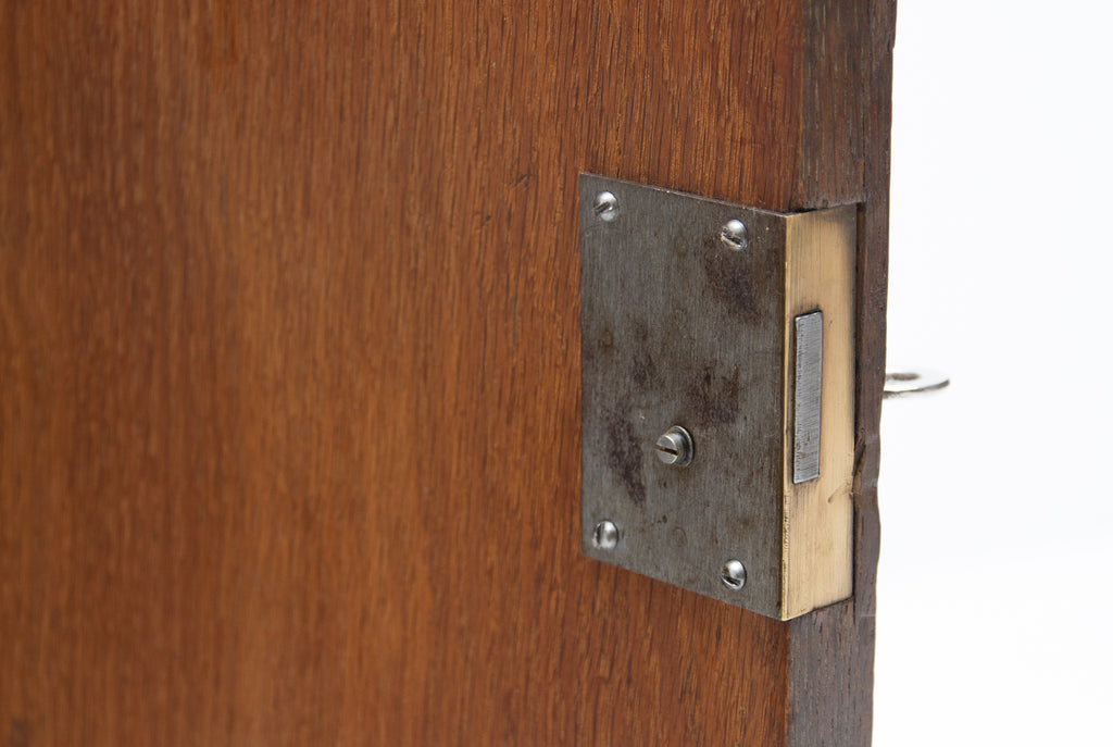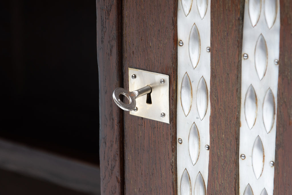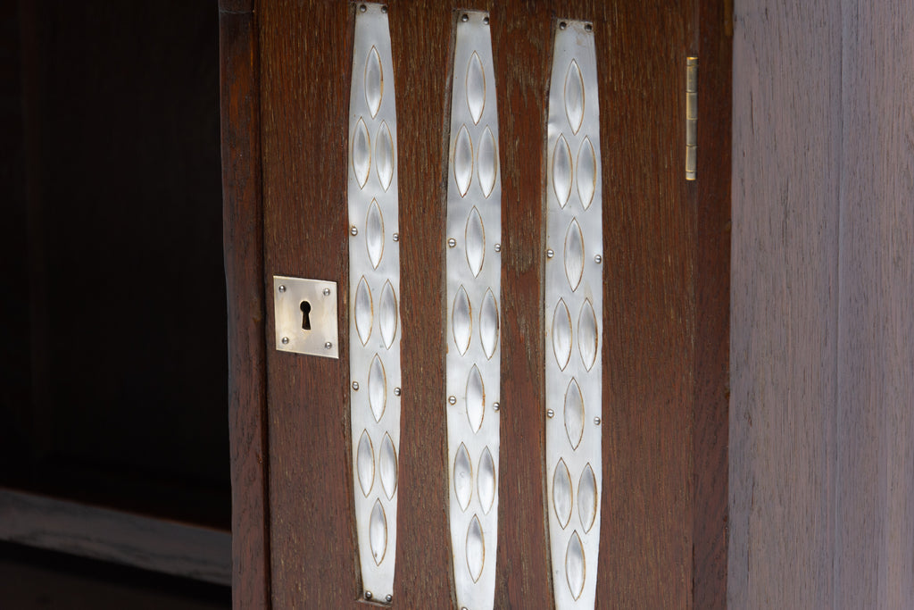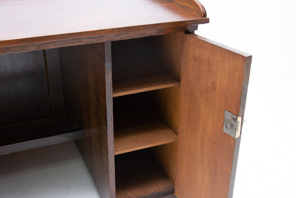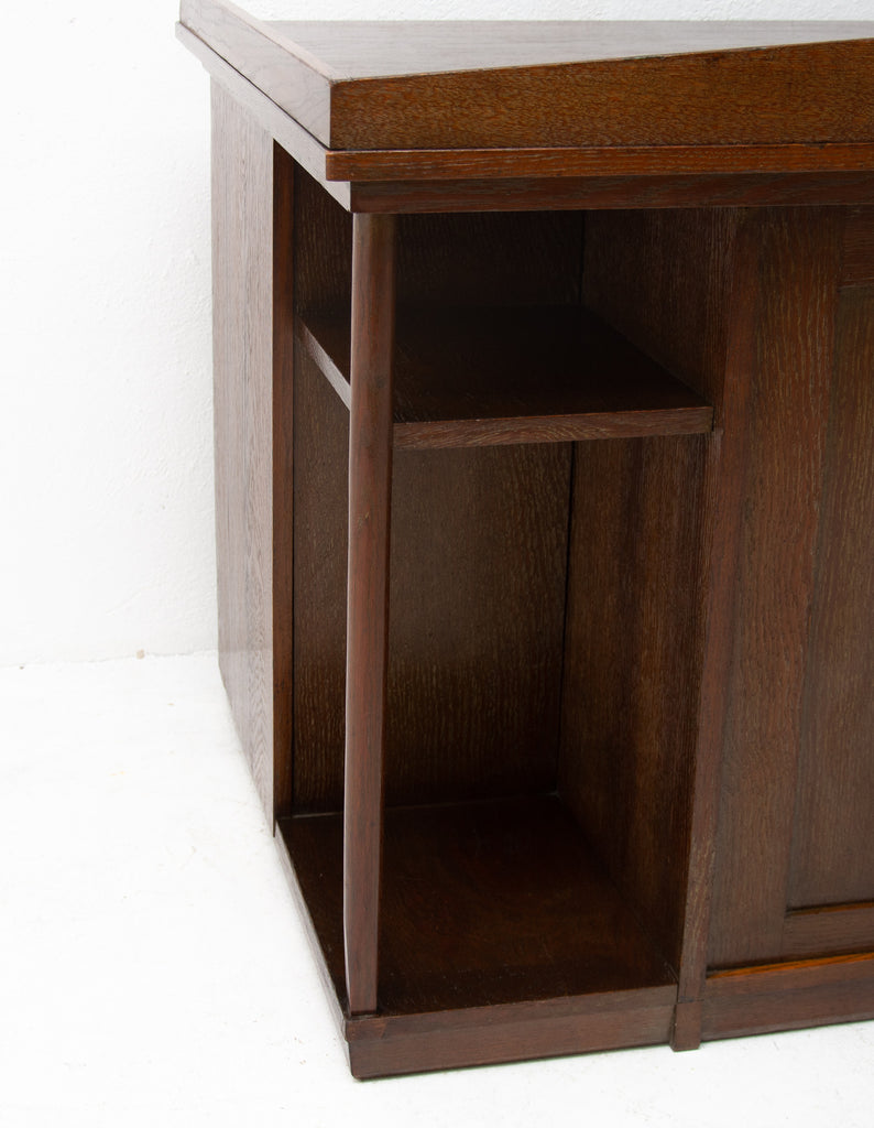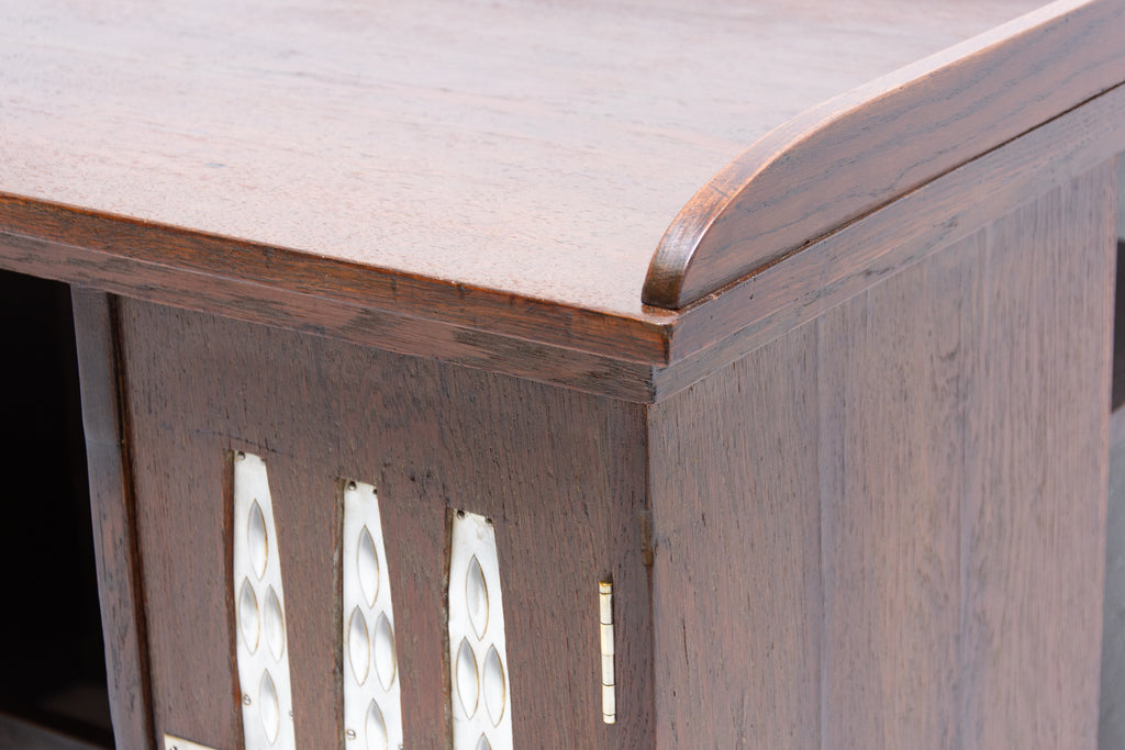 This Secession writing desk was produced in Austria-Hungary, circa 1910. It is made of oakwood. This is an example of geometric Art Nouveau in furniture design. The table is characterized by traditional elements of this style. Brass decorative elements are fitted on the door front. From behind The table reminids the Art Nouveau building of the theater. The table is in excellent condition after a complete renovation.
