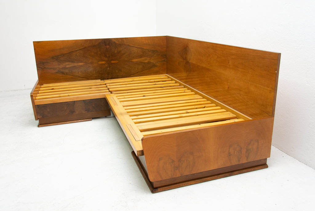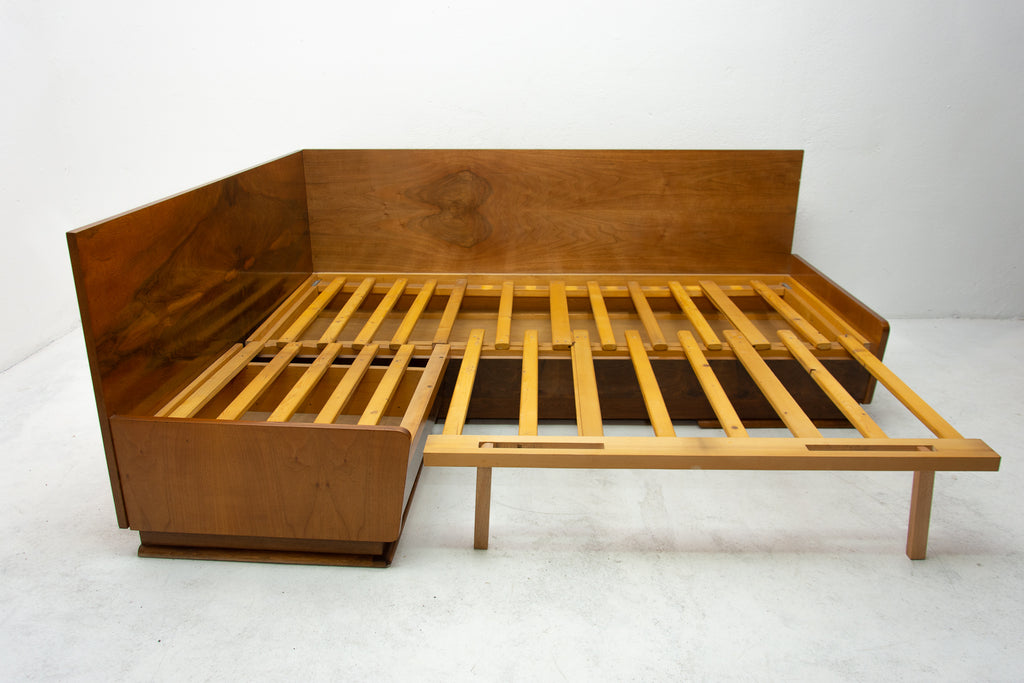 Mid century corner sofa bed designed by Jindřich Halabala. It was made in the former Czechoslovakia in the 1950´s. This sofa features a wooden structure that is veneered in the walnut and a storage space for bedding. Sofa is adjustable for sleeping and is in very good condition. Upholstery bears signs of age and using.