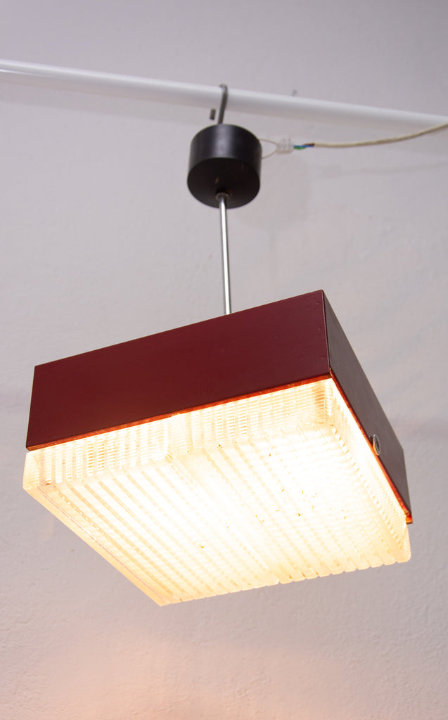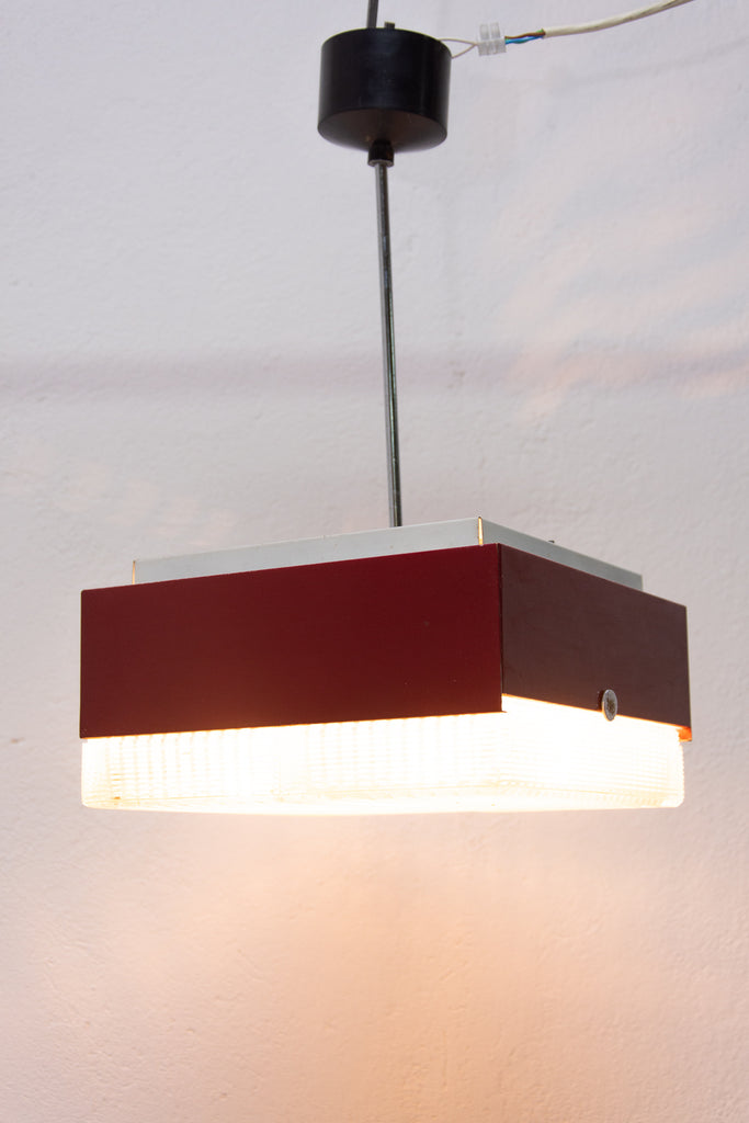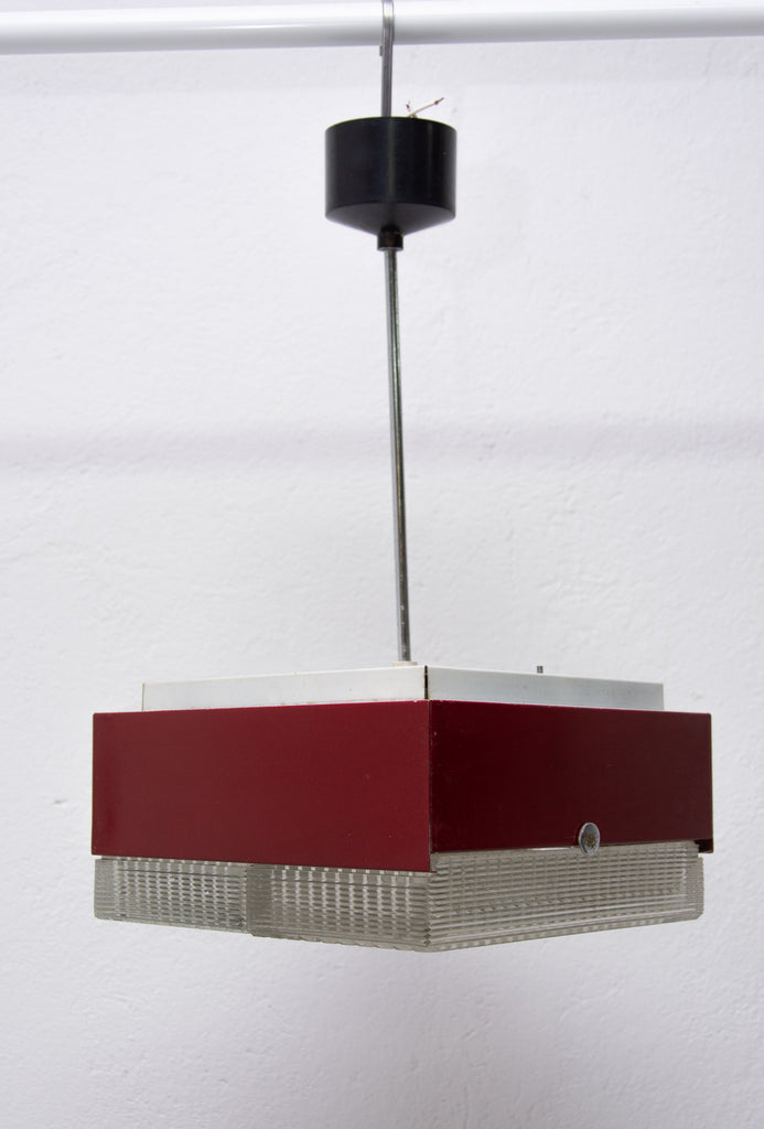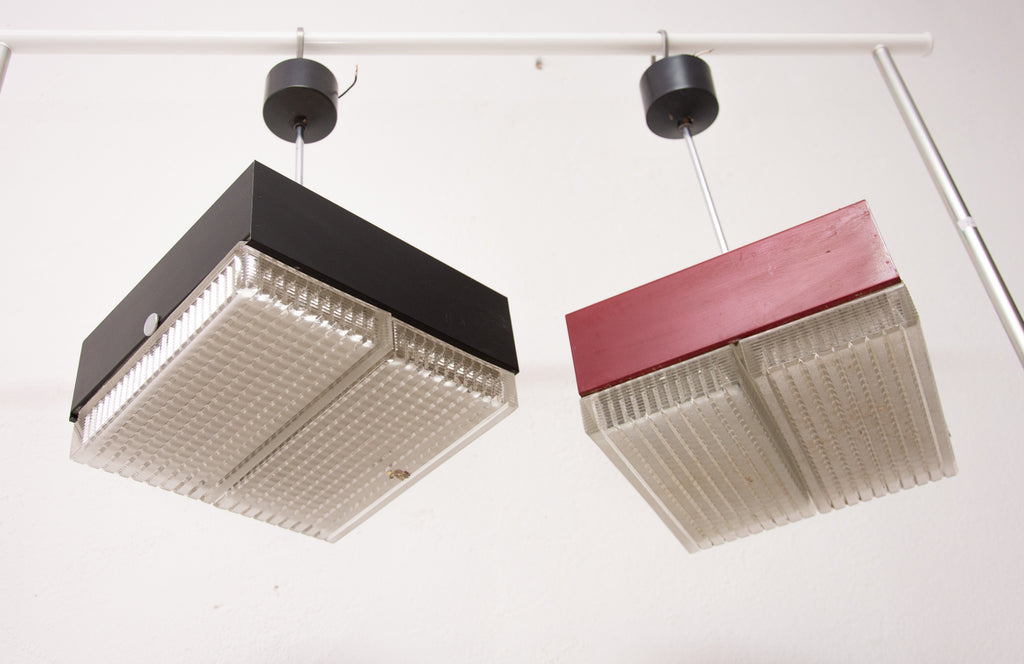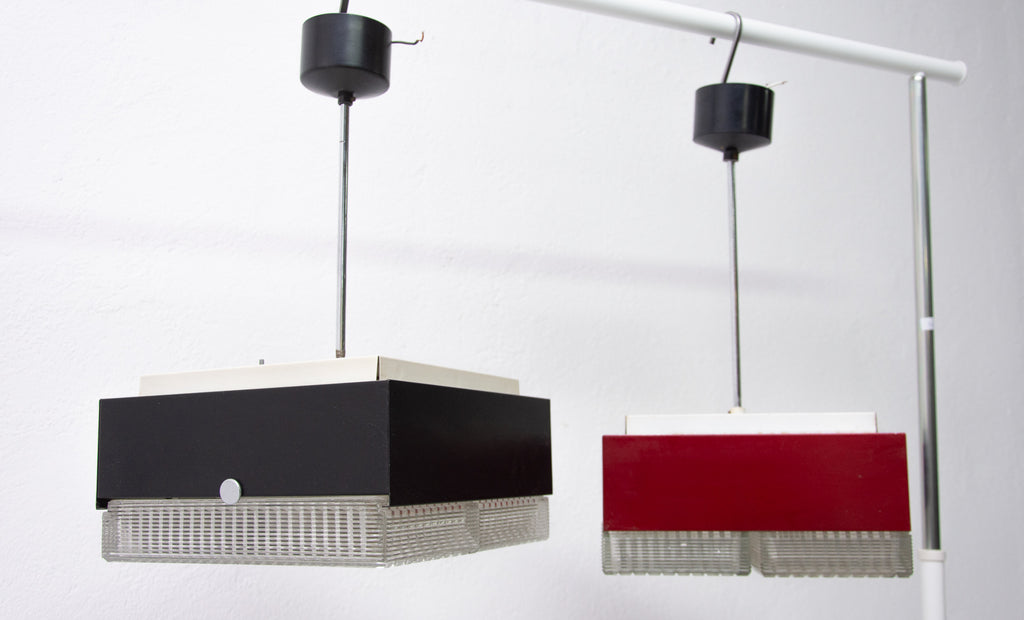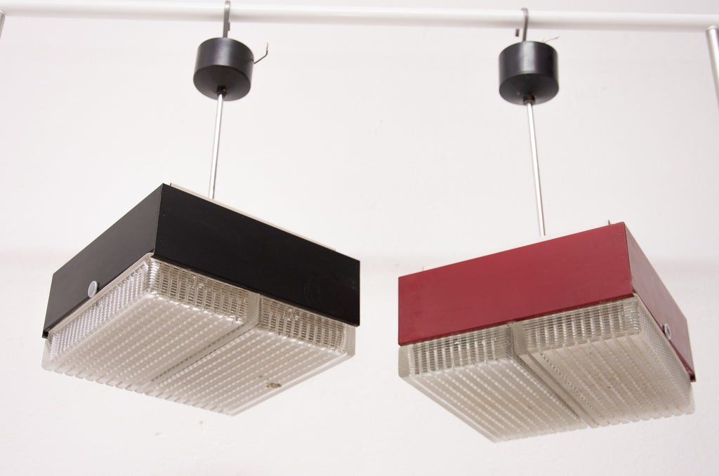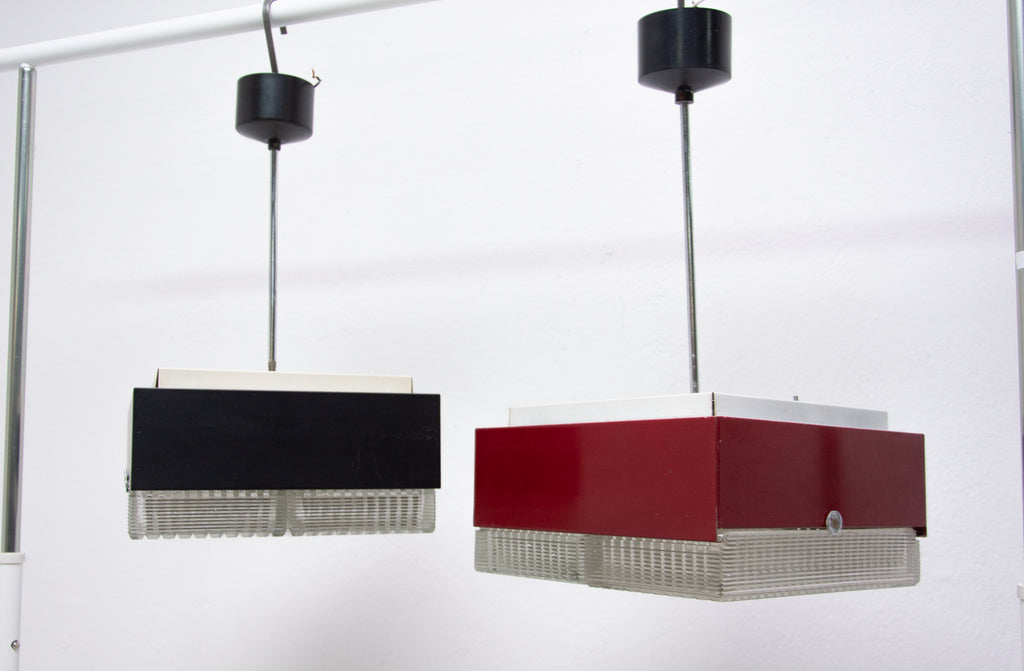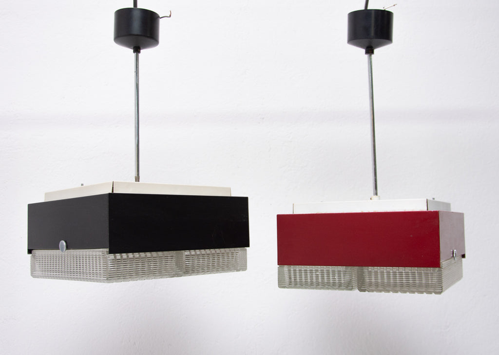 These pendant lamps were designed by Napako company and were made in the former Czechoslovakia in the 1970´s. It features a chromed steel frame and sheet metal and glass shade. The first is dark red and the second one is black. Both in good Vintage condition, bears signs of age and using, newly wired. Price is for the pair.