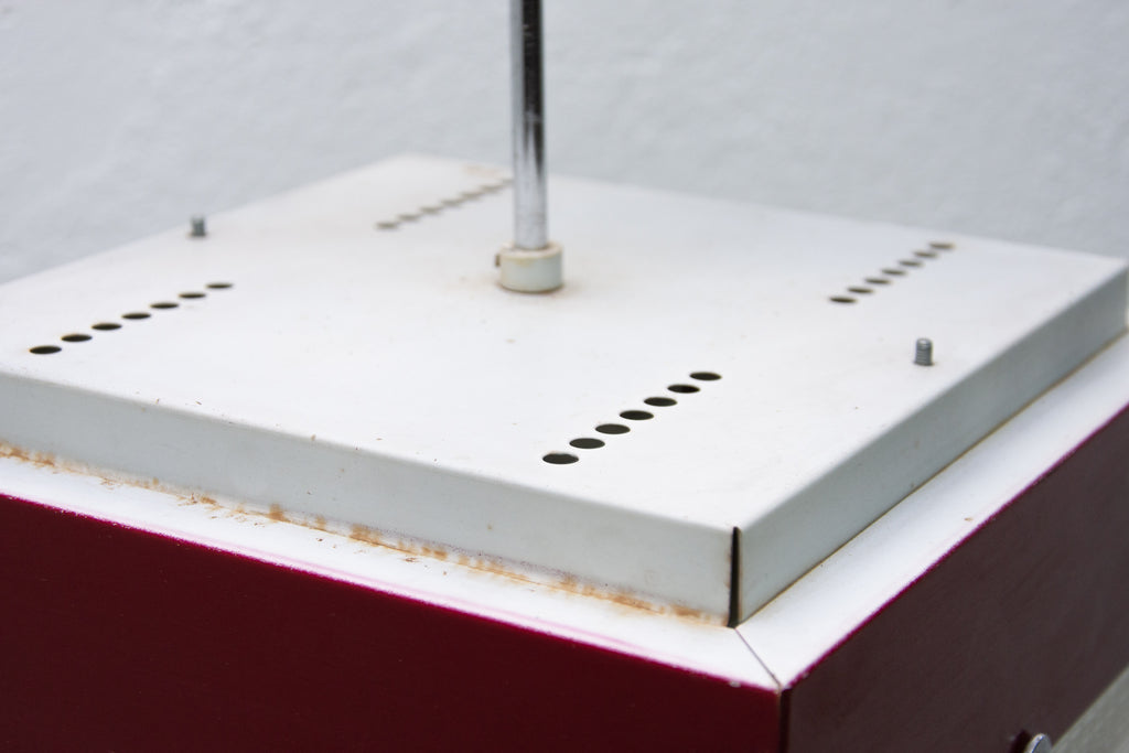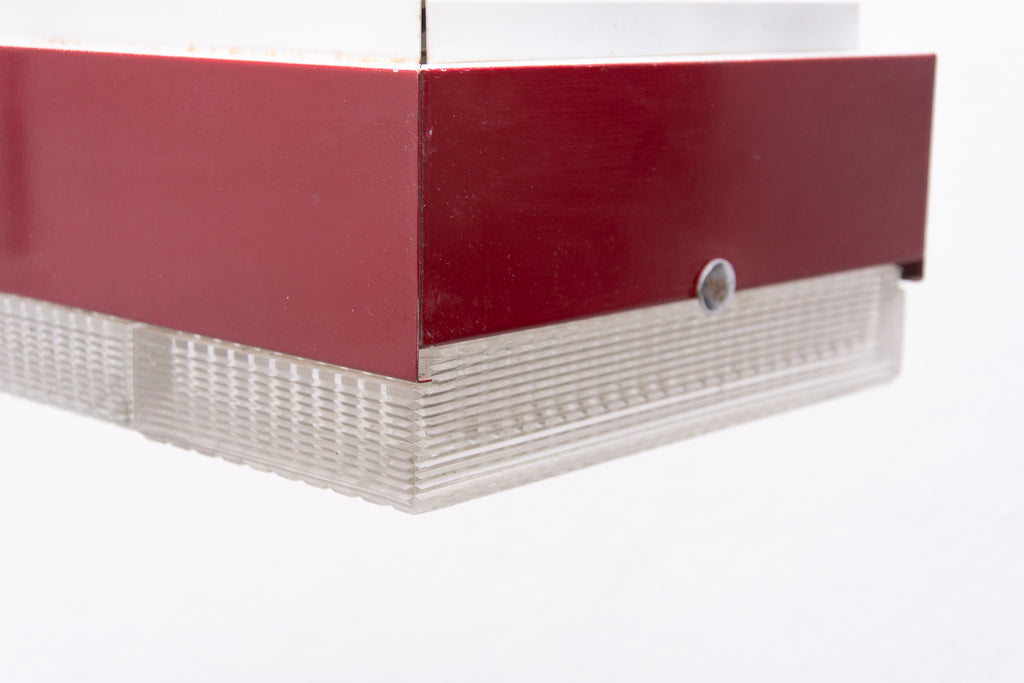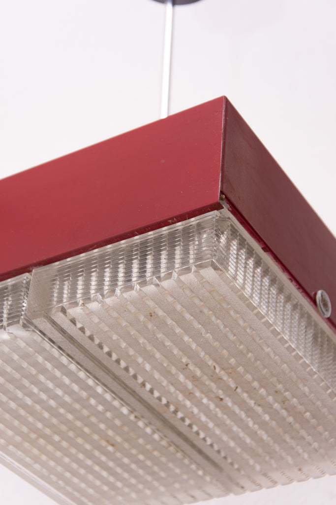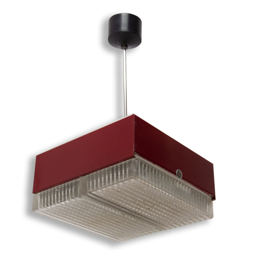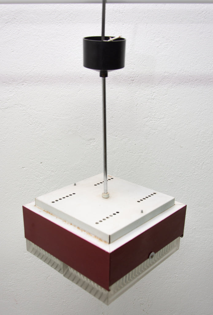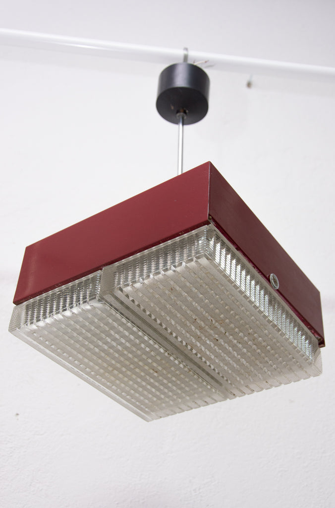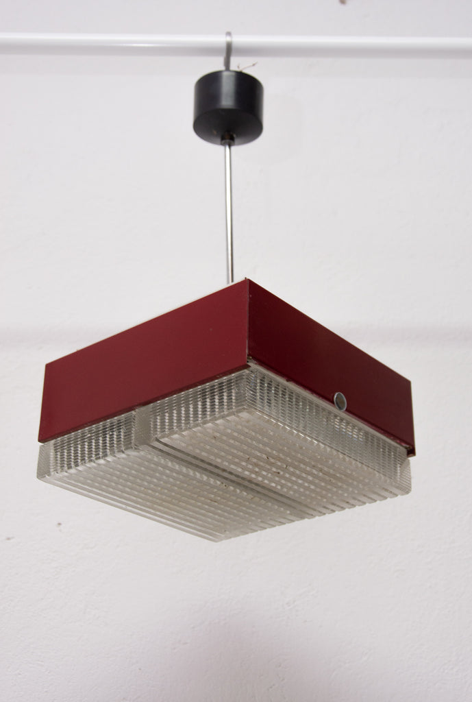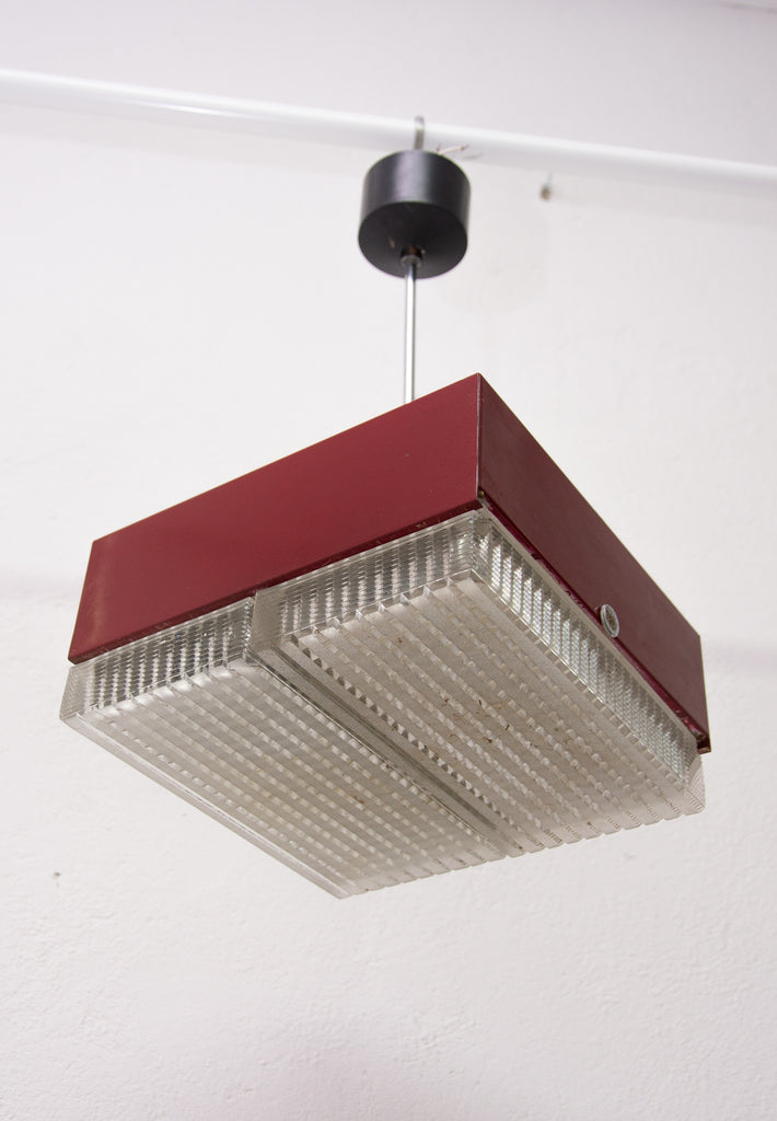 These pendant lamps were designed by Napako company and were made in the former Czechoslovakia in the 1970´s. It features a chromed steel frame and sheet metal and glass shade. The first is dark red and the second one is black. Both in good Vintage condition, bears signs of age and using, newly wired. Price is for the pair.