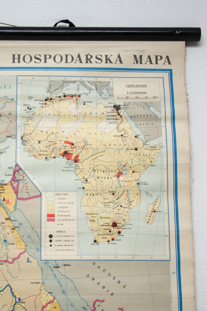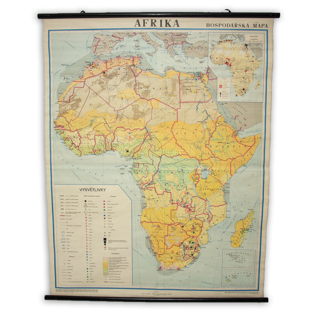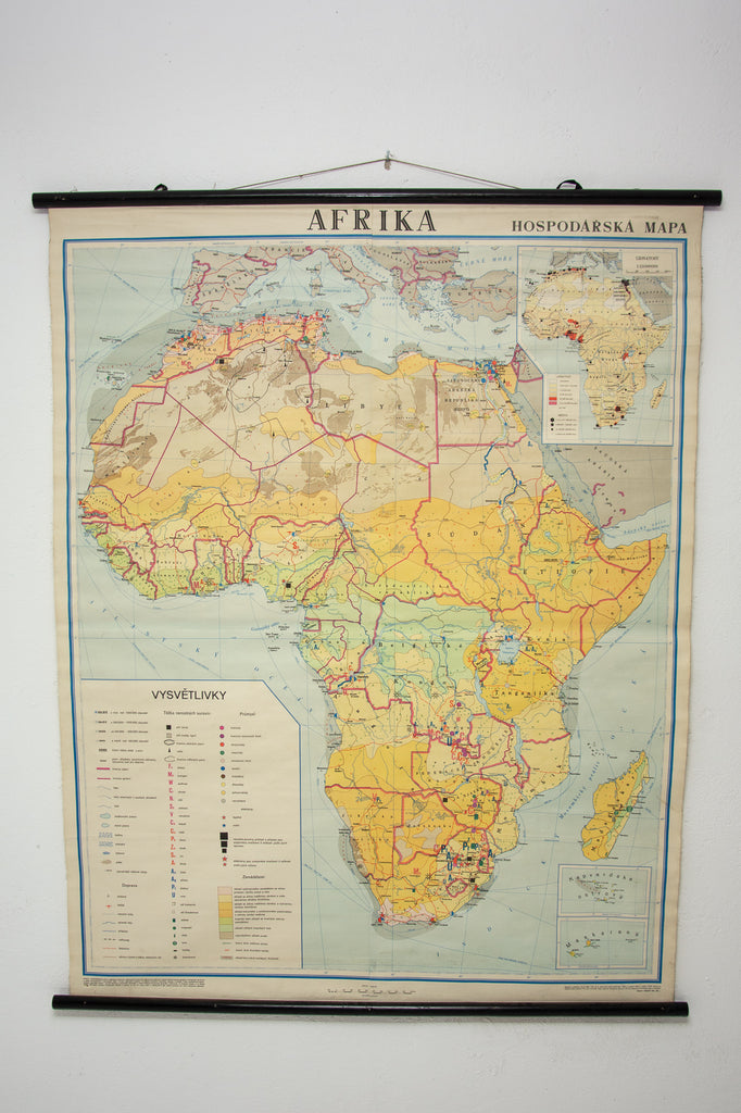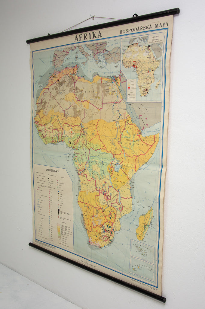 Old Vintage school paper economic map of Africa. It was produced in 1959 in the former Czechoslovakia. Map has on top and bottom wooden slats. It´s in good Vintage condition, bears signs of age and use.