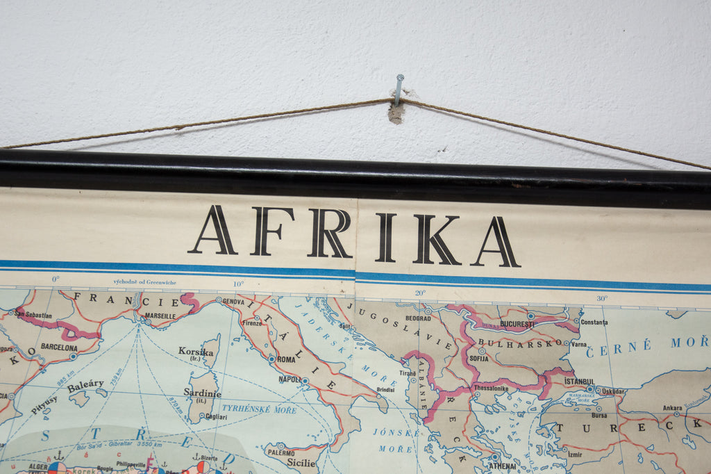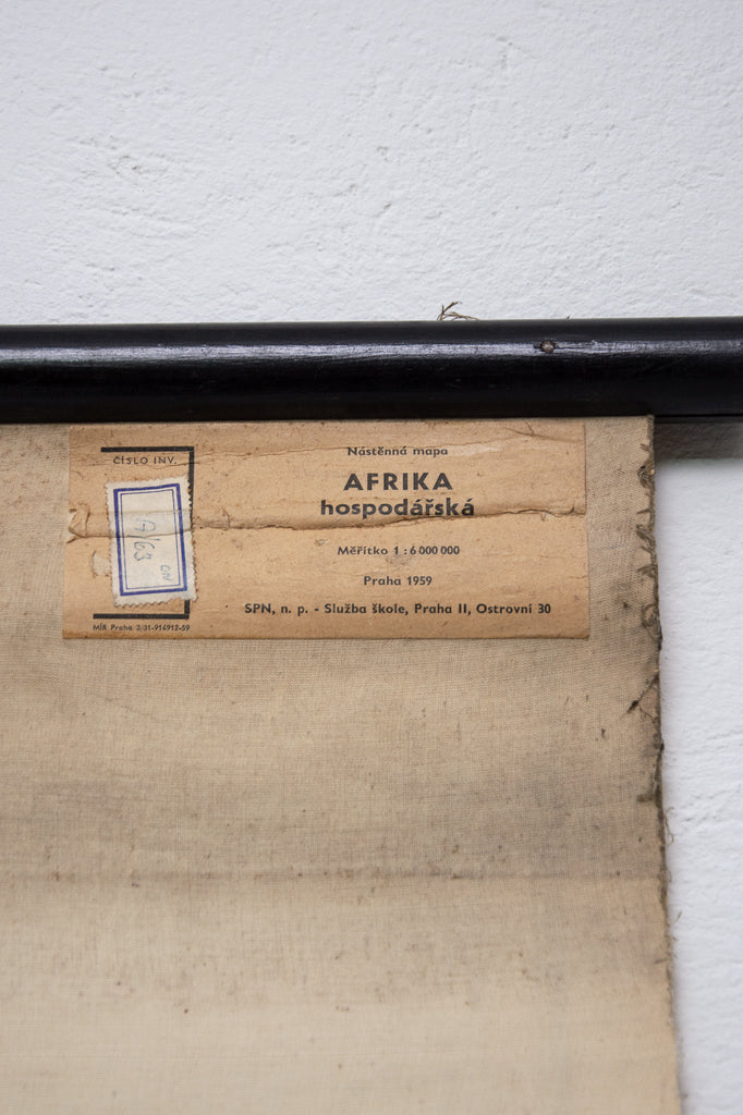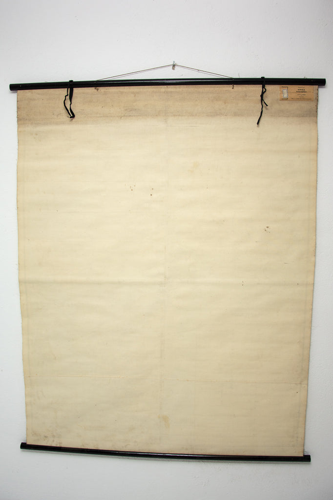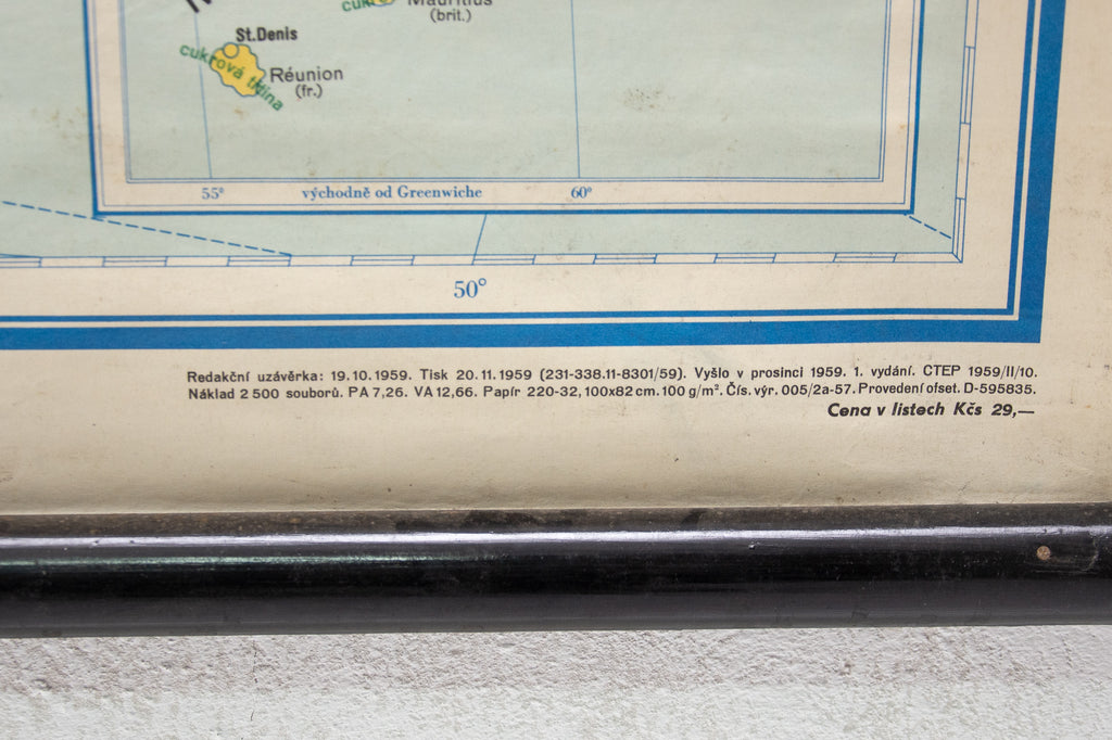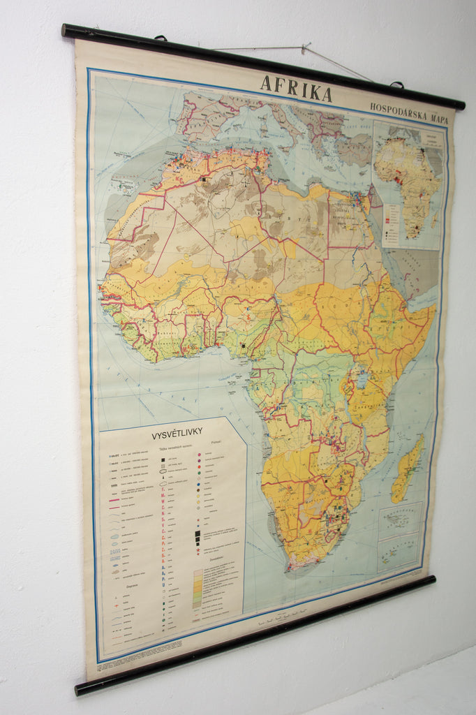 Old Vintage school paper economic map of Africa. It was produced in 1959 in the former Czechoslovakia. Map has on top and bottom wooden slats. It´s in good Vintage condition, bears signs of age and use.