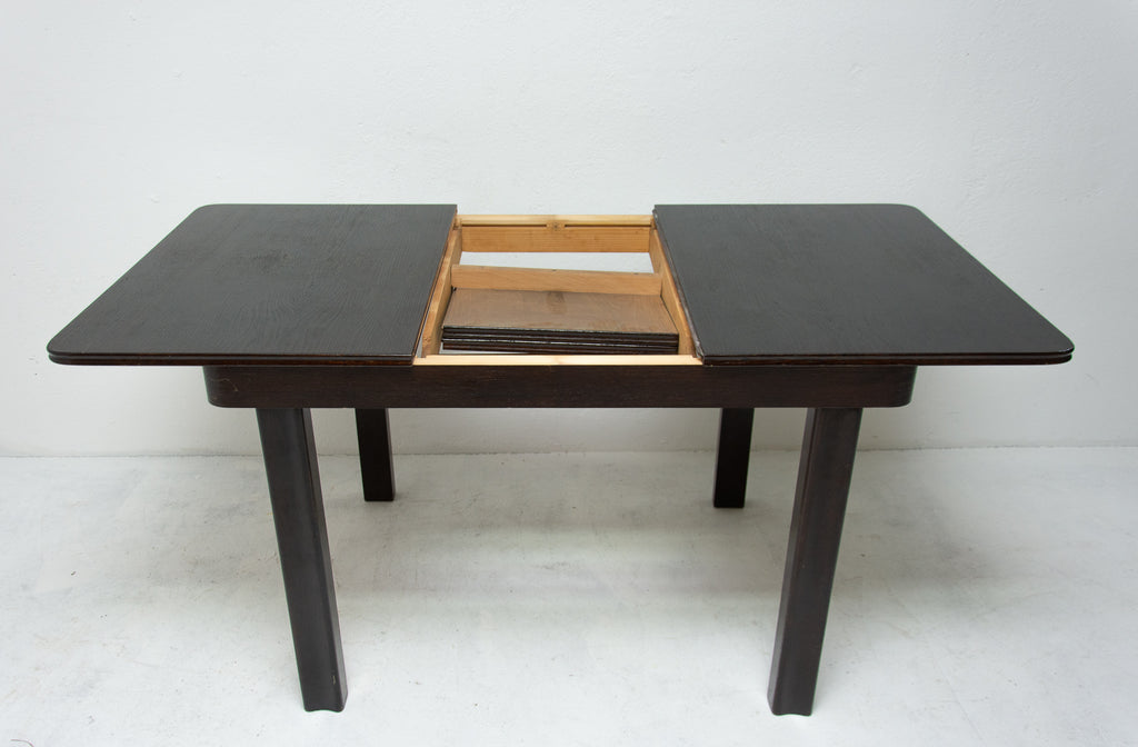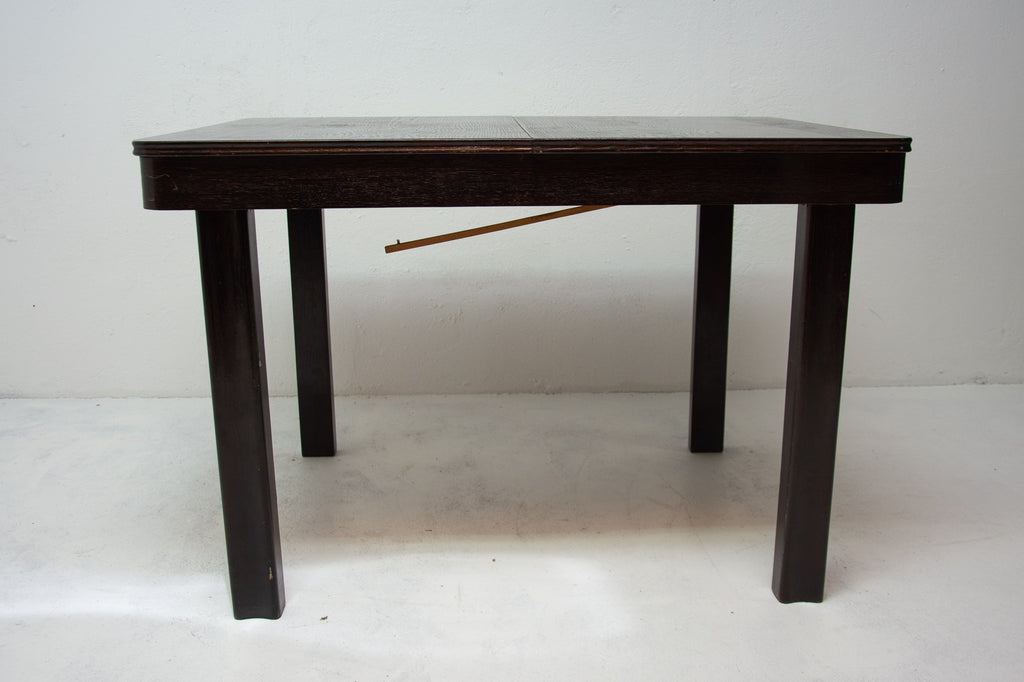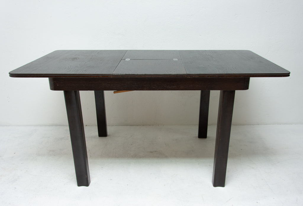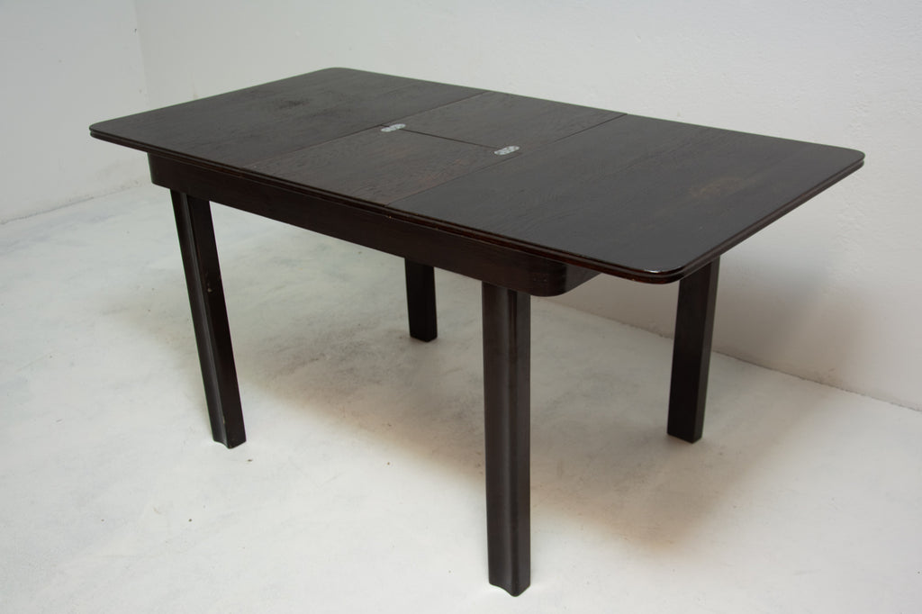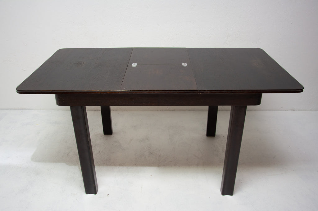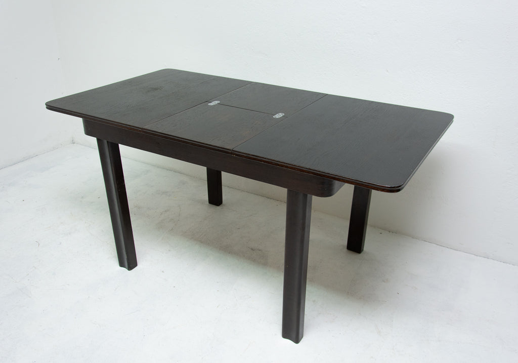This adjustable dining table was designed and made in the 1950s in the former Czechoslovakia. It was designed probably by Jindrich Halabala. The material is a combination of solid wood and oak veneer. The table is in good Vintage condition, bears signs of age and using.