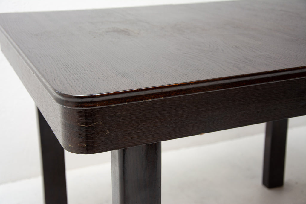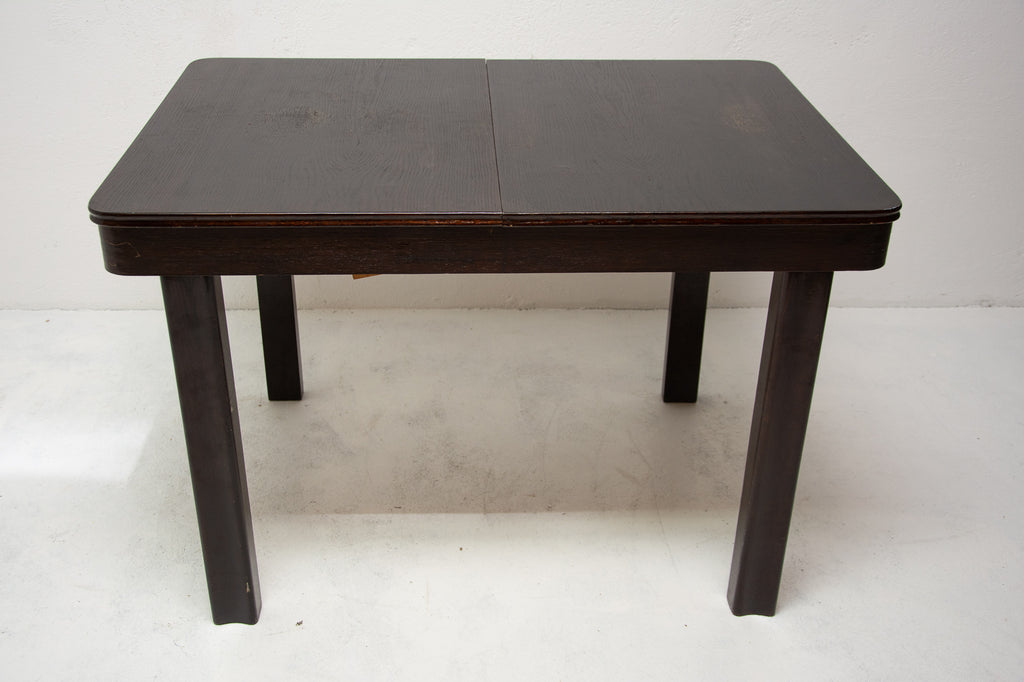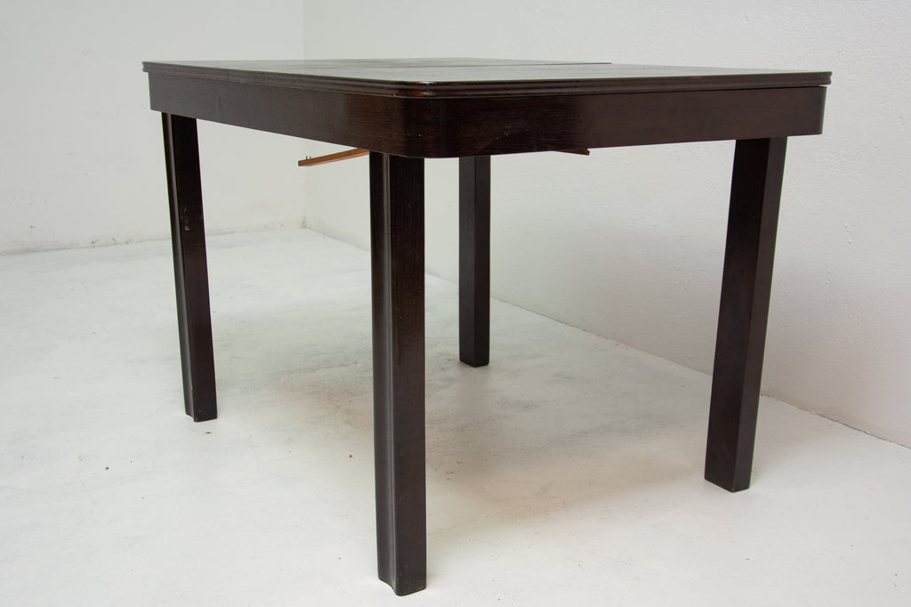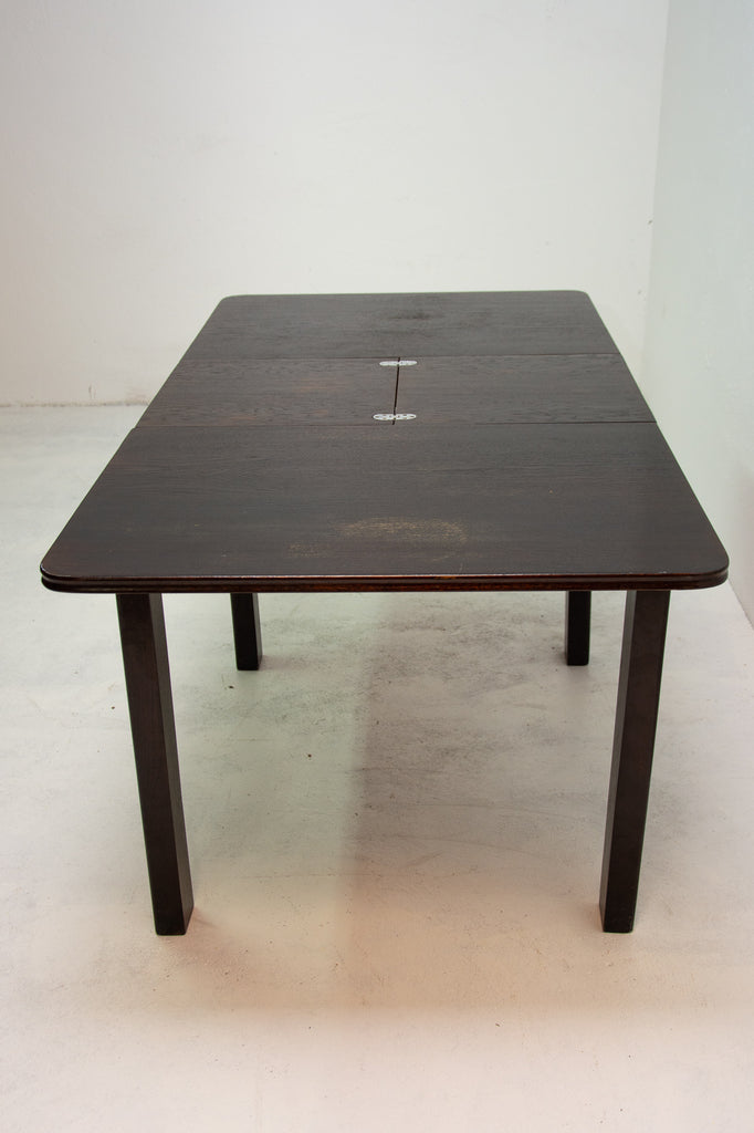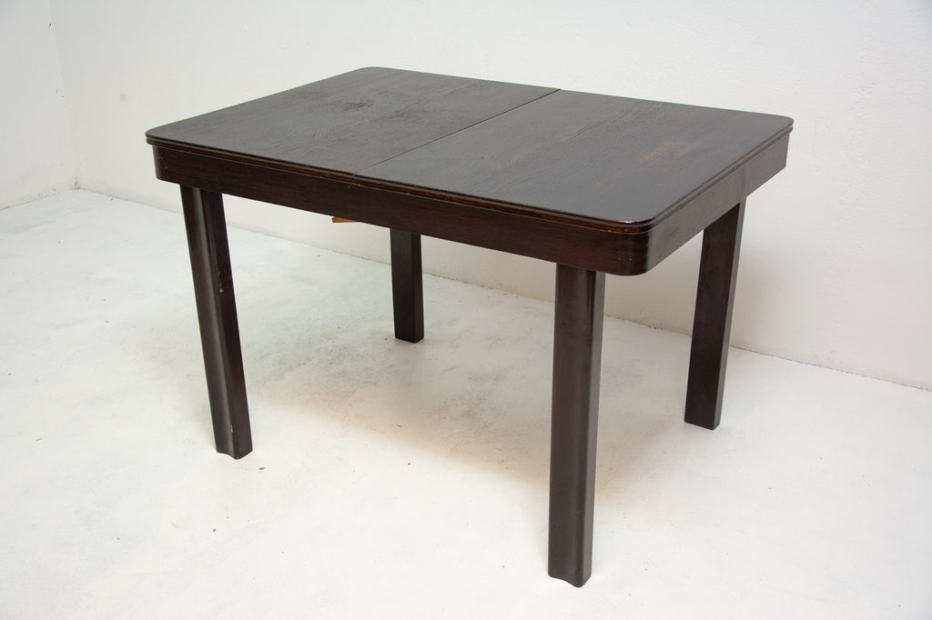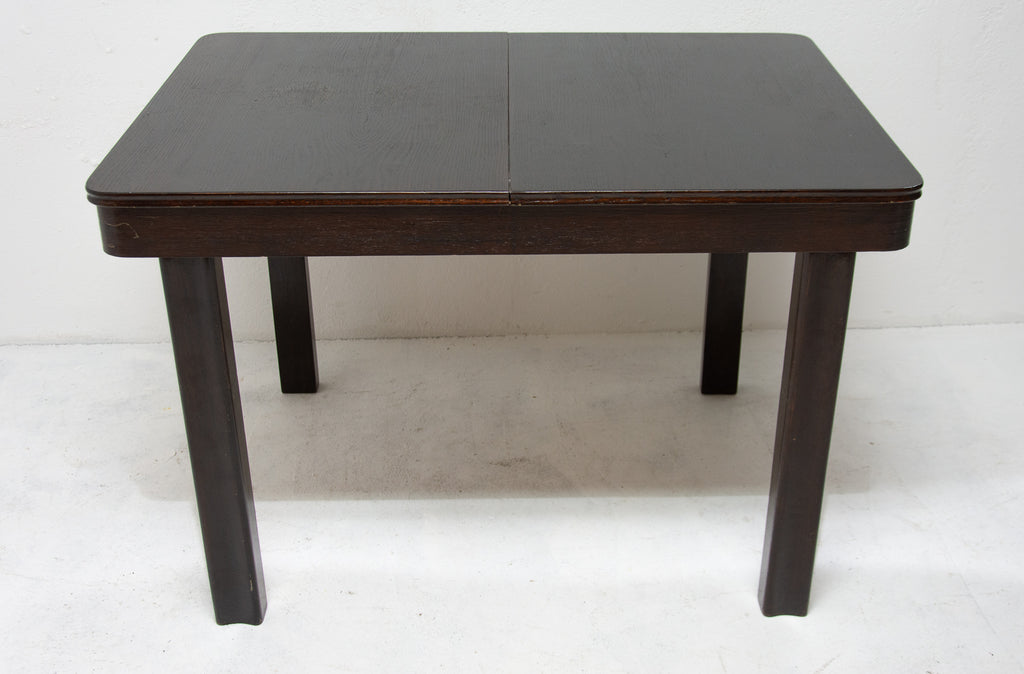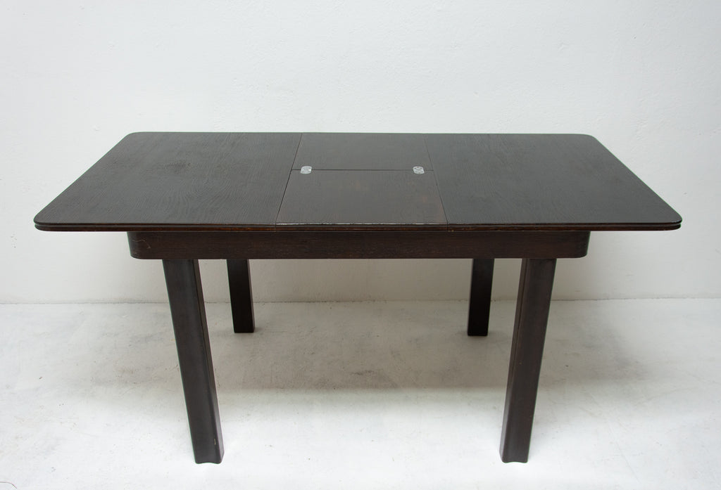 This adjustable dining table was designed and made in the 1950s in the former Czechoslovakia. It was designed probably by Jindrich Halabala. The material is a combination of solid wood and oak veneer. The table is in good Vintage condition, bears signs of age and using.
