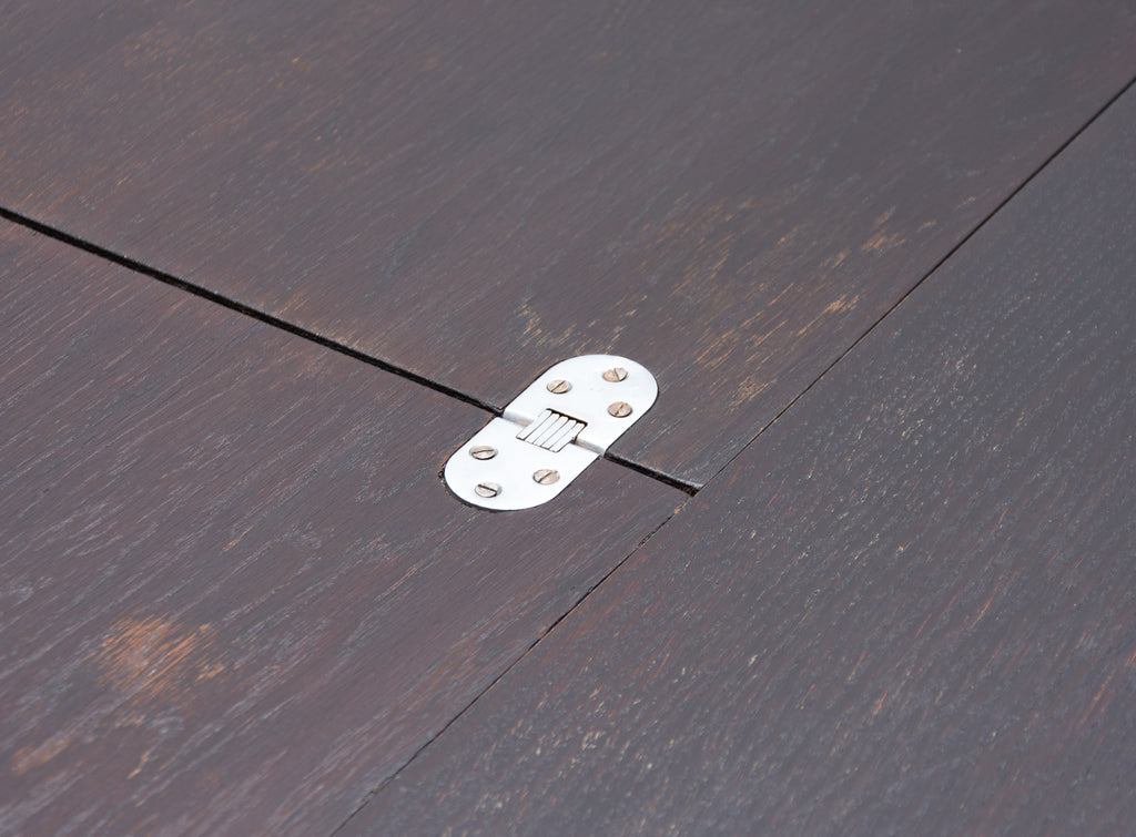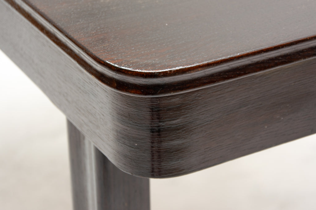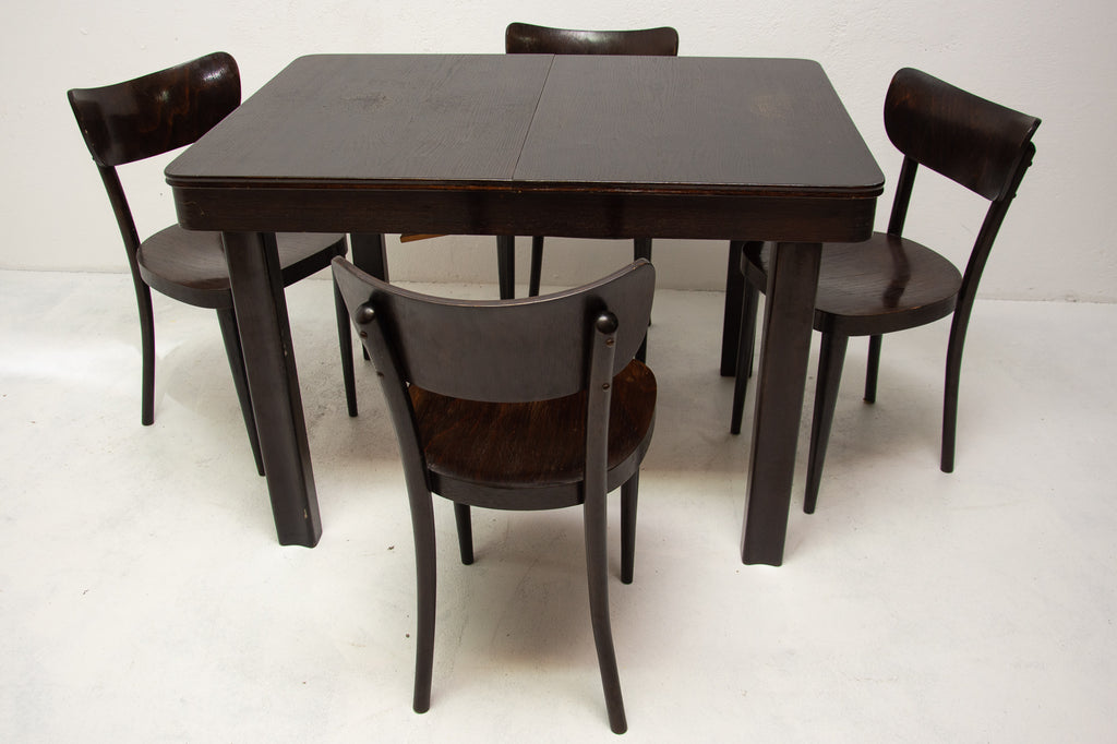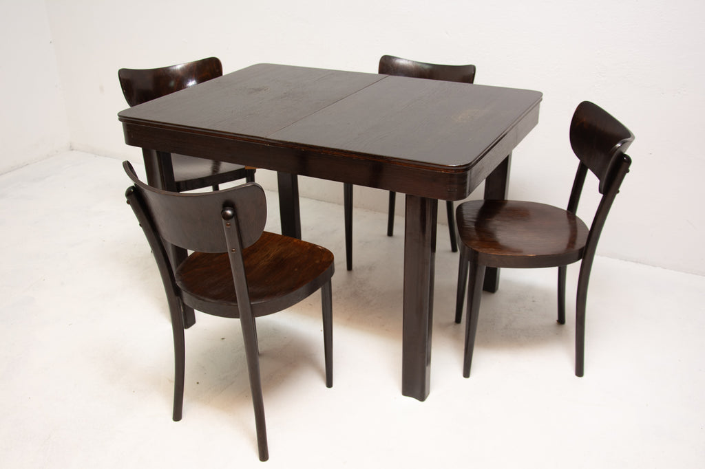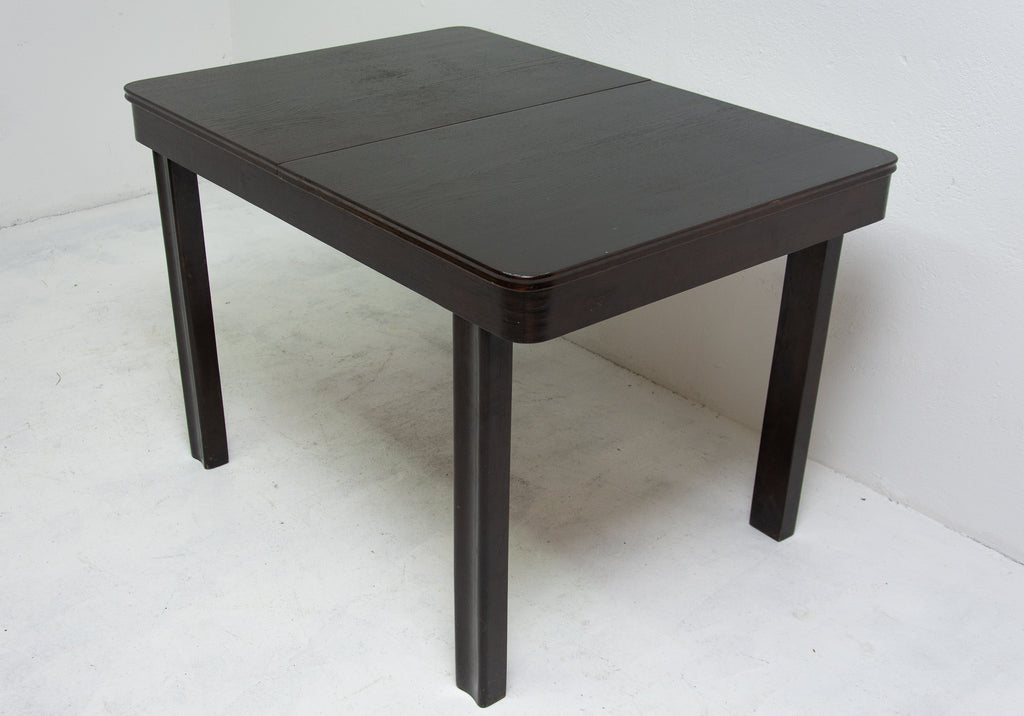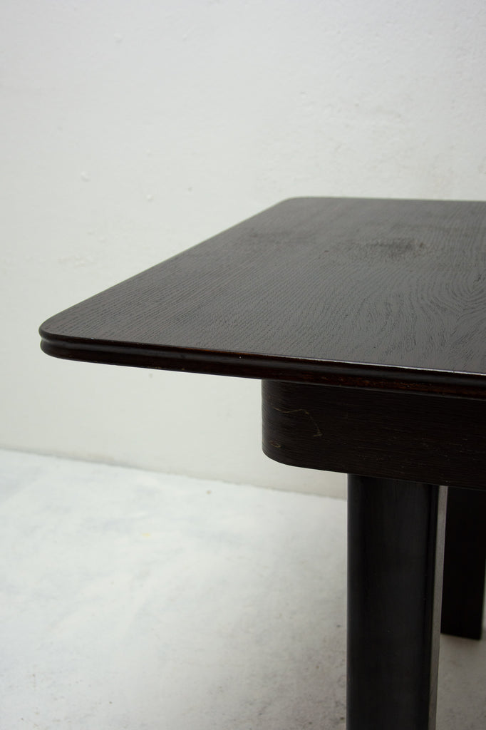 This adjustable dining table was designed and made in the 1950s in the former Czechoslovakia. It was designed probably by Jindrich Halabala. The material is a combination of solid wood and oak veneer. The table is in good Vintage condition, bears signs of age and using.