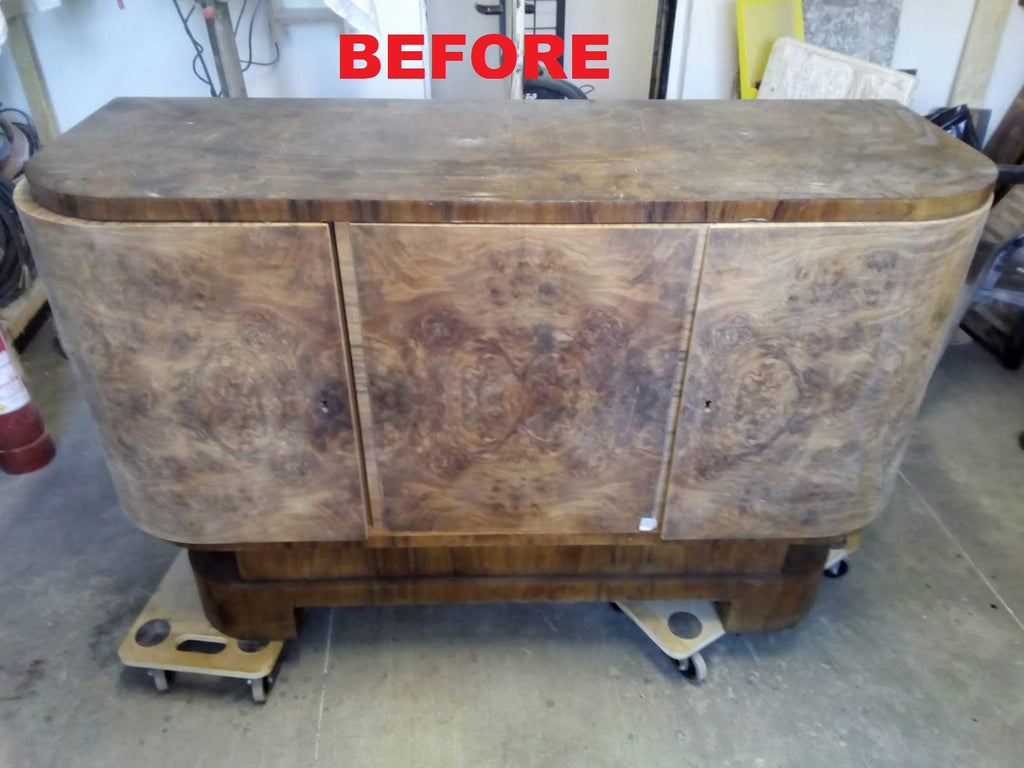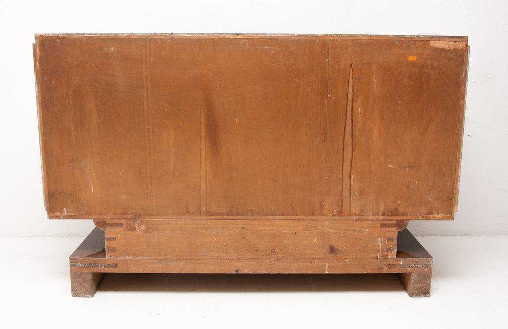 This oval liquer bar or sideboard was made in Bohemia in the 1930s. It´s an example of Central European Art Deco and is made of solid wood and veneered in walnut. It features a large storage space. The cabinet can be also used as a TV table etc. It´s in excellent condition, fully restored to a high gloss finish with polyurethane.