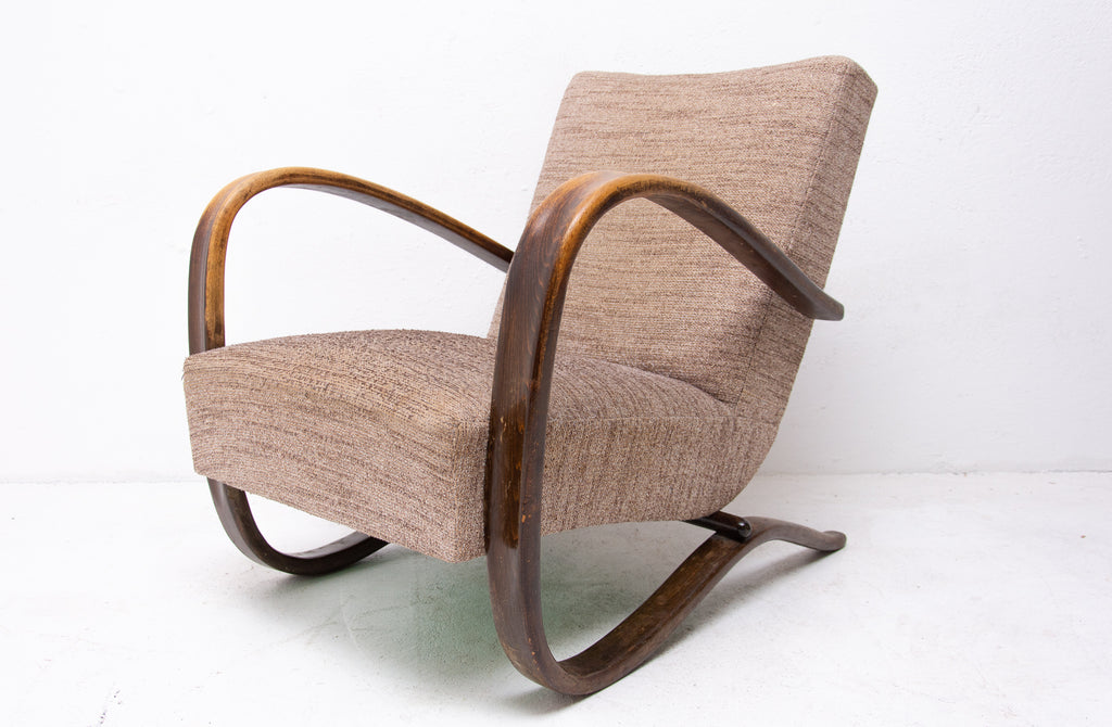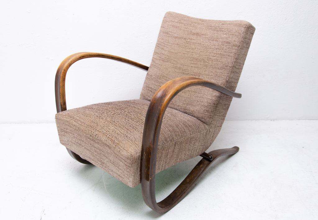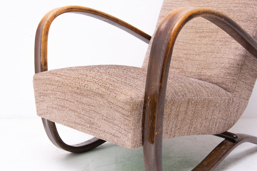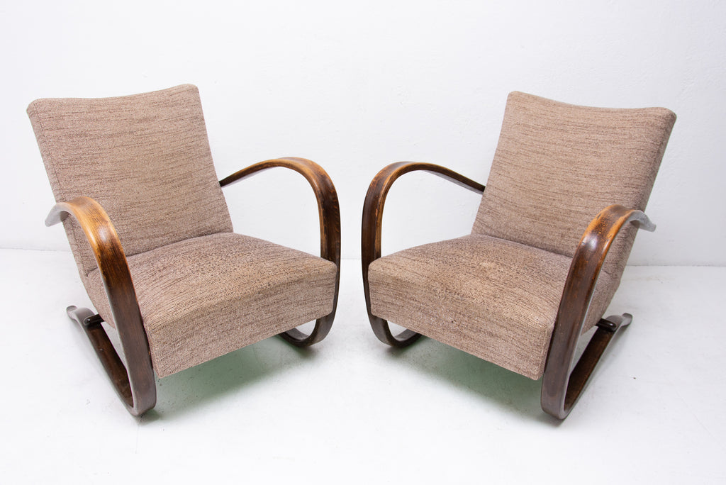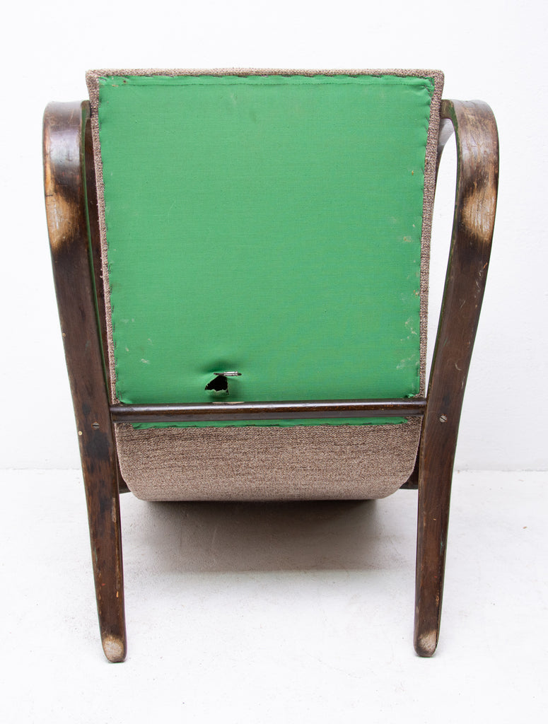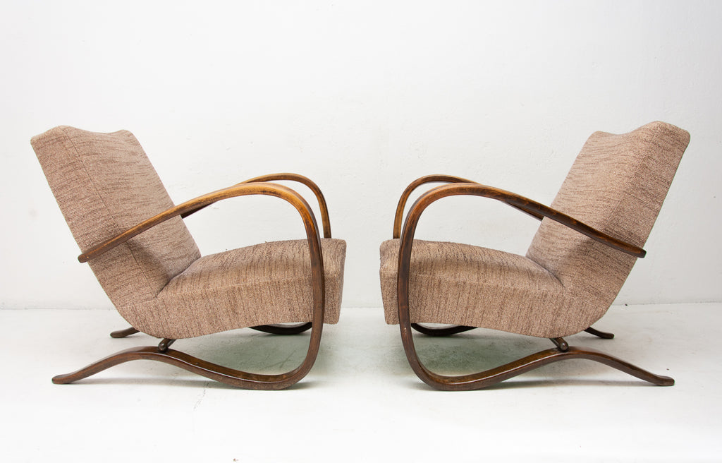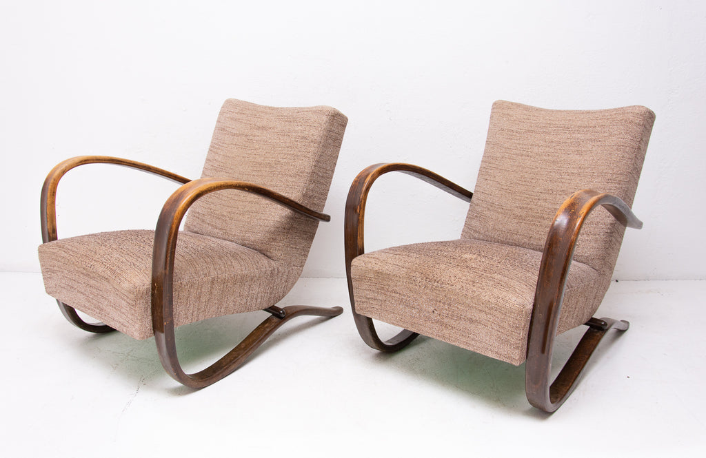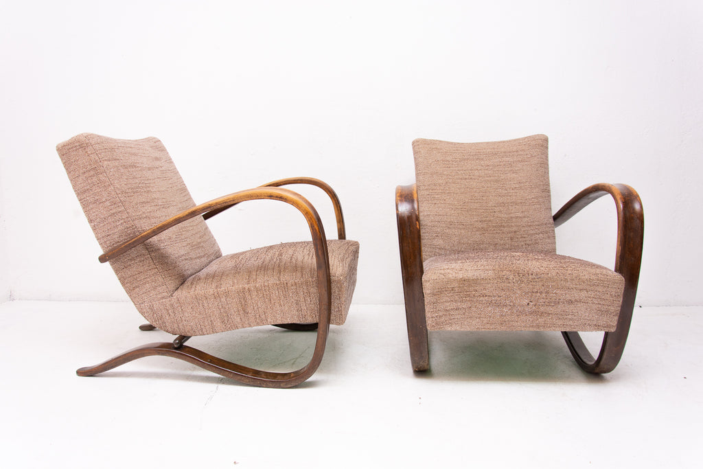A pair of famous Art Deco ebonized bentwood armchairs by Jindrich Halabala, model H-269 from the 1930s. These armchairs were made in the 1940´s. The wooden armrests are in very good Vintage condition without cracks etc. Upholstery including fabric has been replaced in the past. Bears signs of use (slight abrasions on the seats), but overall is in good condition, just needs cleaning, there are spots on the seats. These armchairs are generally in its very good Vintage condition, bearing signs of age and using. We recommend a new fabric.