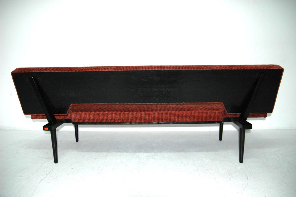 Mid century adjustable sofa-bench designed by the Czech famous designer Miroslav Navrátil in the 1960´s. Made in Czechoslovakia. It features wery attractive and simple design. Material: fabric, beechwood. It´s a typical example of Czechoslovak design after the huge success of the Czechoslovak pavilion at Expo 58 in Brussels. The bench is fully refurbished including new upholstery, the back and legs are painted in black lacquer. In excellent condition.